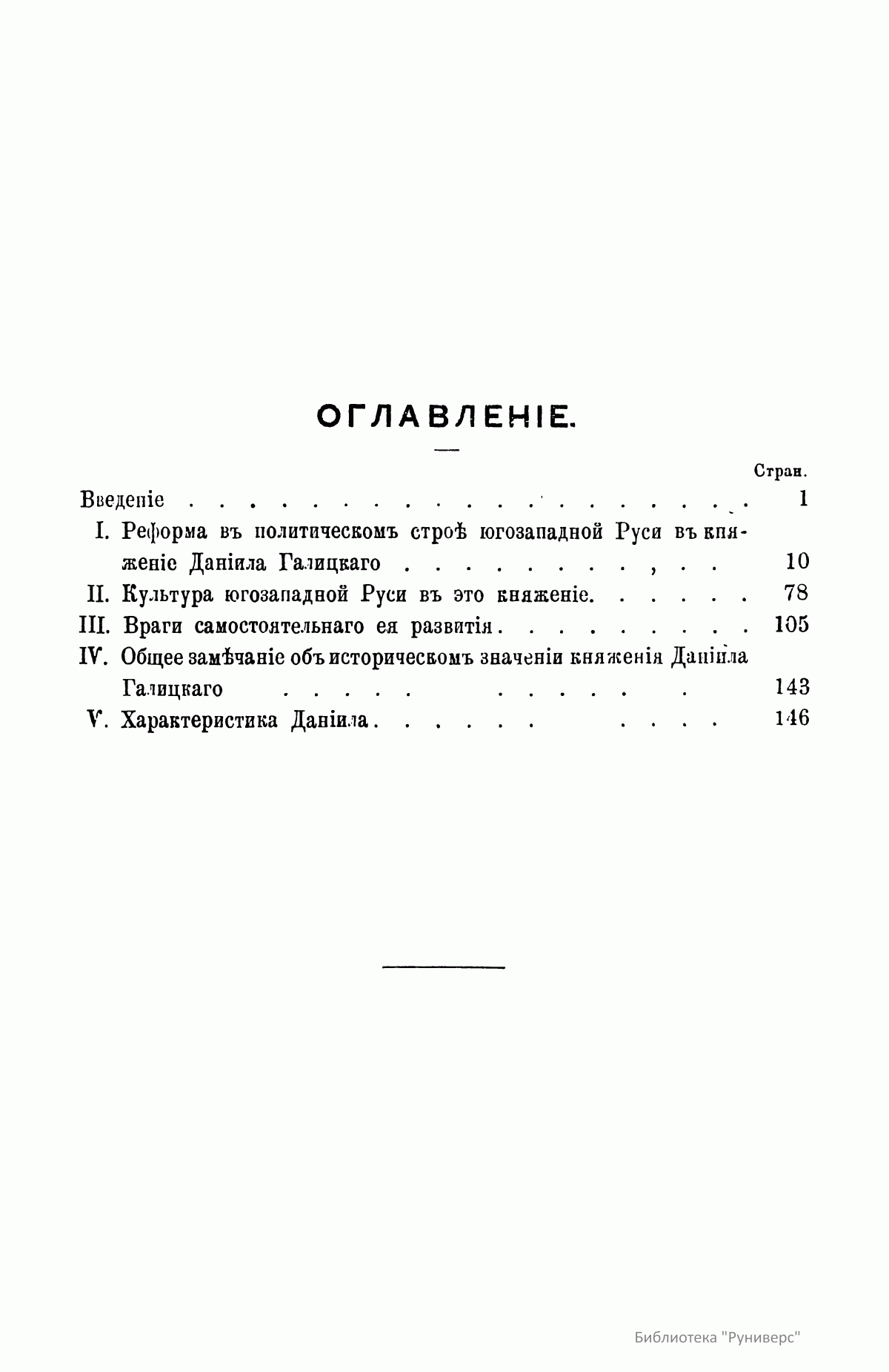 В книге опубликовано сочинение студента историко-филологического факультета Киевского университета св. Владимира, удостоенное золотой медали. Задача настоящего труда – указать и объяснить посредством сравнительно-исторического изучения русских и иностранных источников «замечательные явления» княжения Даниила Галицкого (1201 – 1264), которыми определяется историческое значение этого княжения. При Данииле значительная по объему юго-западная часть Руси отделилась от прочих русских земель и начала жить особенной жизнью. Она значительно окрепла, благодаря тому, что представляла собой на время как бы одно целое. Единение это долго не продолжалось, но важно было то, что юго-западная Русь сосредоточилась в руках меньшего числа лиц, принадлежавших одному роду. Княжение Даниила отсрочило на целое столетие падение юго-западной Руси и тягости чужеземного ига. Существуя в течение целого столетия после татарского нашествия, юго-западная Русь отвлекала внимание Литвы от востока, принимала на себя ее удары и давала возможность Москве крепнуть, в то время как Псков и Новгород не допускали к Москве ливонцев.