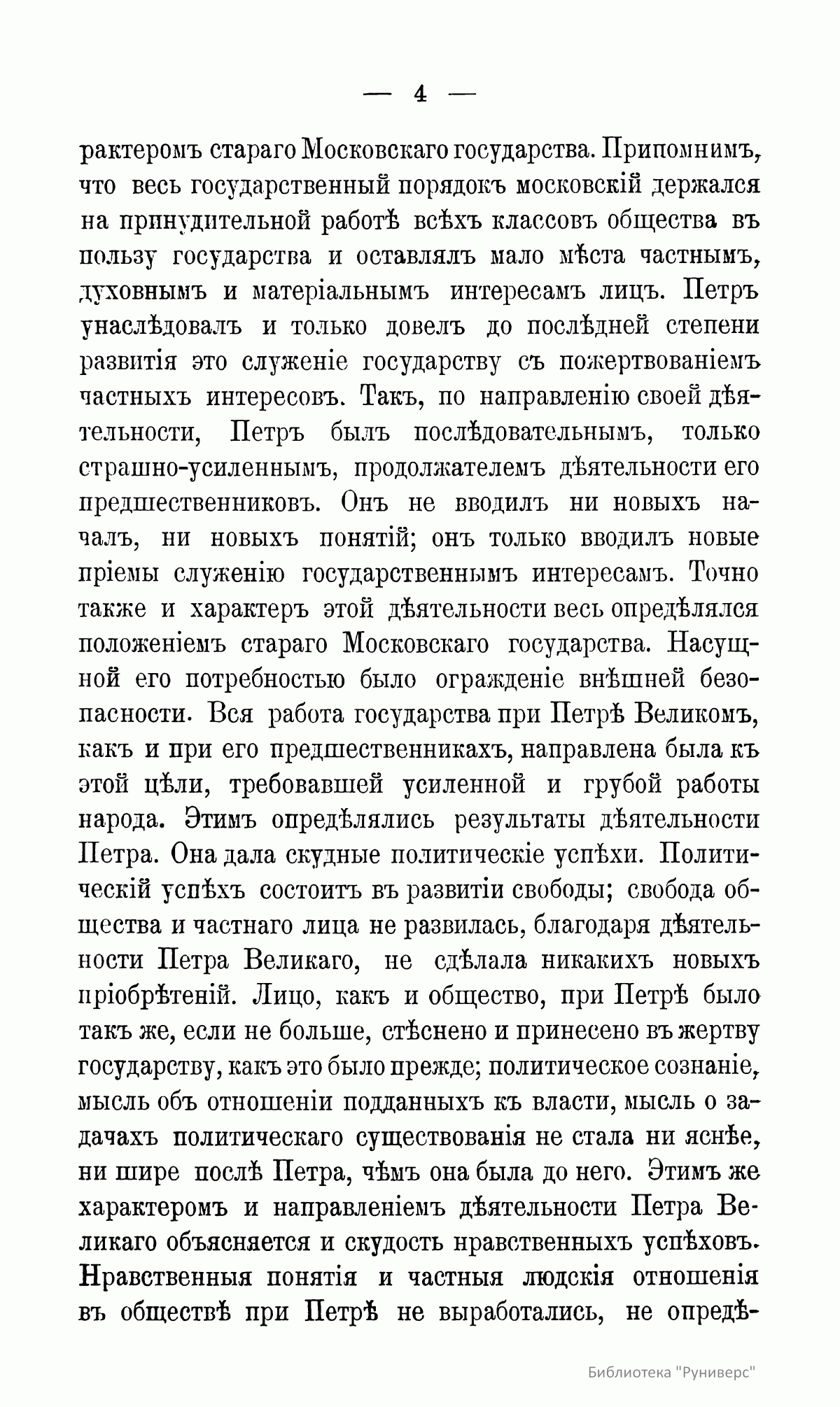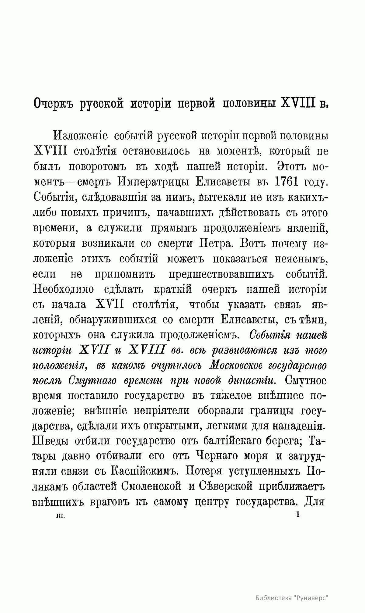 Настоящие лекции – общий курс истории России, в котором В. О. Ключевский изложил свою концепцию исторического развития России. Ученый полагает, что цель изучения местной истории такая же, как цель изучения человеческой истории вообще. Предмет всеобщей истории – это процесс человеческого общежития. Это общежитие слагается из взаимодействия различных общественных элементов, сил, строящих человеческое общество. Эти силы: природа и люди, лицо и общественный союз, власть и право, труд и капитал, знание и искусство и т.д. Эти силы присутствуют в каждом обществе, но общество, ими созидаемое, в разные времена и в различных местах выходит не одинаковым по своему характеру и своим формам. Это происходит оттого, что перечисленные общественные силы в разных местах и разные времена приходят не в одинаковые сочетания. Чем более разнообразные сочетания элементов мы изучаем, тем более узнаем новых свойств в общественных элементах, тем полнее познаем природу каждого из них. Путем исторического изучения мы познаем не только природу общественных элементов, но и их механизм, узнаем, когда известная общественная сила двигала человечество вперед и когда задерживала его движение, когда, например, капитал уничтожал свободный труд, не усиливая его производительности, и когда, наоборот, этот капитал помогал труду стать более производительным, не порабощая его. Таким образом, в курсе истории России В. О. Ключевского интересуют прежде всего следующие вопросы: какие своеобразные местные сочетания представляет данная история отдельного народа, как возникали эти своеобразные сочетания, какие новые свойства обнаруживали действующие в ней стихии. В своем изложении он ограничивается фактами экономической и политической жизни и делит историю на периоды, соответствующие изменениям отношений между основными общественными элементами. Первая часть включает три периода. Первый период продолжается с VIII до конца XII века, когда масса русского населения сосредоточивалась на среднем и верхнем Днепре с его притоками и историческим его водным продолжением областью Ловати-Волхова. Второй период – это время Верхне-Волжской удельной Руси с конца XII до половины XV века. Третий период начинается со вступления Иоанна III на княжеский стол в 1462 году и продолжается до 1613 года, когда на московском престоле появляется новая династия Вторая часть включает четвертый период – с 1613 года, когда земский собор выбрал на московский престол царя Михаила Федоровича до 1762 года – перемен в государственном положении дворянства, землевладельческом и служебном. Третья часть включает два отдела. Первый посвящен XVIII веку. Второй включает конец XVIII века и XIX столетие – по царствование Александра II (в приложении говорится об Александре III).