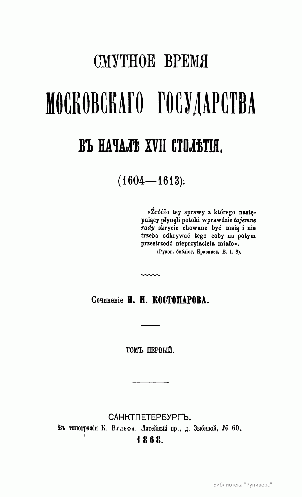 Перед читателем прижизненное издание трудов Н. И. Костомарова, в котором удачно соединялись историк-мыслитель и художник, что обеспечило ему не только одно из первых мест в ряду русских историков, но и наибольшую популярность среди читающей публики. Глубоко вдумываясь, почти вживаясь в изучаемую им старину, он воспроизводил ее в своих работах такими яркими красками, в таких выпуклых образах, что она надолго оставалась в памяти читателя. В первых трех томах и в двенадцатом томе опубликованы различные статьи. 1 – «Мысли о федеративном начале древней Руси»; «Черты народной южнорусской истории»; «Две русские народности»; «Мистическая повесть о Нифонте. Памятник русской литературы»; «Легенда о кровосмесителе»; «О значении Великого Новгорода»; «Должно ли считать Бориса Годунова основателем крепостного права?»; «Великорусские религиозные вольнодумцы в XVI веке. – Матвей Башкин и его соучастник Феодосий Косой»; «Иван Сусанин. Историческое исследование». 2 – «Иван Свирговский, украинский казацкий гетман XVI века»; «Гетманство Выговского»; «Бунт Стеньки Разина»; «По поводу мыслей светского человека, о книге «Сельское духовенство». 3 – «Куликовская битва»; «Ливонская война»; «Южная Русь в конце XVI века»; «Литовская народная поэзия»; «Об отношении русской истории к географии и этнографии». 12 – «Начало единодержавия в Древней Руси»; «Гетманство Юрия Хмельницкого»; «Церковно-историческая критика в XVII веке»; «История раскола у раскольников»; «Воспоминания о молоканах». Четвертый, пятый и шестой тома посвящены Смутному времени московского государства в начале XVII столетия. Седьмой и восьмой – истории Новгорода, Пскова и Вятки во время удельно-вечевого уклада. Девятый, десятый и одиннадцатый – Богдану Хмельницкому.