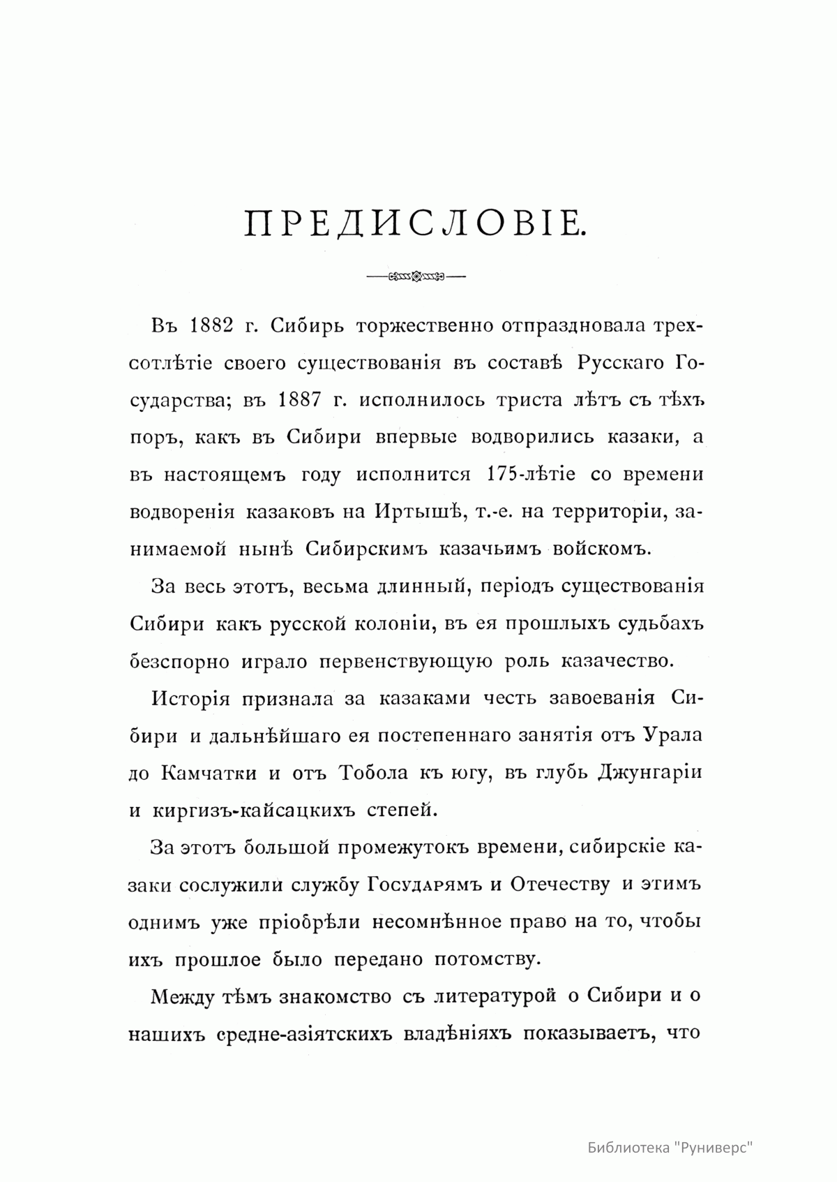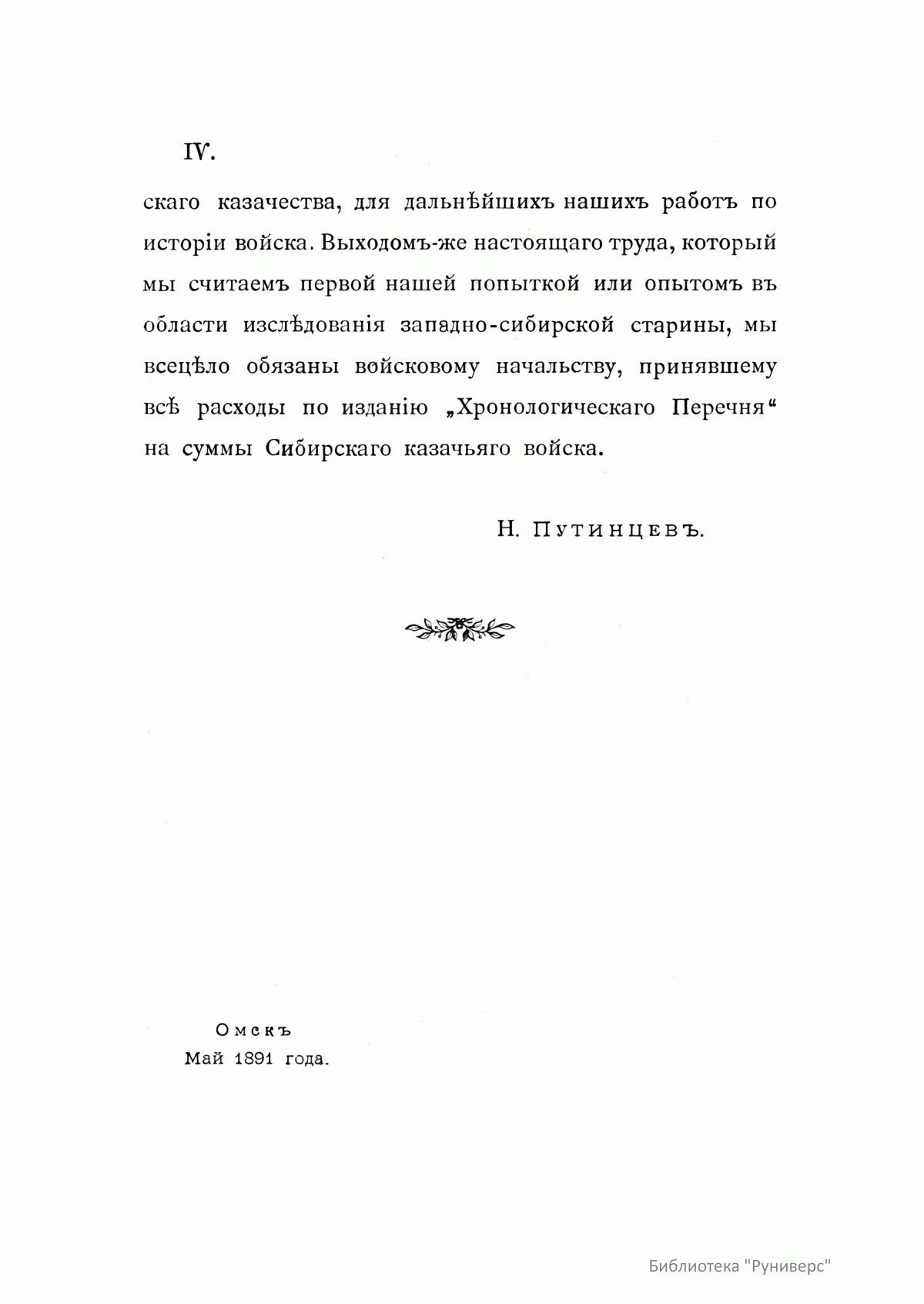 Предлагаемое издание представляет собой хронологическое описание жизни казаков Сибирского линейного войска с момента его образования. Автор этого единственного в своем роде труда — Путинцев Николай Григорьевич (1860–?) — есаул Сибирского казачьего войска, командир 5-го казачьего полка, большую часть своей деятельности посвятил исследованию и написанию истории сибирских казаков. Многие годы провел он в войсковых архивах в поисках и изучении документов о появлении казаков в Сибири и становлении казачьего войска, собирал сведения о формировании отдельных войсковых частей, материалы по истории устава и традиций сибирских военных казаков. В результате этого многолетнего труда, в год 175-летия водворения казаков на берегах Иртыша, была опубликована данная работа, где автор подчеркивает особое место Сибирского казачьего войска в истории освоения Россией новых территорий.