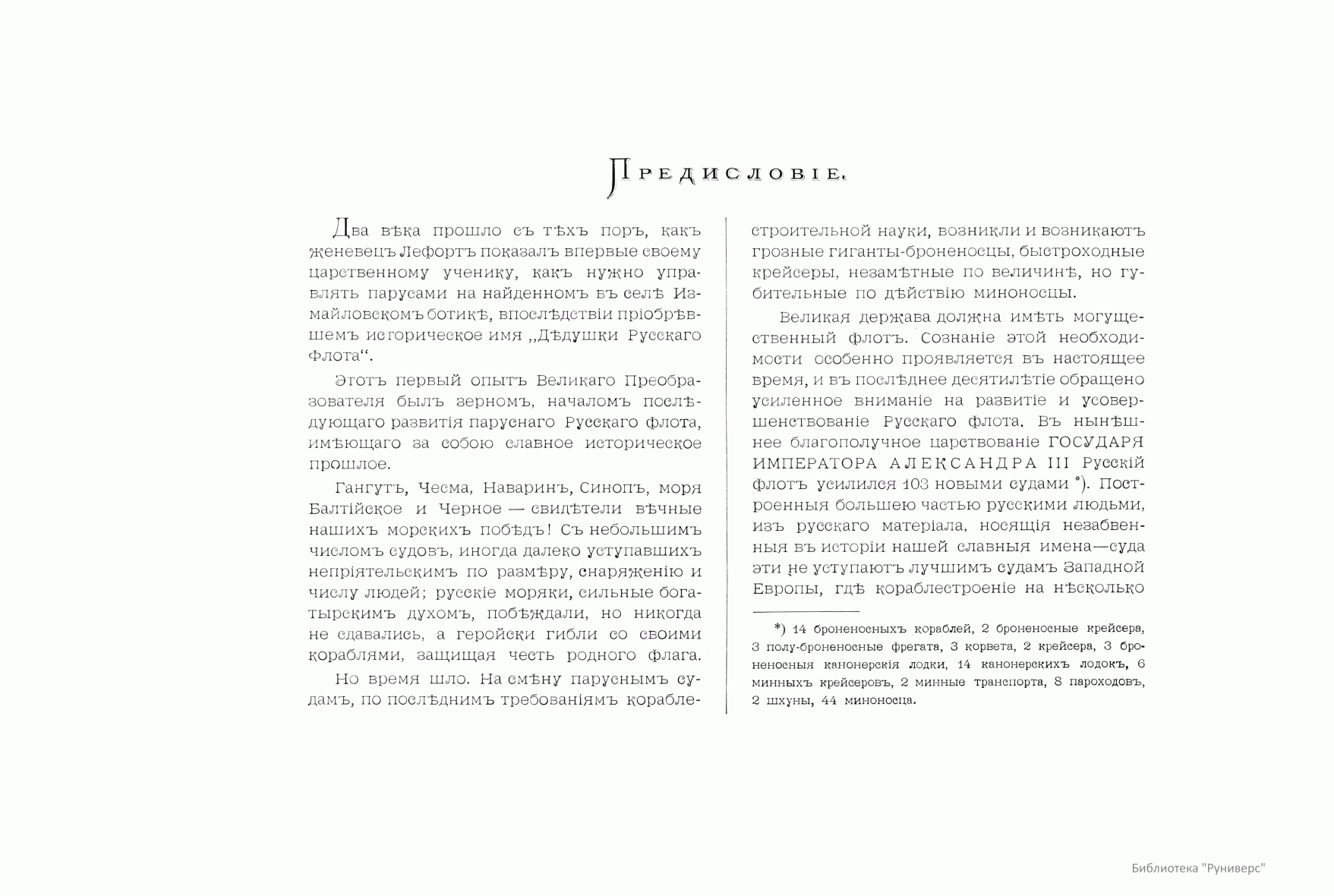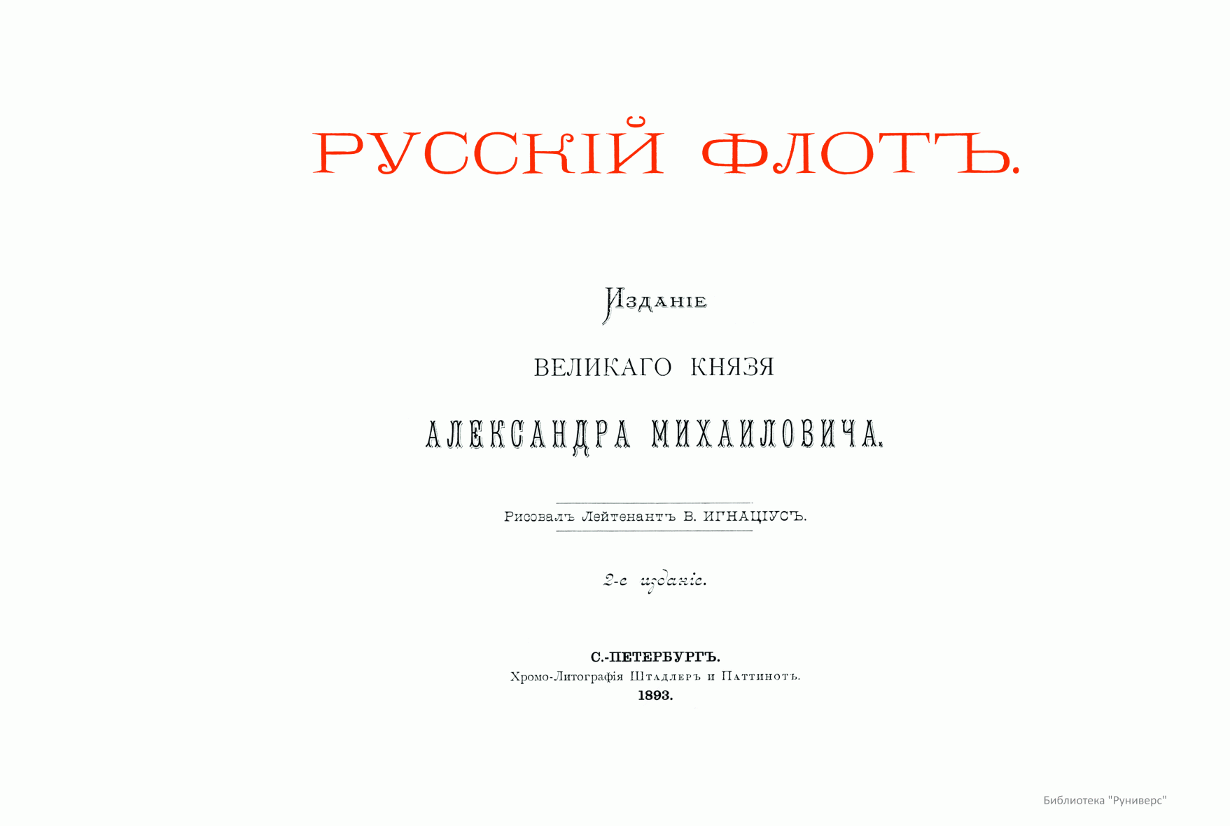 В царствование Александра III русский флот усилился 103 новыми судами. Это 14 броненосных кораблей, два броненосных крейсера, три полуброненосных фрегата, три корвета, два крейсера, три броненосные канонерские лодки, 14 канонерских лодок, шесть минных крейсеров, два минных транспорта, восемь пароходов, две шхуны, 44 миноносца. Настоящий альбом, изданный в 1893 году, представляет типы наличных судов русского флота. Он предназначался «не только для специалистов морского дела, но и для всего образованного русского общества, интересующегося состоянием вооруженных сил своего отечества». Читатель увидит 54 цветных рисунка действовавших в то время судов с технической характеристикой каждого.