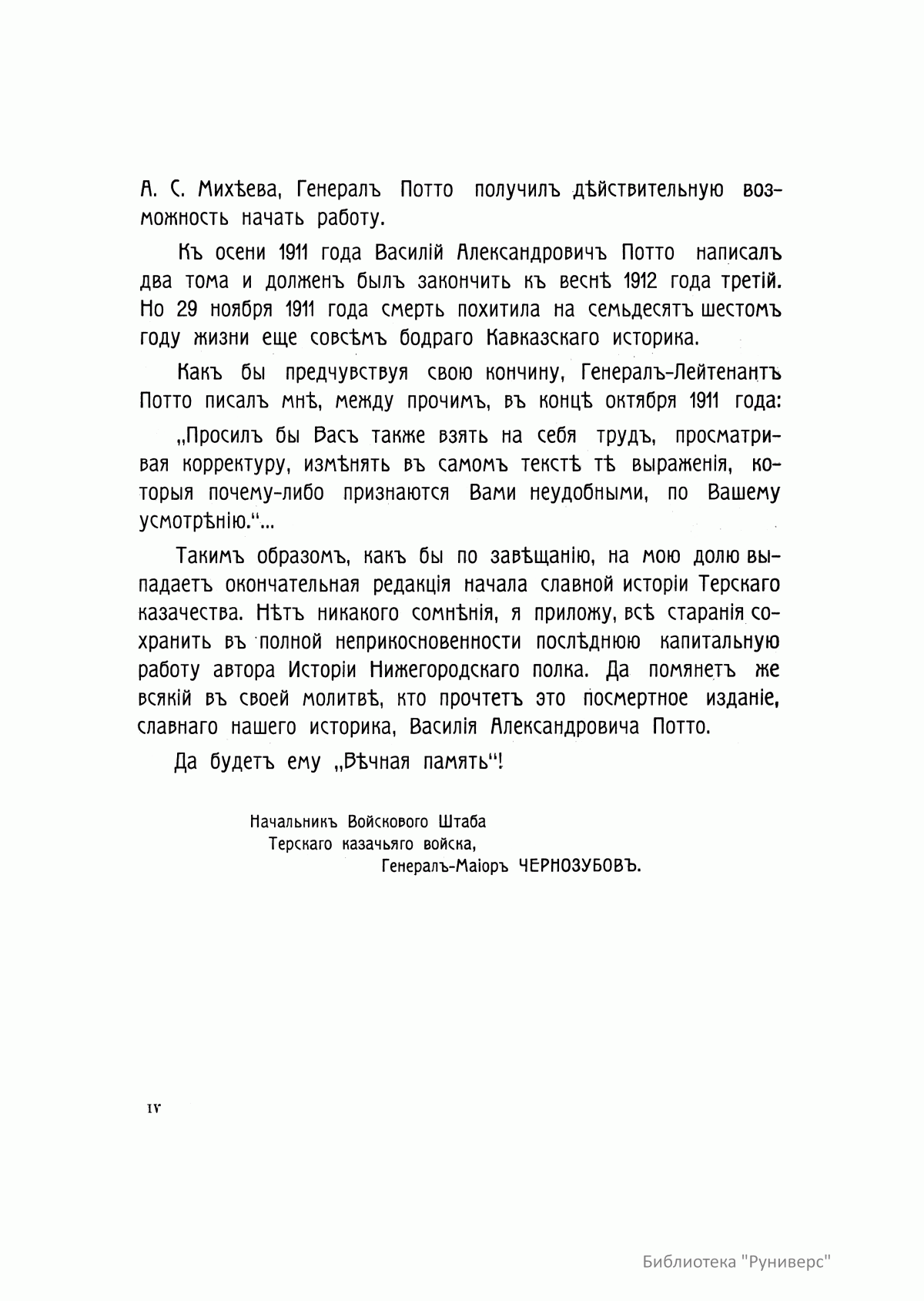 Труды выдающегося русского венного историка, генерал-лейтенанта Василия Александровича Потто (1836–1911), освещающие этапы прихода и становления русской власти в кавказском регионе, историю многолетних кавказских войн и развития казачества, обогатили русскую военную литературу и по праву считаются одними из лучших произведений кавказской тематики. Многие годы В. А. Потто собирал разрозненные документы, военные хроники и архивные материалы, чтобы отобразить общую картину драматических событий, определивших особую роль кавказских войн в истории российского государства. В 1896 г. В. А. Потто был назначен начальником военно-исторического отдела при Штабе Кавказского военного округа, где значительно расширил свою издательскую деятельность. Под его редакцией вышли «Утверждение русского владычества на Кавказе» в 8 томах, «Кавказский сборник», издававшийся в Тифлисе в 1876–1912 гг., «Памятники времен Кавказской войны», «Исторический очерк Кавказских войн от их начала до присоединения Грузии к России». «Два века терского казачества» последнее произведение В. А. Потто. В этом исследовании прослеживается роль терского казачества в истории Российского государства. Автор планировал подготовить трехтомное сочинение, но смерть помешала ему закончить задуманное, и в 1912 г. в свет вышли первые два тома издания.