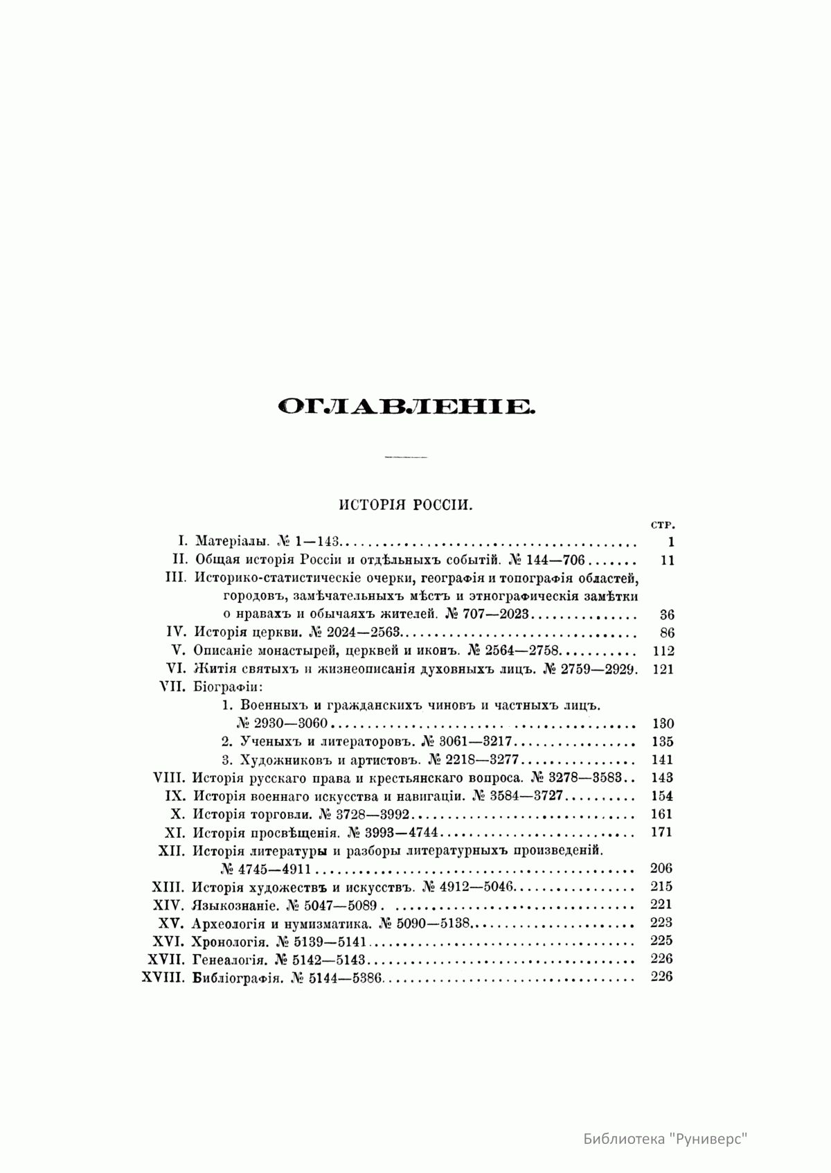 В десяти томах «Русской исторической библиографии» заключается описание свыше 44 000 книг, карт, периодических изданий, статей из журналов и газет по русской и всеобщей истории. Кроме этого, богато представлена литература о Крымской войне 1853–1856 гг., реформе 1860-х гг., польском восстании 1863–1864 гг. и о других событиях.