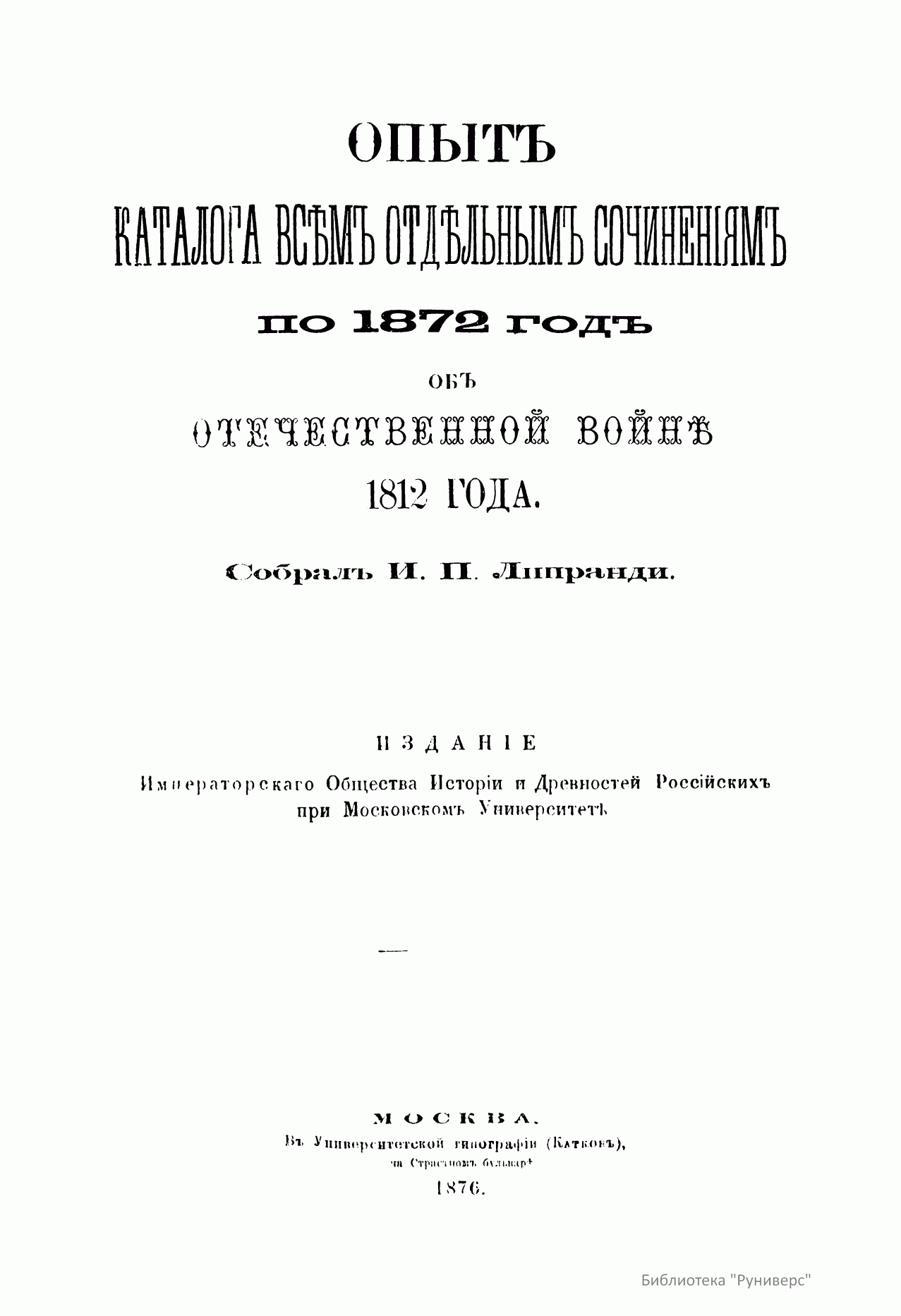 Настоящий каталог – издание Общества истории и древностей российских при Московском университете. Он включает перечень 394 русских и 680 иностранных печатных сочинений об Отечественной войне 1812 года, изданных до 1872 года, и является ценным пособием для историографа.