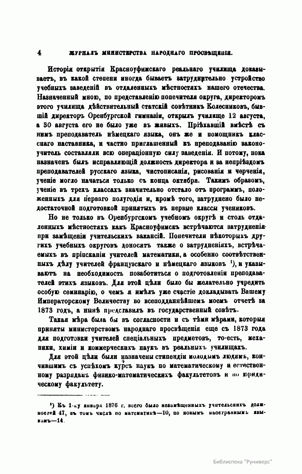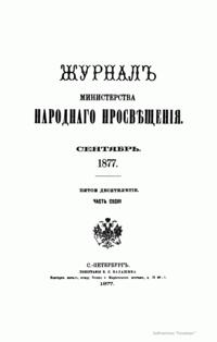 Журнал Министерства народного просвещения выходил с 1834-го по 1917 год. Официальный периодический журнал об успехах просвещения в России. Издатели журнала уверены в том, что «если для каждого человека необходим выход из грубой тьмы невежества и беспрерывное дальнейшее движение к свету, то для народов необходимо попечительное участие правительства в образовании. Только правительство имеет все средства знать и высоту успехов всемирного образования, и настоящие нужды Отечества».