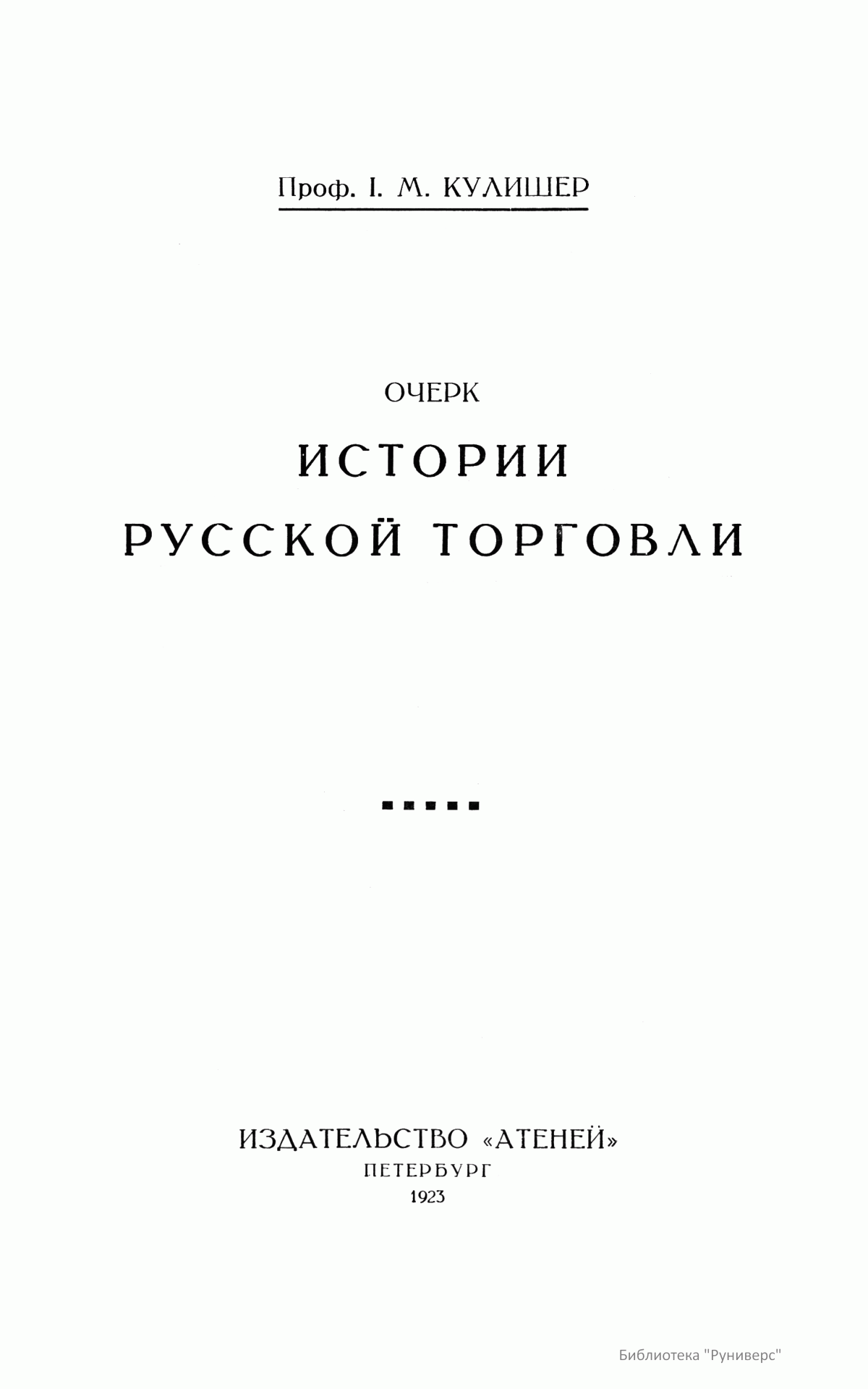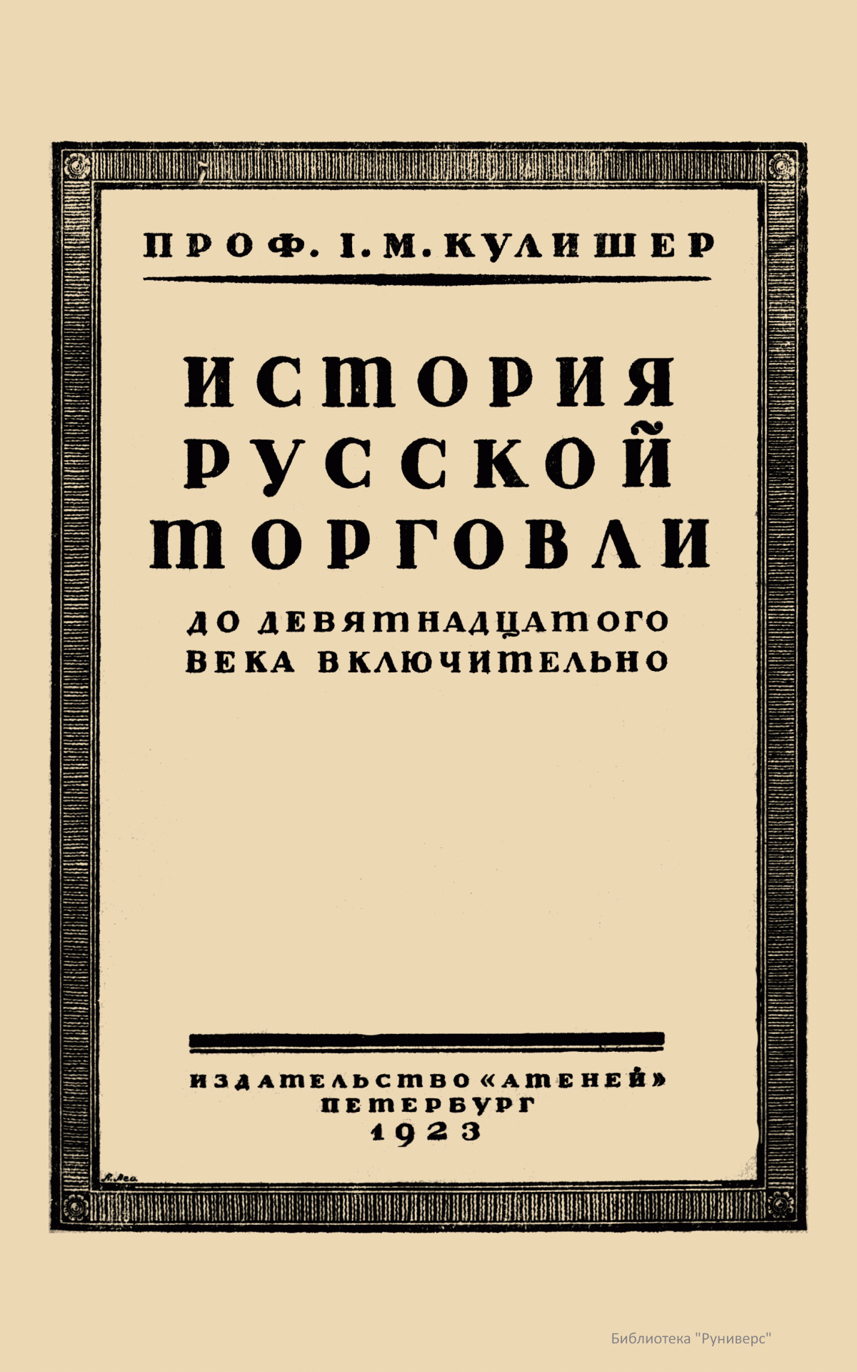 Научный труд профессора И. М. Кулишера «Очерк истории русской торговли» вышел в 1923 г. в Петербурге в издательстве «Атеней». В книге подробно исследуется развитие торговли в России с древнейших времен до начала XX столетия. Автор использовал литературу по русской истории, истории права и истории торговли, многочисленные отечественные и иностранные источники. Ссылаясь на собственные «Лекции по истории экономического быта Западной Европы» шестого издания, он проводил параллели между развитием русской торговли и торговли в иностранных государствах. Все сочинение разбито на соответствующие эпохи. Ученый за начало исследования взял VIII век — время появления на Руси куфических монет, завершается труд разбором договоров и трактатов внешней торговли конца XIX – начала XX века.