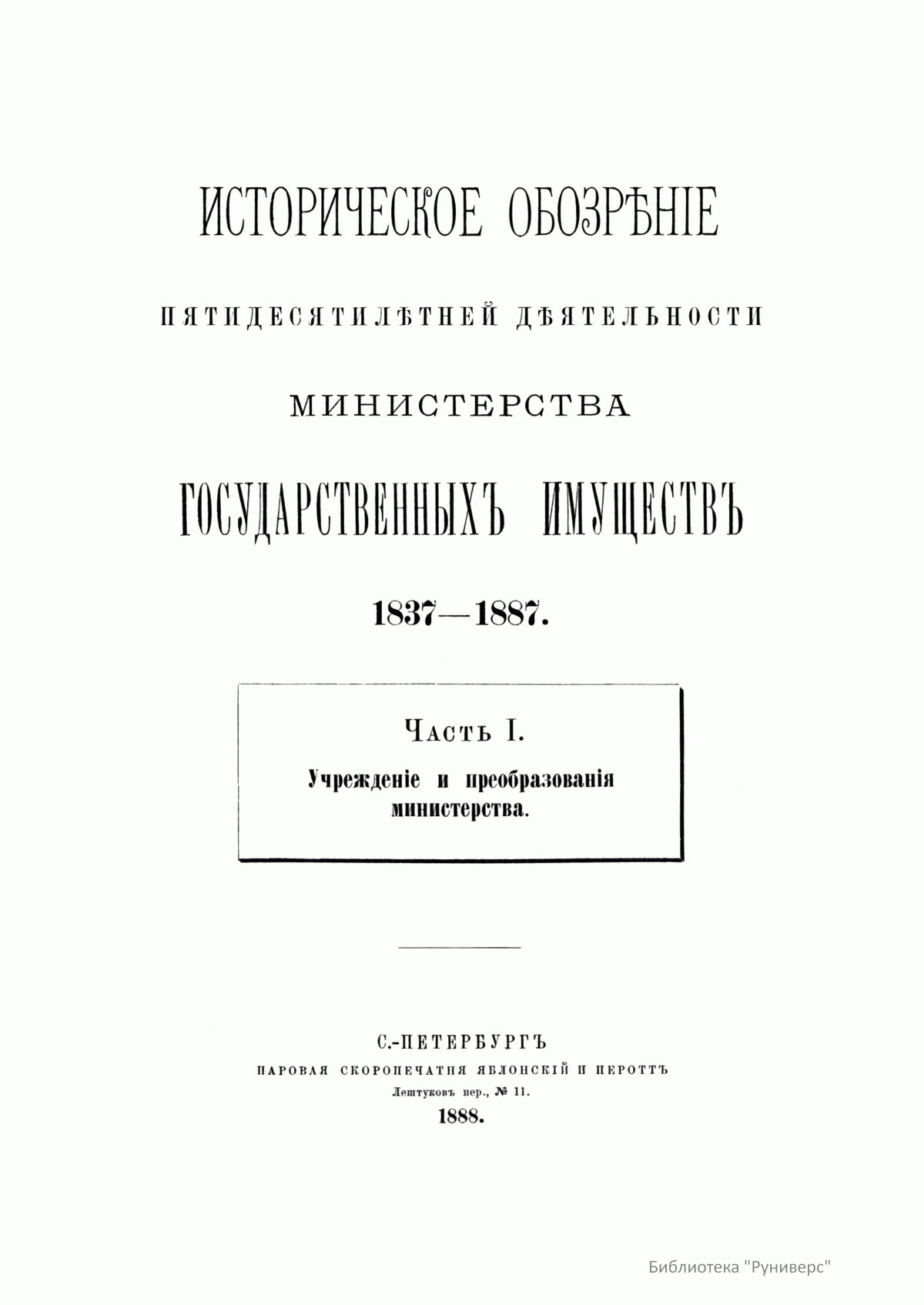 Историческое обозрѣнiе пятидесятилѣтней дѣятельности министерства государственныхъ имуществъ. 1837-1887