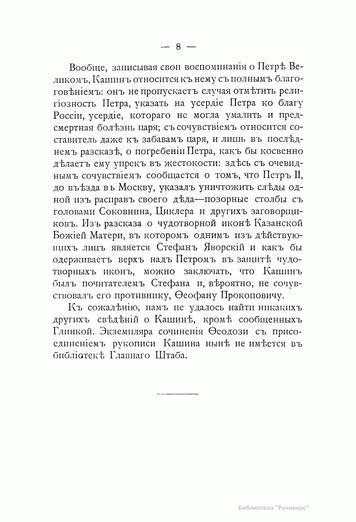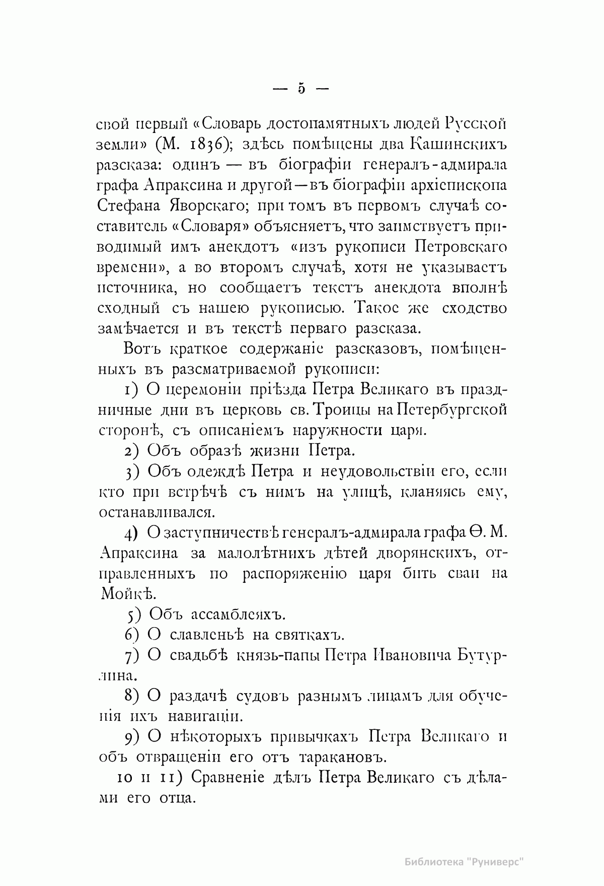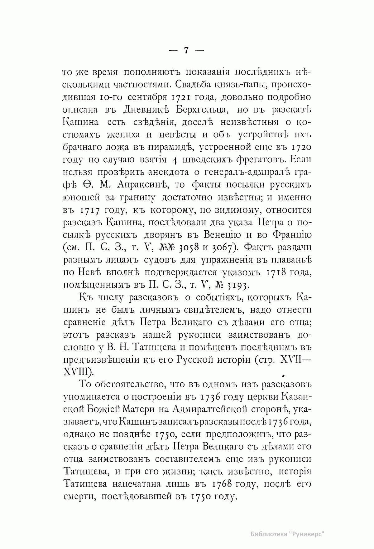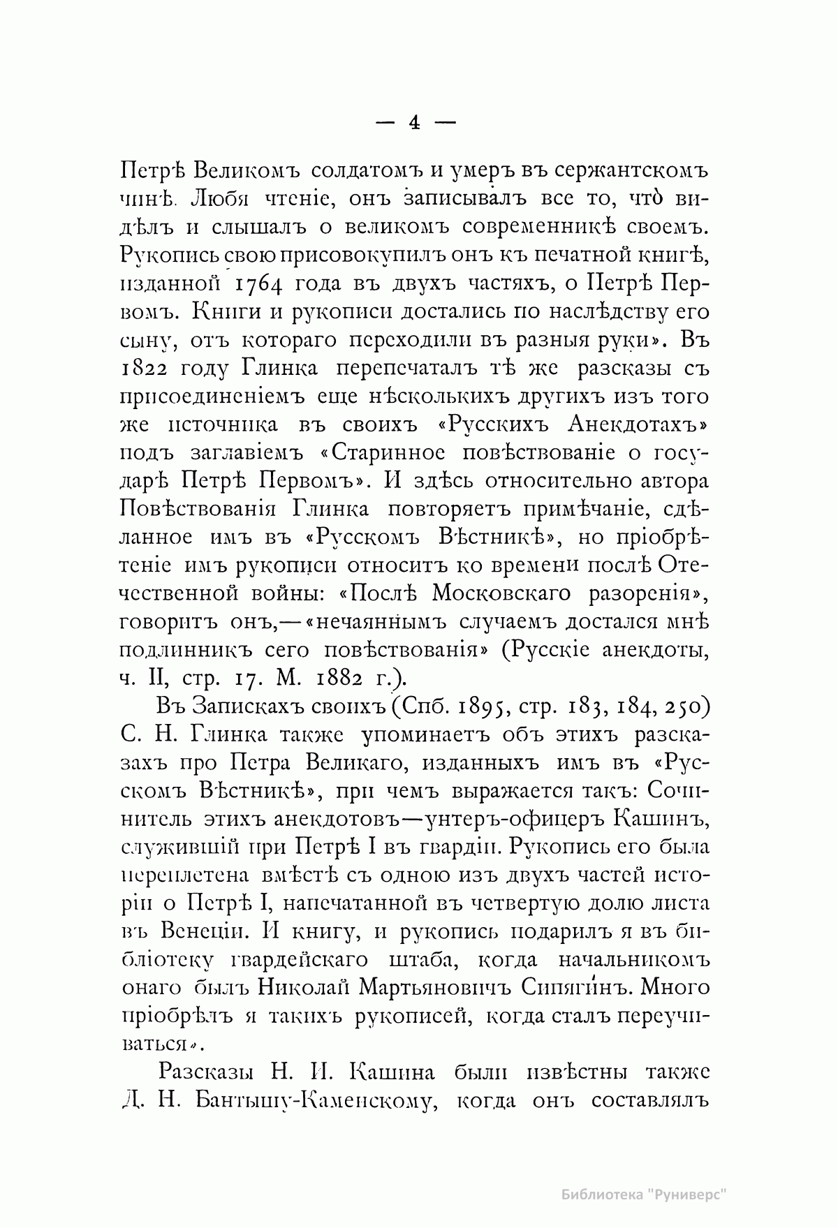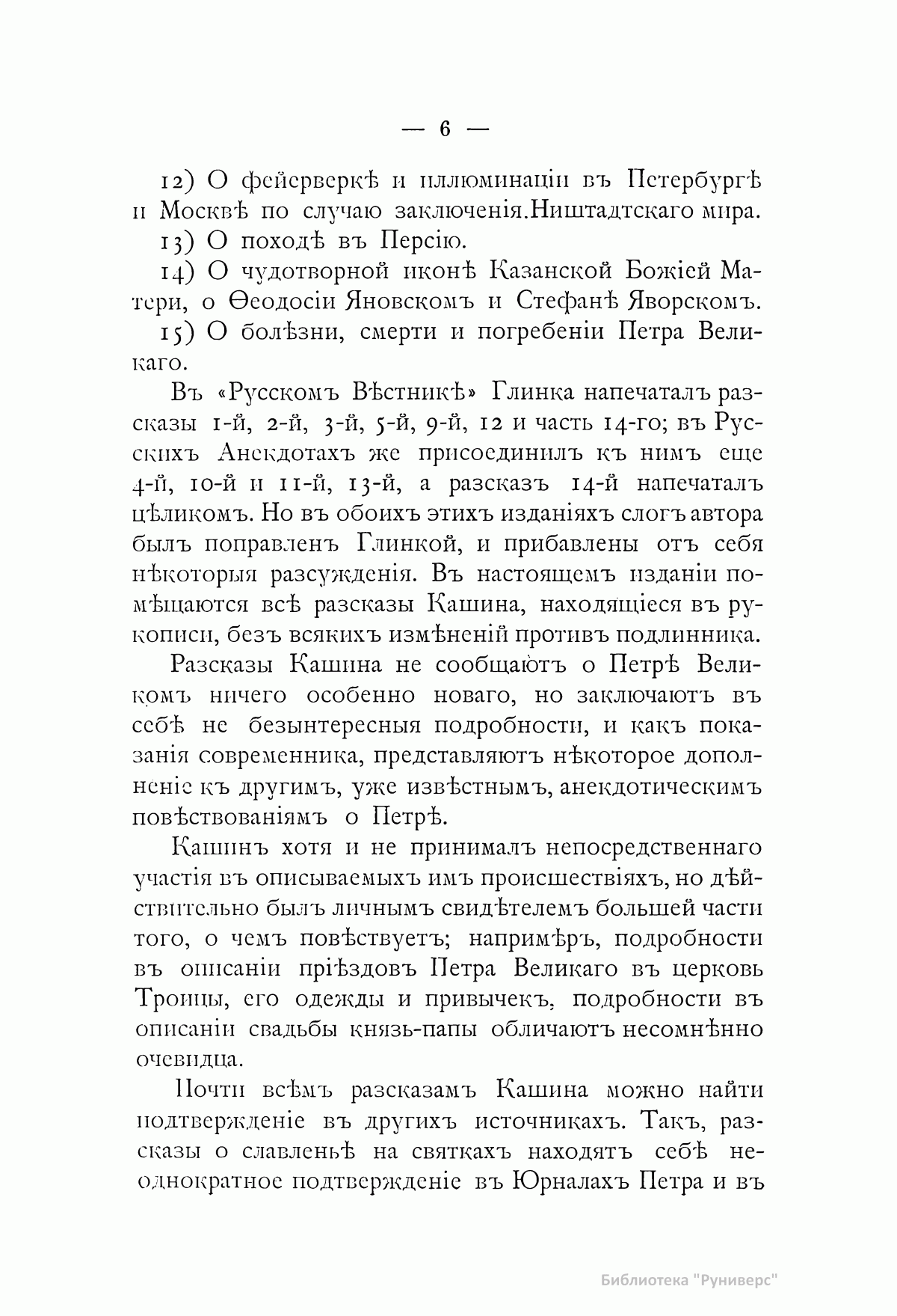 «Сочинитель сей рукописи Никита Иванович Кашин служил при Петре Великом солдатом и умер в сержантском чине. Любя чтение, он записывал все то, что видел и слышал о великом современнике своем. Рукопись свою присовокупил он к печатной книге, изданной в 1764 году в двух частях, о Петре Первом. Книги и рукописи достались по наследству его сыну, от которого переходили в разные руки». С.Н. Глинка В настоящем издании рукопись Кашина опубликована полностью. В нее входят следующие рассказы: 1. О церемонии приезда Петра Великого в праздничные дни в церковь св. Троицы на Петербургской стороне, с описанием наружности царя. 2. Об образе жизни Петра. 3. Об одежде Петра и неудовольствии его, если кто при встрече с ним на улице, кланяясь ему, останавливался. 4. О заступничестве генерал-адмирала Ф.М. Апраксина за малолетних детей дворянских, отправленных по распоряжению царя бить сваи на Мойке. 5. Об ассамблеях. 6. О славленье на святках. 7. О свадьбе князь-папы Петра Ивановича Бутурлина. 8. О раздаче судов разным лицам для обучения их навигации. 9. О некоторых привычках Петра Великого и об отвращении его от тараканов. 10.-11. Сравнение дел Петра Великого с делами его отца. 12. О фейерверке и иллюминации в Петербурге и Москве по случаю заключения Ништадского мира. 13. О походе в Персию. 14. О чудотворной иконе Казанской Божией Матери, о Феодосии Яновском и Стефане Яворском. 15. О болезни, смерти и погребении Петра Великого.