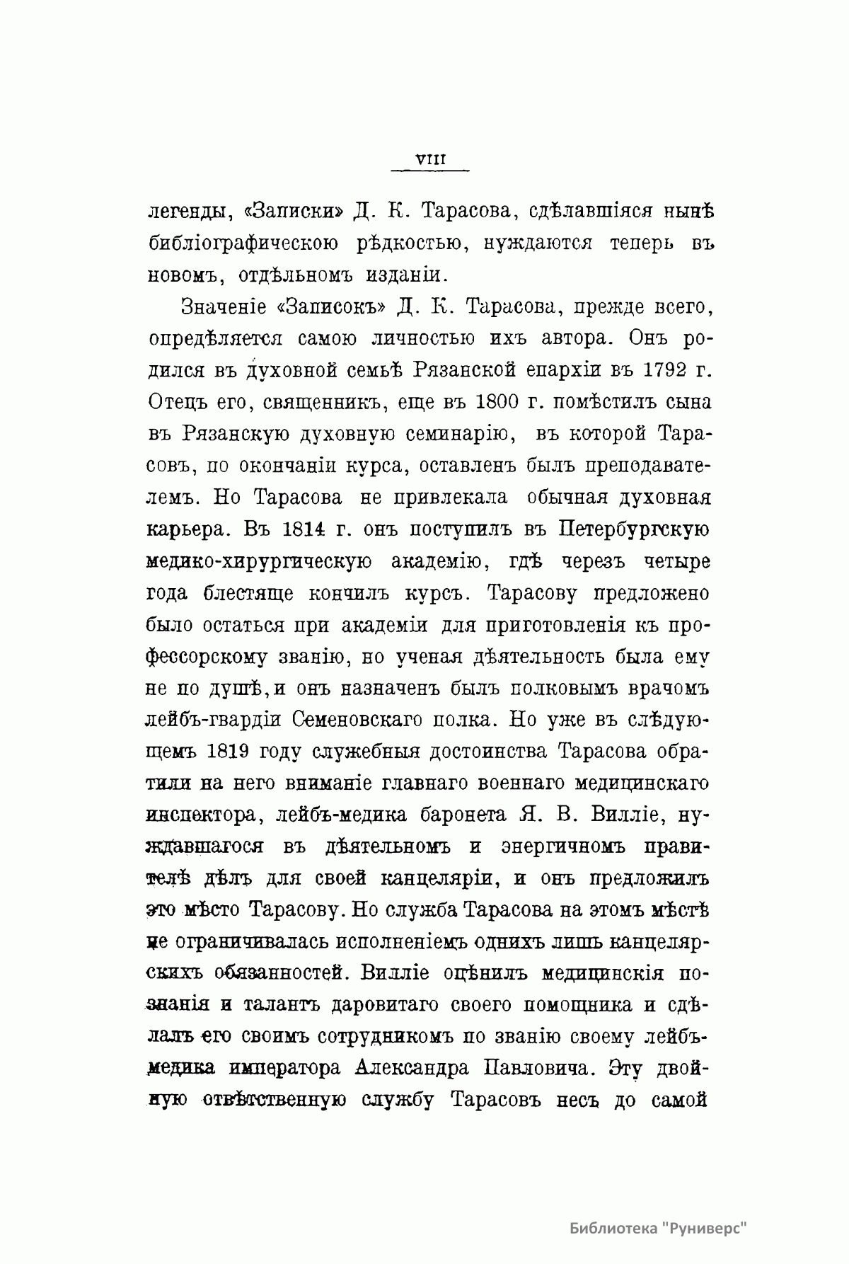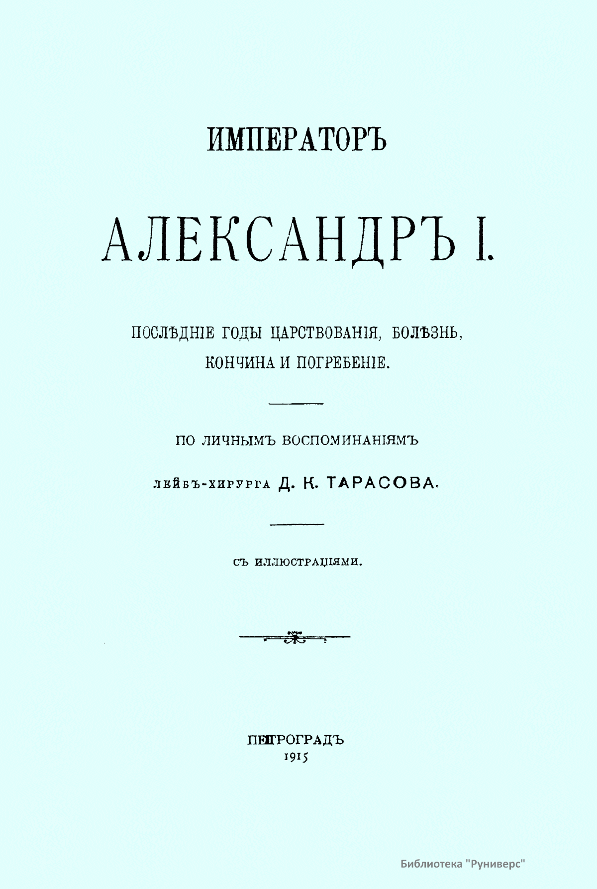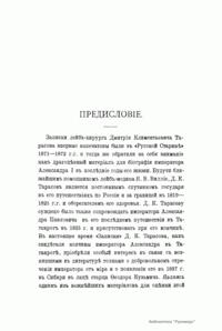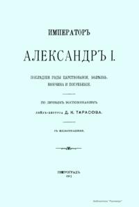 Записки лейб-хирурга Дмитрия Климентьевича Тарасова являются ценным источником для биографии Александра I в последние годы его жизни. Тарасов был постоянным спутником государя в его путешествиях по России и за границей в 1819 – 1825 гг. Он также сопровождал Александра в его последнем путешествии в Таганрог в 1825 г. и присутствовал при его кончине. Существует обширная литература о добровольном отречении Александра I от мира и появлении его в 1837 г. в Сибири в лице старца Федора Козьмича. Записки Тарасова являются важнейшим историческим материалом для оценки этой легенды. Настоящее издание (1915) представляет собой полную и точную перепечатку со списка М.И. Семевского, изданного в «Русской старине» в 1871 – 1872 гг.