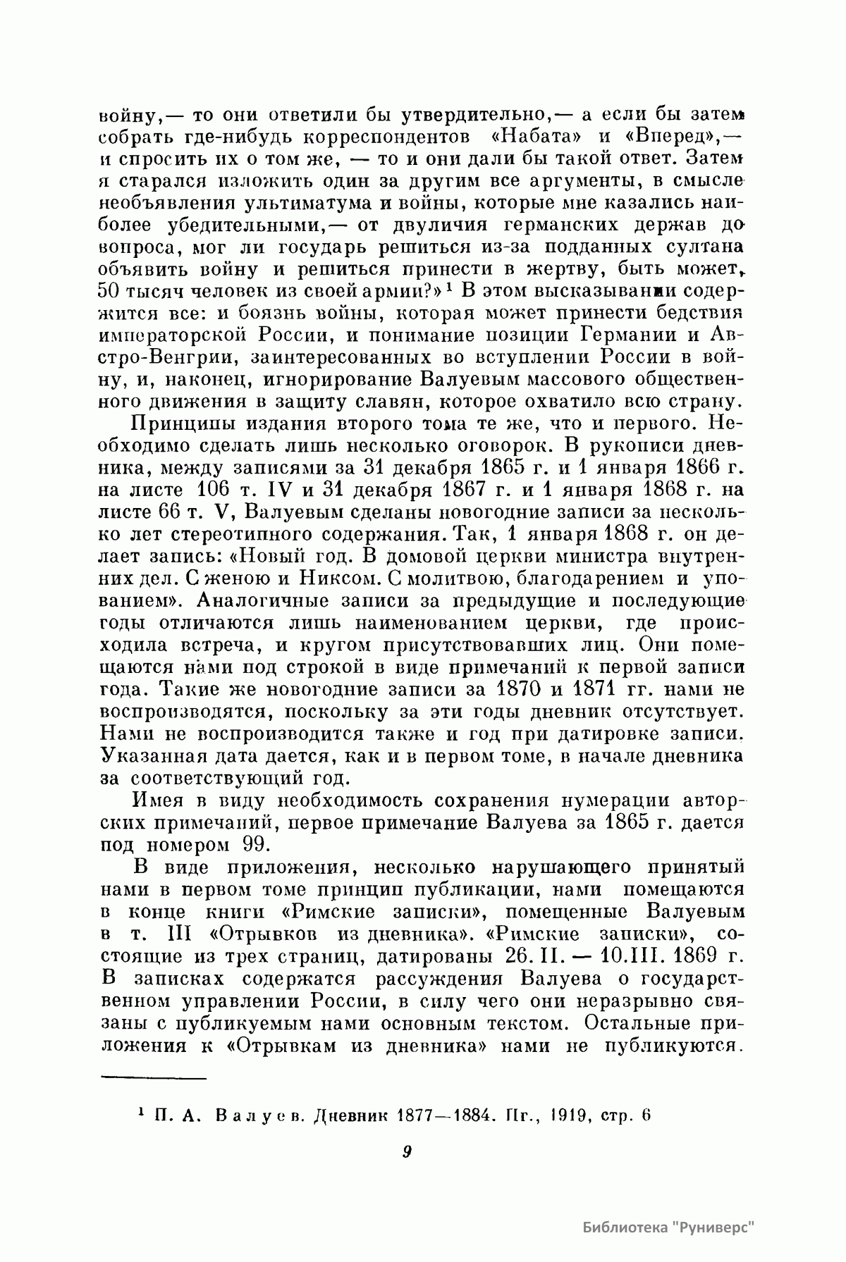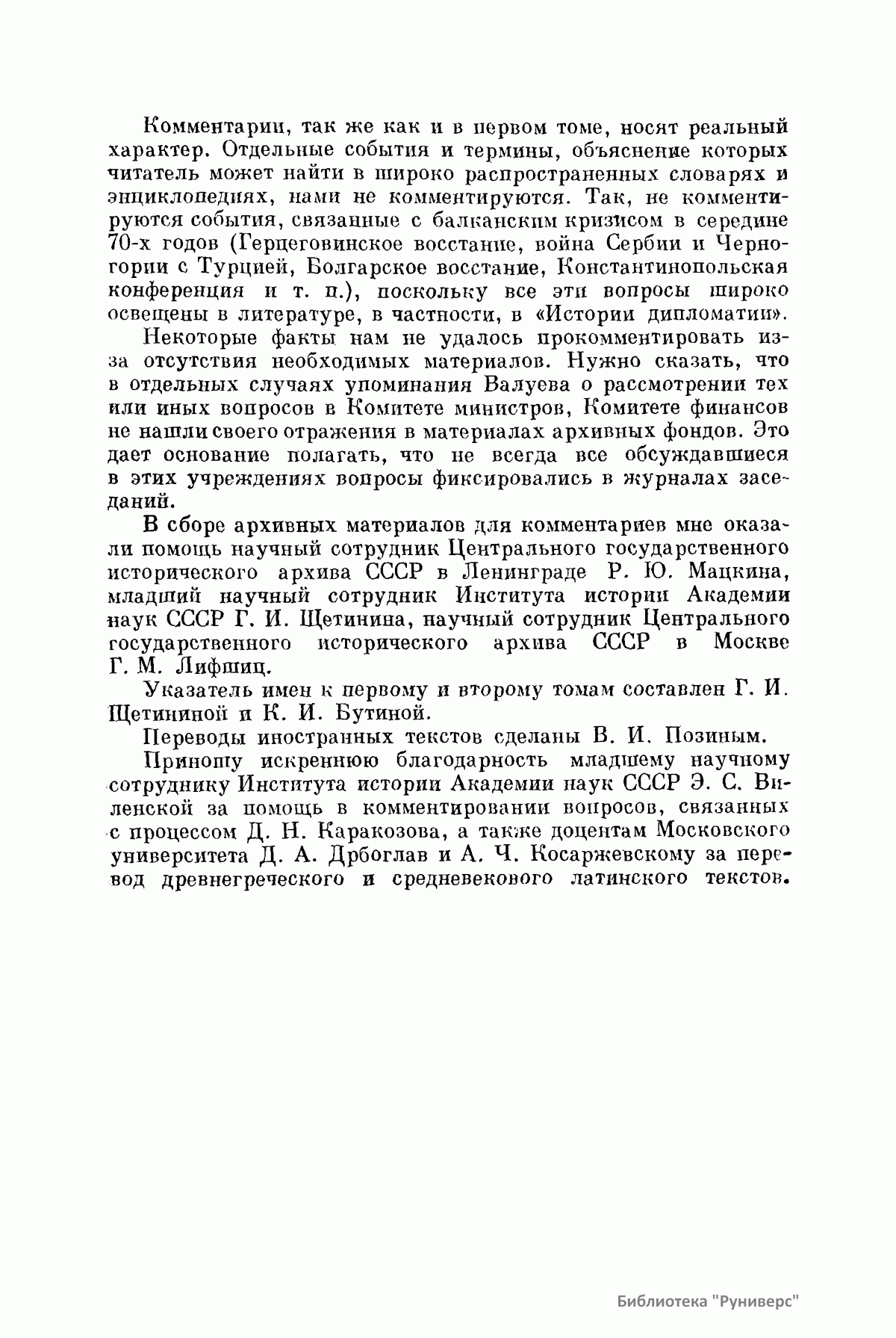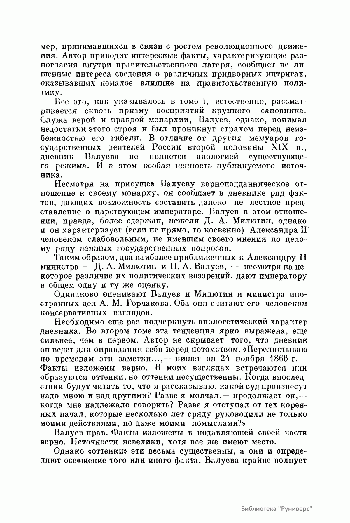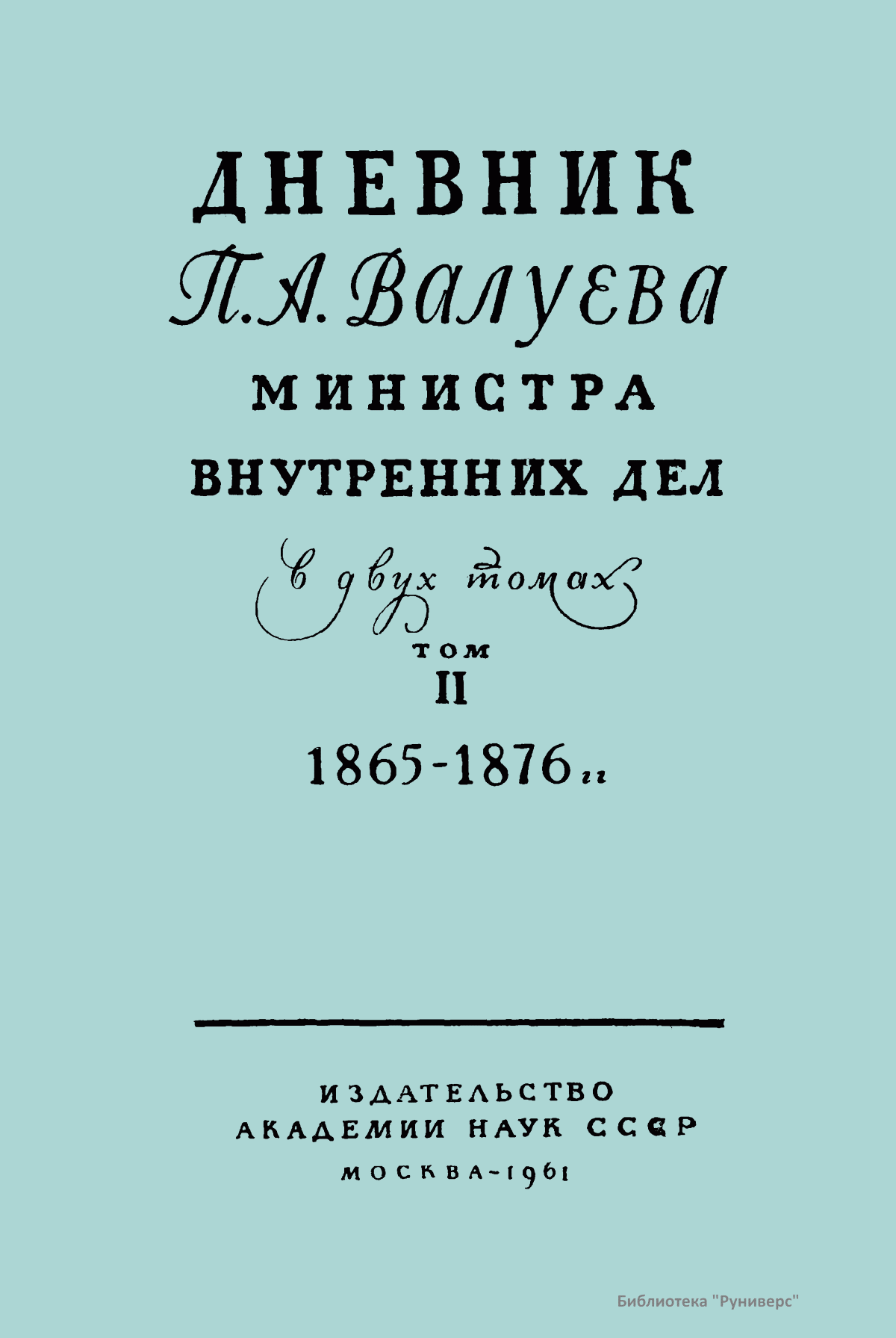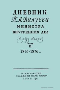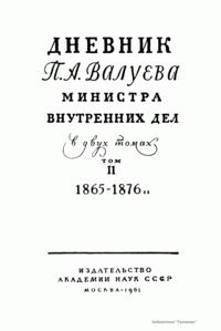 Среди дневников и воспоминаний государственных деятелей России XIX столетия дневники П. А. Валуева (1814 – 1890), министра внутренних дел Александра II, занимают одно из первых мест. Будучи крупным сановником империи, Валуев знал то, что было неизвестно многим, поэтому в его записях можно найти много ценных сведений по внутренней и внешнеполитической истории России. Наибольший интерес представляют записи первой половины 60-х, а также конца 70-х и начала 80-х годов, когда Валуев играл первостепенную роль в осуществлении политики правительства. Большим достоинством дневника является фактическая достоверность. В дневнике освещается достаточно полно последний период подготовки отмены крепостного права – обсуждение проекта Положений 19 февраля в Государственном совете; приводятся данные об опубликовании манифеста в Петербурге; освещается ход реализации реформы в 1861, 1862 и 1863 гг. и сообщается о смятении, царившем в правительственных кругах в то время. Здесь же содержатся сведения о подготовке других преобразований, главным образом земской реформе. Автор не ограничивается изложением официального обсуждения проектов, он сообщает интересные сведения о суждениях Александра II, императрицы и некоторых крупных сановников. Много места отводится в дневнике событиям в Польше: Валуев признает необходимость известных уступок в решении национального вопроса и критически относится к действиям властей. На страницах дневника приводятся сведения о деятельности революционных кружков в России в 60-х гг., распространении прокламаций; сообщается о Чернышевском, его аресте, организации над ним процесса, о роли провокатора Костомарова и т.д. Значительно меньше места в дневнике отводится вопросам внешней политики, и излагаются они преимущественно в связи с событиями в Польше и восточным кризисом середины 70-х гг. Дневник издан в двух томах: том I – 1861 – 1864 гг., том II – 1865 – 1876 гг. В первом томе публикуется биографический очерк П.А. Валуева, характеризующий его взгляды, служебную деятельность, а также литературное наследие.