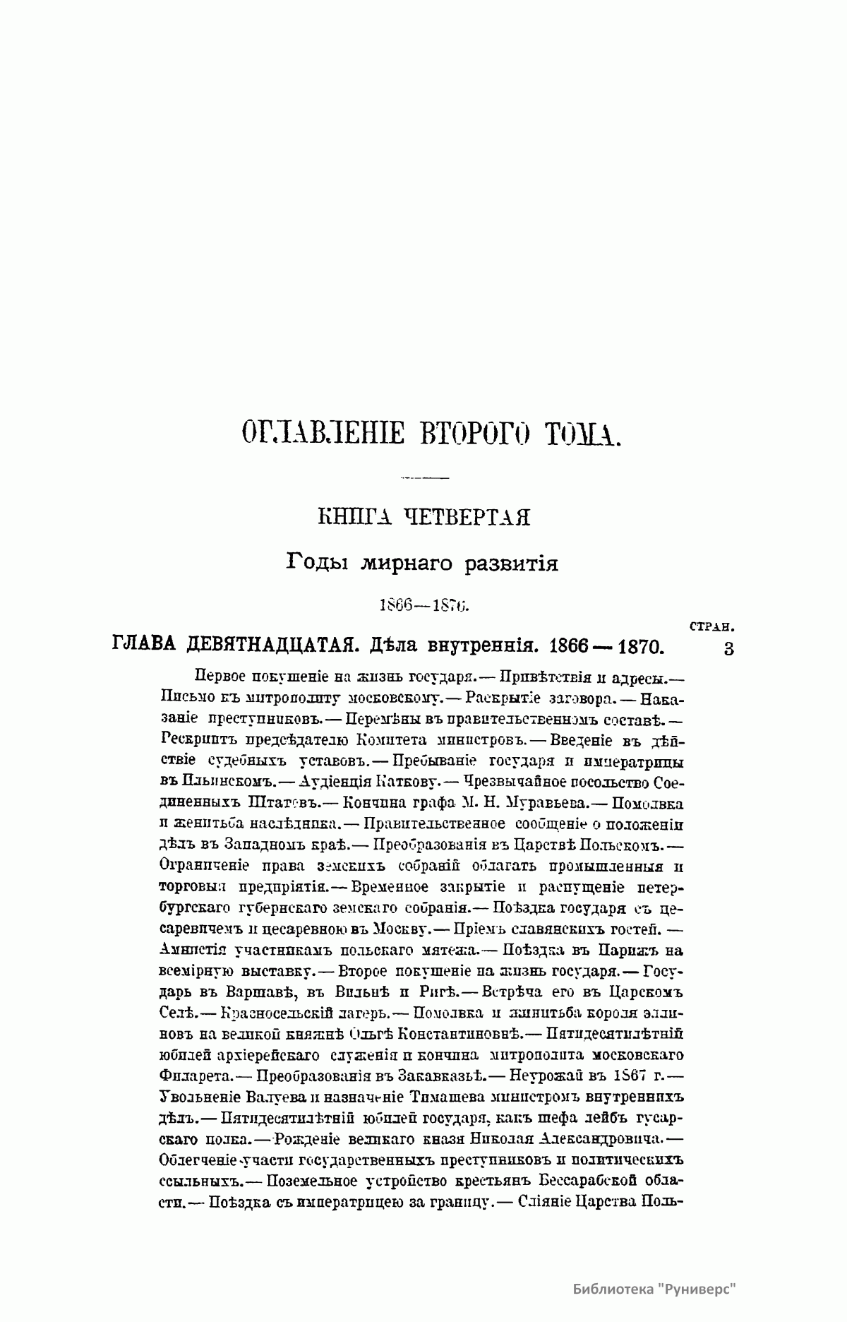 Александр II (1818 – 1881) – российский император с 1855 г. Старший сын Николая I. В 1861 г. в значительной степени благодаря его последовательности был устранен корень всех зол, терзавших Россию, – многовековое крепостное право, затем подготовлен и проведен целый комплекс реформ: судебная, земская и многие другие, открывавшие путь к созданию нового, более прогрессивного государственного устройства. В царствование Александра II завершилось присоединение к России Кавказа (1864), Казахстана (1865), большей части Средней Азии (1865 –1881). На жизнь Александра II был совершен ряд покушений (1866, 1867, 1879, 1880), убит народовольцами. Автор настоящего фундаментального труда Татищев Сергей Спиридонович видит свою задачу в том, «чтобы собрать воедино многочисленные свидетельства об отдельных моментах и эпизодах жизни и деятельности государя Александра Николаевича и, дополнив их собственными изысканиями, составить точный и по возможности полный прагматический свод событий его царствования и личного в них участия или воздействия на них императора в области политики как внутренней, так и внешней». В основание своей работы автор положил материалы, изученные им в Государственном и Главном Санкт-Петербургском архиве министерства иностранных дел, в архивах Государственного совета, бывшего III отделения Собственной Его Величества канцелярии, в Военно-ученом архиве Главного штаба. Кроме того, автор имел доступ в некоторые архивы иностранных государств и частные архивы.