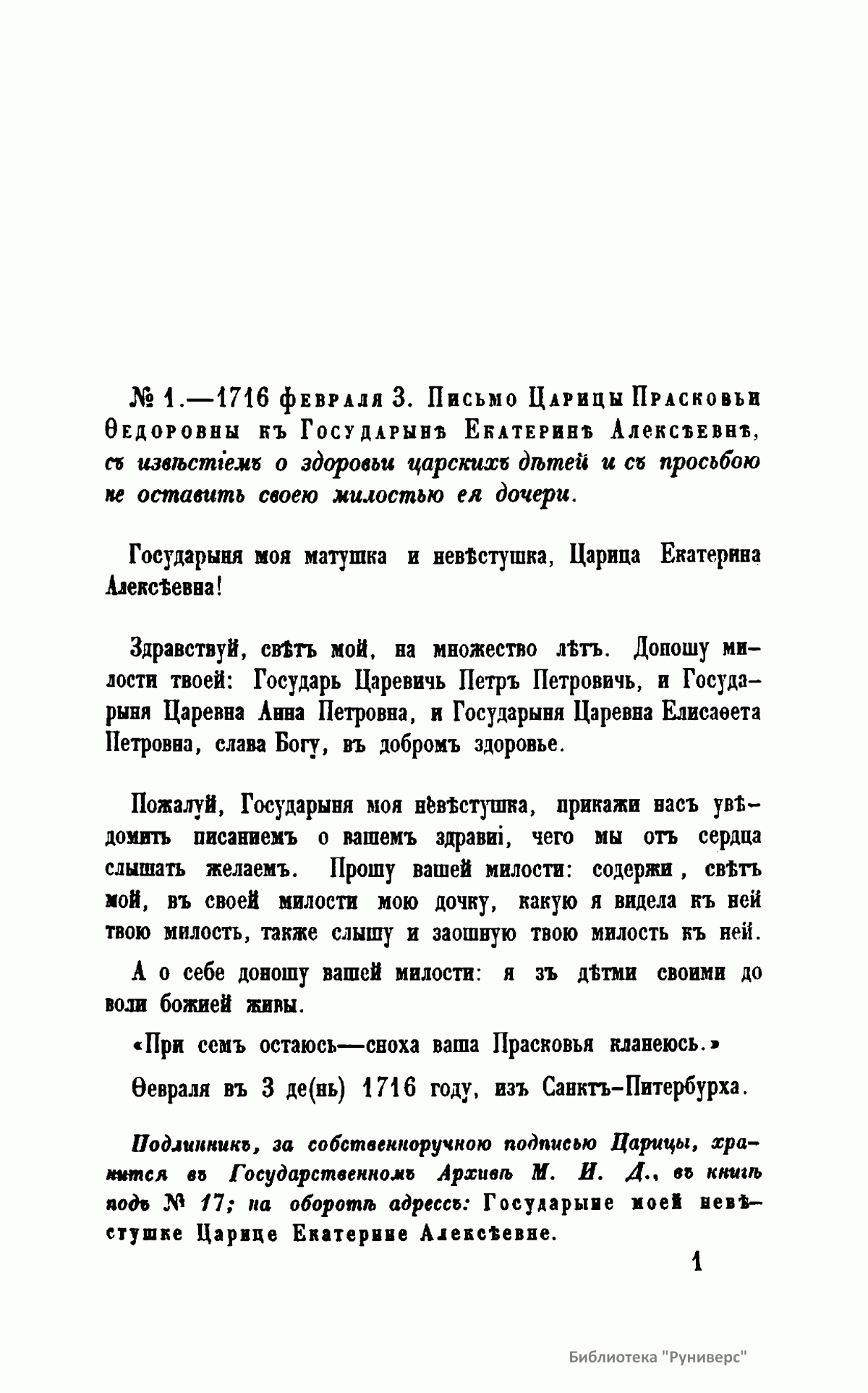 Письма русских государей и других особ царского семейства. II. Переписка царицы Прасковьи Федоровны и дочерей ее Екатерины и Прасковьи