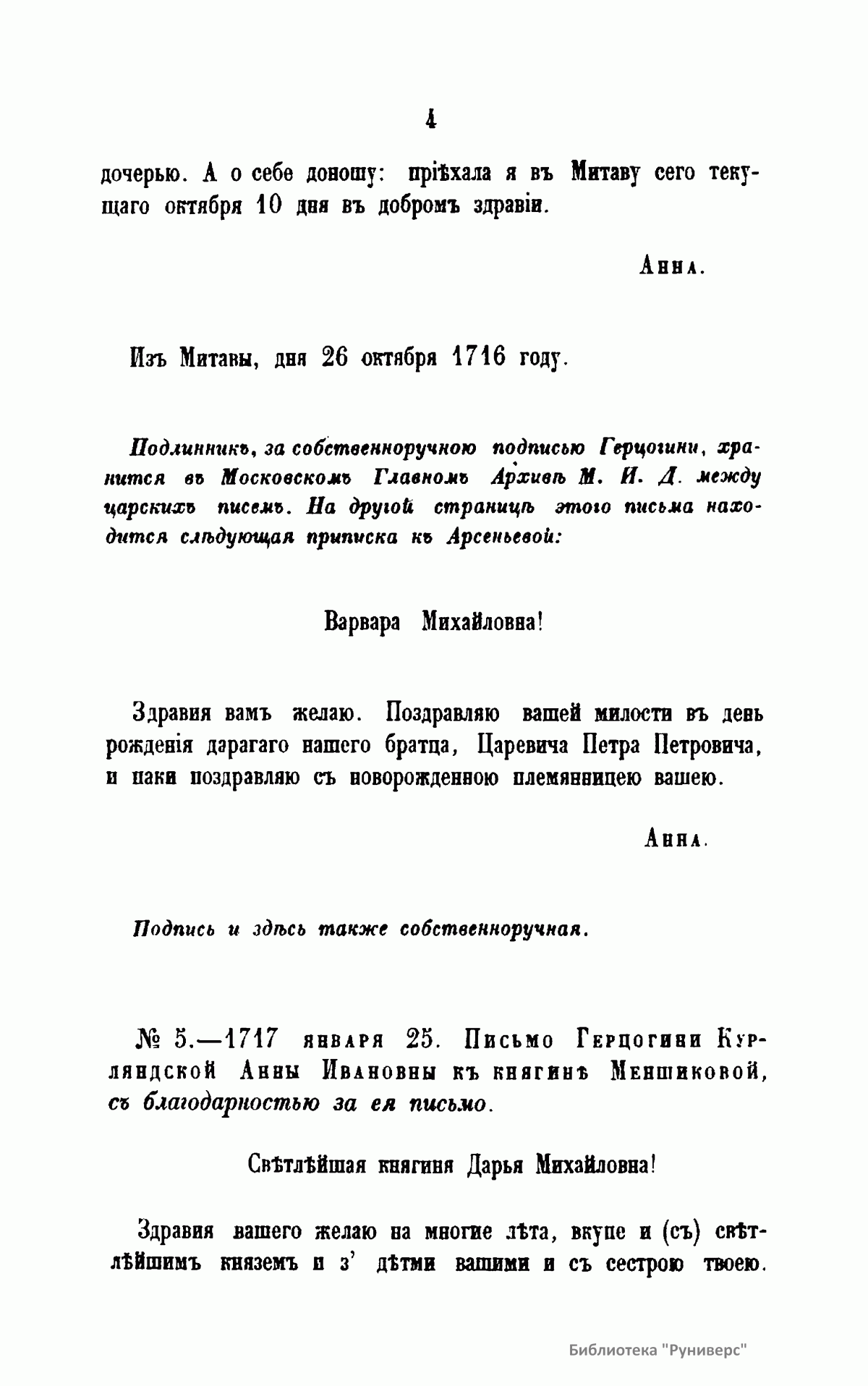 Письма русских государей и других особ царского семейства. IV. Переписка Герцогини Курляндской Анны Ивановны