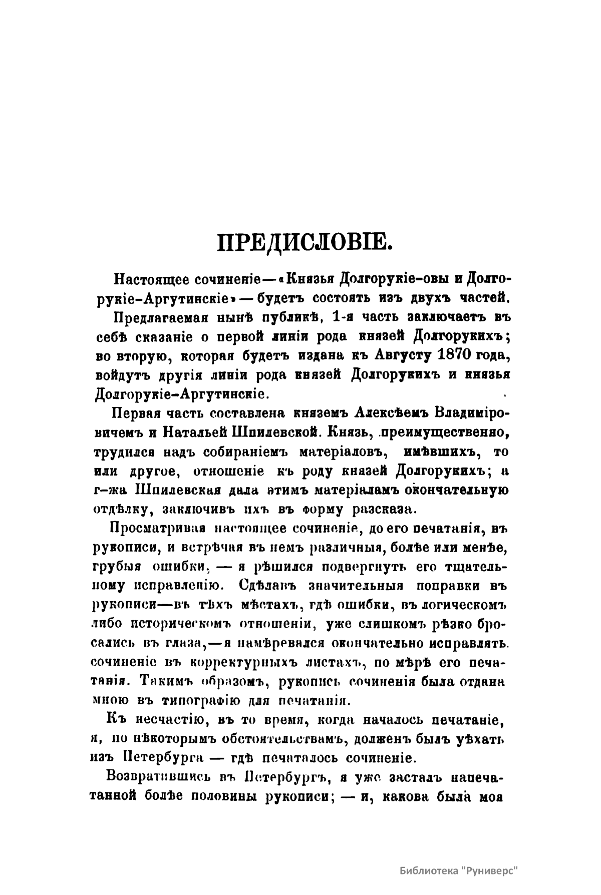 В библиотеке «Руниверс» представлена первая часть книги «Долгорукие, Долгоруковы и Долгорукие-Аргутинские». Цель этой части – познакомить читателя с родом князей Долгоруких. Издатель книги, князь Всеволод Долгорукой, представляет не строгое научное исследование, а рассказ о первой линии князей Долгоруких, но основанный на исторических данных. Настоящее сочинение имеет цель также опровергнуть мнение князя Петра Владимирович Долгорукова о том, что фамилию нужно писать через «ов», а не через «ой». Первая часть книги – сочинение князя Алексея Долгорукого и Натальи Шпилевской, заключает главы: О роде. Из дела о гербе и подписи Долгоруких. История рода Долгоруких. В «Приложении» представлен список старшей линии князей Долгоруких; список дочерей князей первой линии; список супруг князей Долгоруких старшей (первой) линии. Первую часть заключает статья князя Алексея Долгорукого «Заметки о первых русских князьях и о происхождении Рюрика, Синеуса и Трувора».