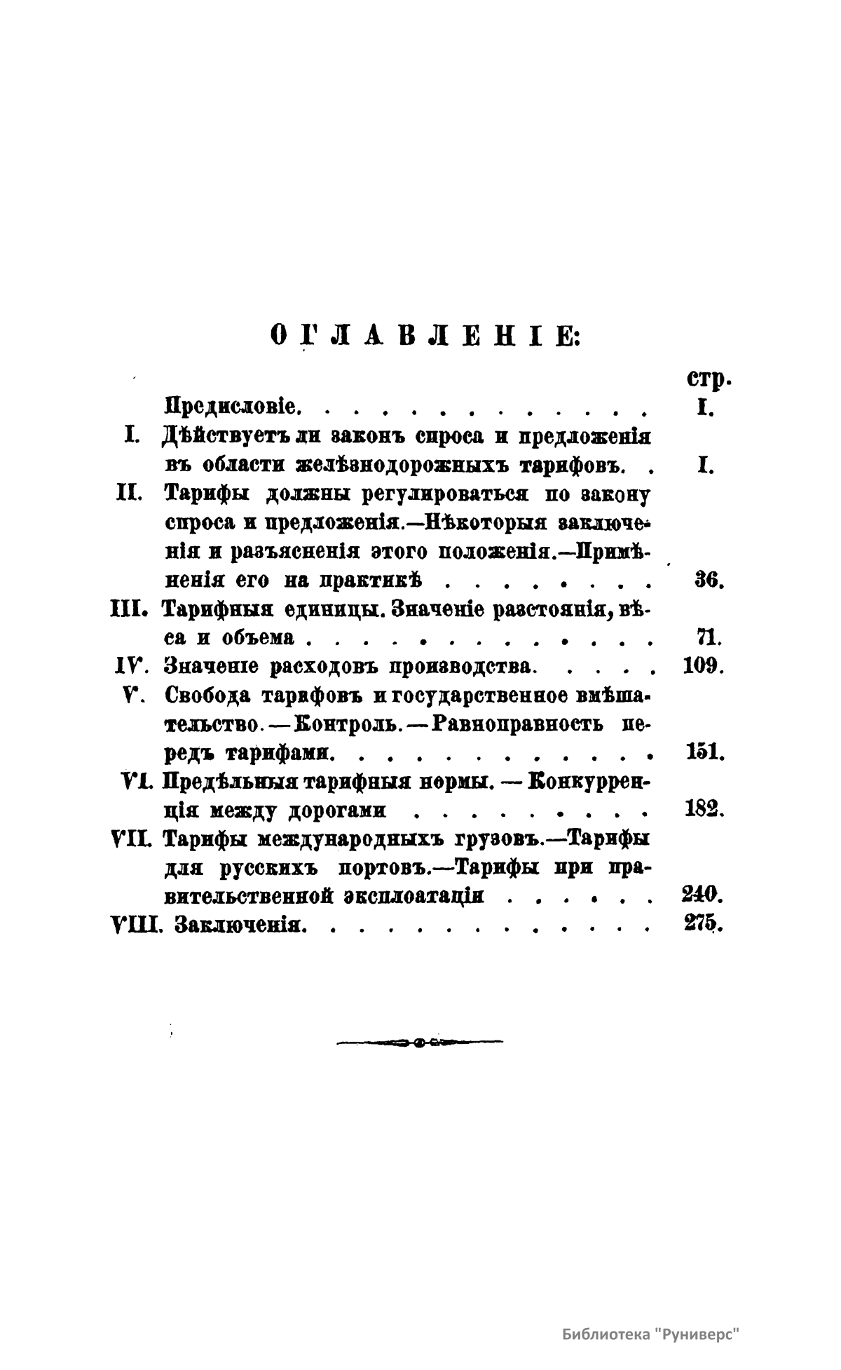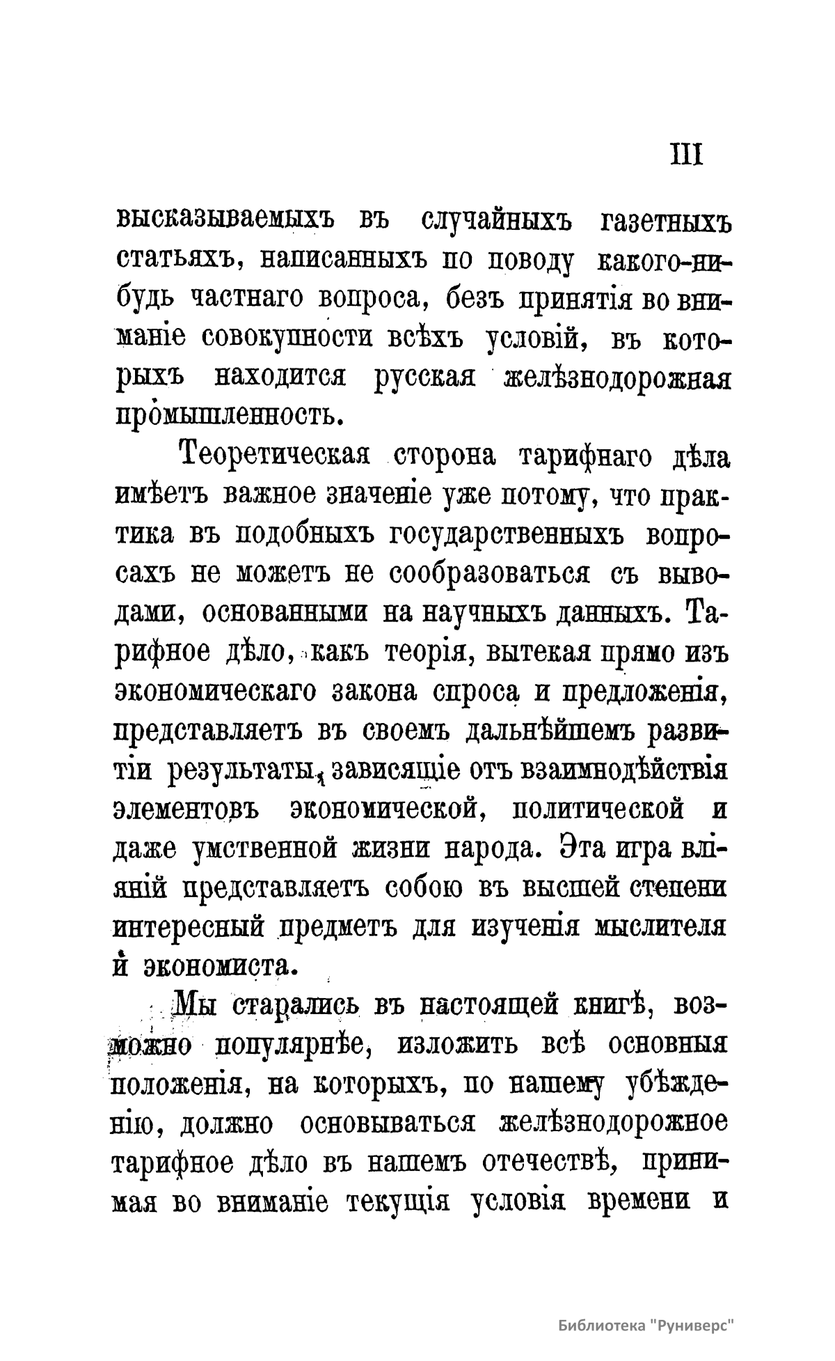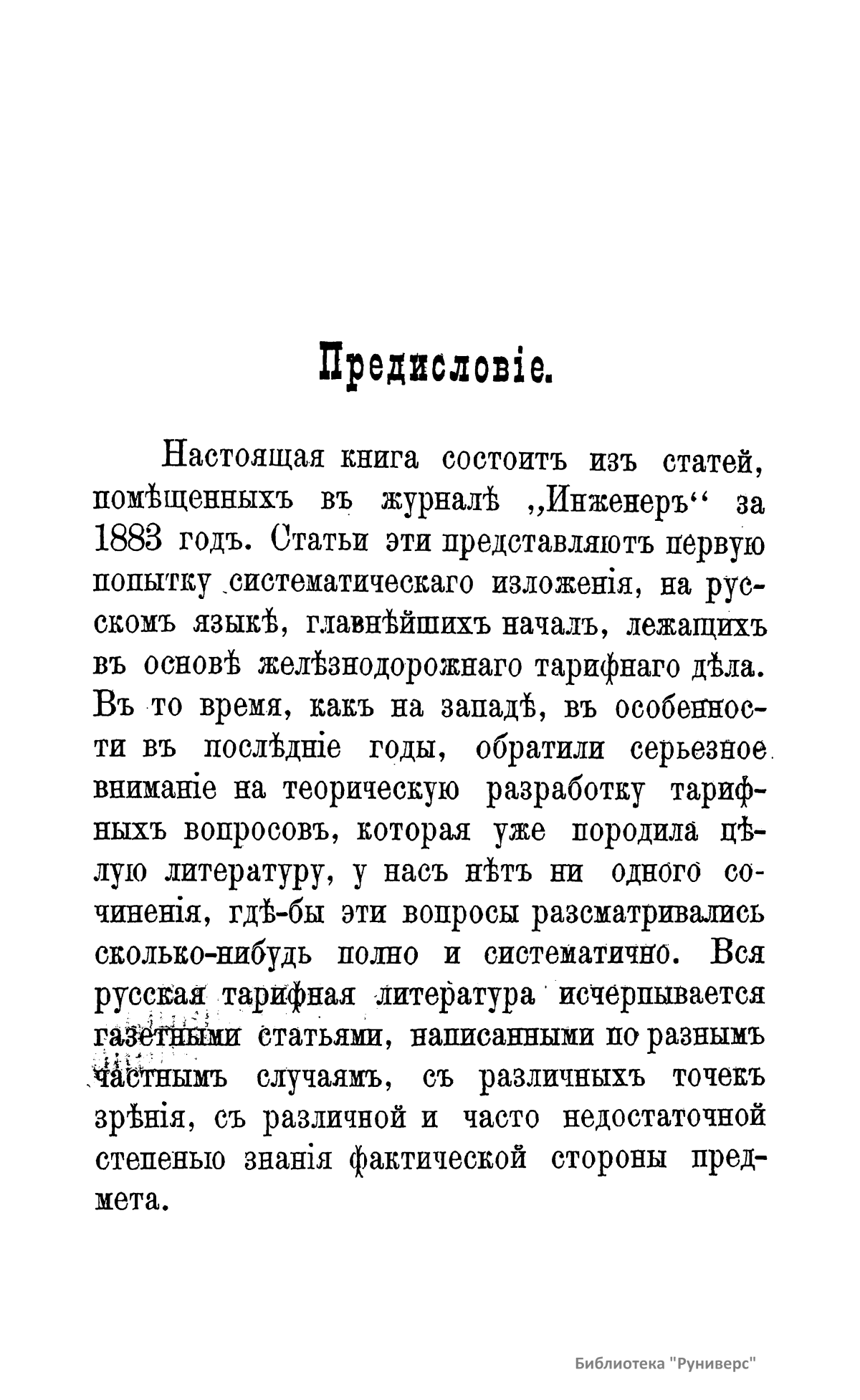 Настоящая книга состоит из статей, помещенных в журнале «Инженер» за 1883 г. Эти статьи представляют первую попытку систематического изложения на русском языке главнейших начал, лежащих в основе железнодорожного тарифного дела. Тарифное дело, вытекающее из всей совокупности экономических и торговых отношений и, в свою очередь, на них влияющее, имеет несомненный интерес как практического, так и теоретического характера. Только изучение и понимание тарифных вопросов во всей их полноте может предохранить учреждения, имеющие влияние на установление тарифов, от таких ошибок, которые должны отозваться значительными убытками или для народа, или для железных дорог, а следовательно, в огромном большинстве случаев и для государственного бюджета. Теоретическая сторона тарифного дела имеет важное значение потому, что практика в подобных государственных вопросах не может не сообразовываться с выводами, основанными на научных данных. Тарифное дело как теория, вытекая прямо из экономического закона спроса и предложения, представляет в своем дальнейшем развитии результаты, зависящие от взаимодействия элементов экономической, политической и даже умственной жизни народа. Эта игра влияний представляет собой в высшей степени интересный предмет для изучений мыслителя и экономиста.