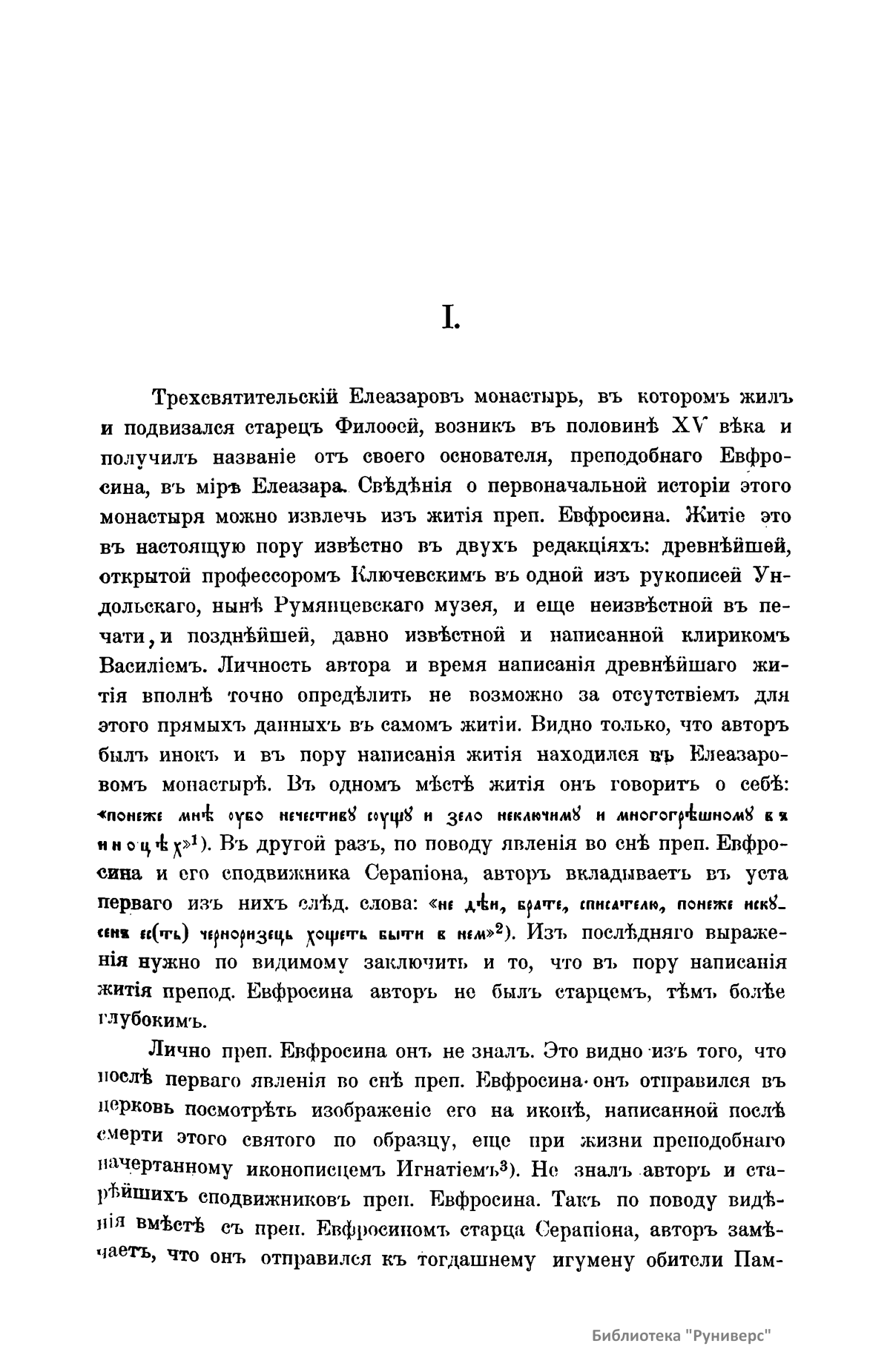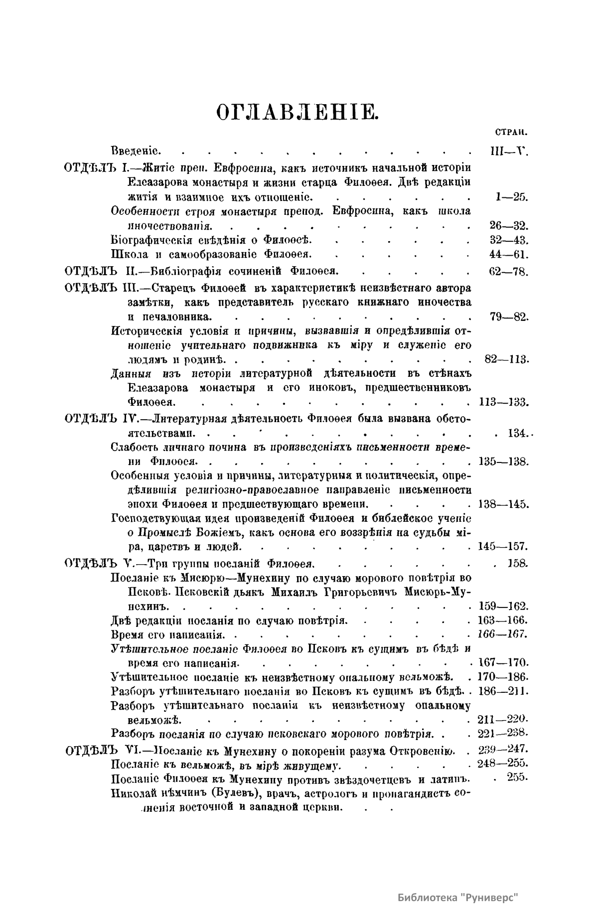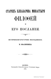 Филофей – инок-писатель (1465 – 1542), который в силу обстоятельств и по личному почину обращается к великим князьям московским то с печалованием за опальных, то по существенным вопросам государственной и общественной жизни своего времени. Задача настоящего исследования – понять и объяснить личность Филофея и его литературную деятельность. В исследовании восемь частей. Первая посвящена выяснению данных биографии Филофея. Вторая – библиографии предмета. Третья – краткой истории и выяснению причин и условий возникновения и развития типа учительного инока в Древней Руси и судьбе этого типа в стенах Елеазарова монастыря. В четвертой части речь идет об отличительных особенностях авторства и сочинений Филофея, связи этих особенностей с историческими условиями древнерусской образованности и литературы, о господствующей идее мировоззрения Филофея и его сочинений, и, как первоисточник и основа этой идеи, излагается библейское учение о Промысле Божием. Пятая часть посвящена исследованию посланий Филофея, в которых идея провиденциализма, как господствующая идея его посланий, раскрывается им в отношении к судьбам отдельных людей. В шестой части рассматриваются те послания Филофея, в которых та же идея раскрывается в связи с учением астрологов о влиянии звезд на судьбы мира, людей и царств. В седьмой части рассматриваются послания к князьям, где речь идет о всемирно-историческом значении русского государства и отношении государства к церкви. В восьмой части излагается взгляд Филофея на печалование как форму отношения церкви к государству. Подробное оглавление находится в начале книги.