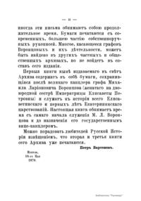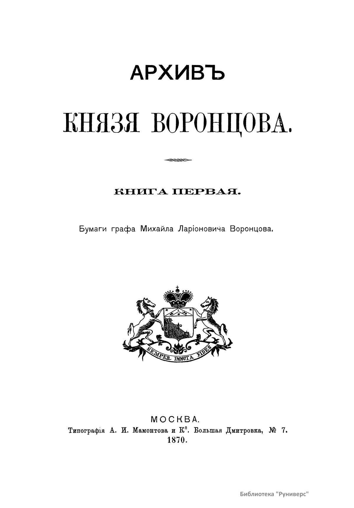 Издание представляет документы из архива графов (с 1845 г. князей) Воронцовых, крупных политических деятелей России XVIII и XIX вв.: Михаила Илларионовича (1714 – 1767) – канцлера при Елизавете Петровне; Романа Илларионовича (1707 – 1783); Александра Романовича (1741 – 1805) – канцлера в 1802 – 1804 гг.; Семена Романовича (1744 – 1832) – посла в Англии в 1785 – 1806 гг.; Михаила Семеновича (1782 – 1856) – фельдмаршала, наместника Кавказа в 1845 – 1853 гг. Архив издан в 40 тт. (1870 – 1895) под редакцией П. И. Бартенева. Содержит огромный материал по внешней политике, по управлению хозяйством Елизаветы Петровны (кн. 1), по делу Миниха и Бирона (кн. 2), о «чумном бунте» 1771 г. в Москве, о движении Е. И. Пугачева (кн. 16), о А. Н. Радищеве (кн. 5, 12, 24). Книга 21-я занята «Записками» Е. Р. Воронцовой (Дашковой). В книге 24-й – свыше 100 писем А. В. Суворова. Среди обширной переписки Воронцовых встречаются письма Вольтера, Д'Аламбера, Жозефа де Местра, Костюшки, Талейрана, Питта и др.