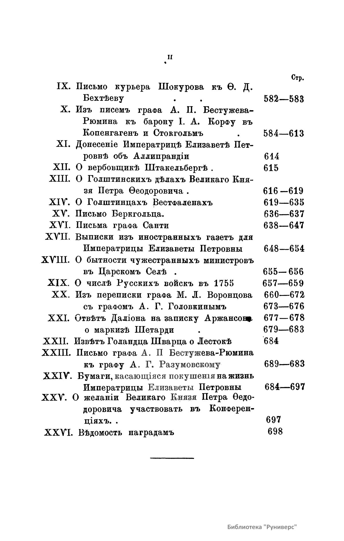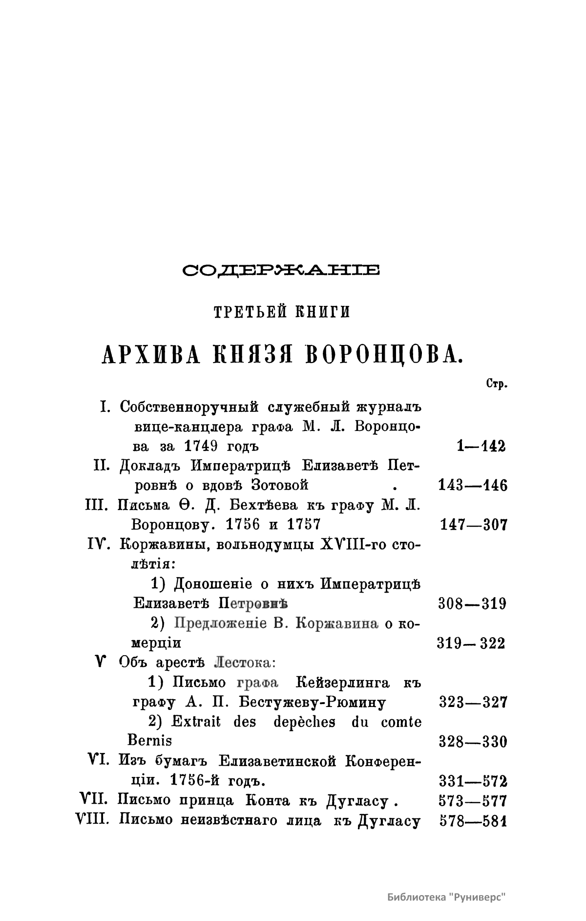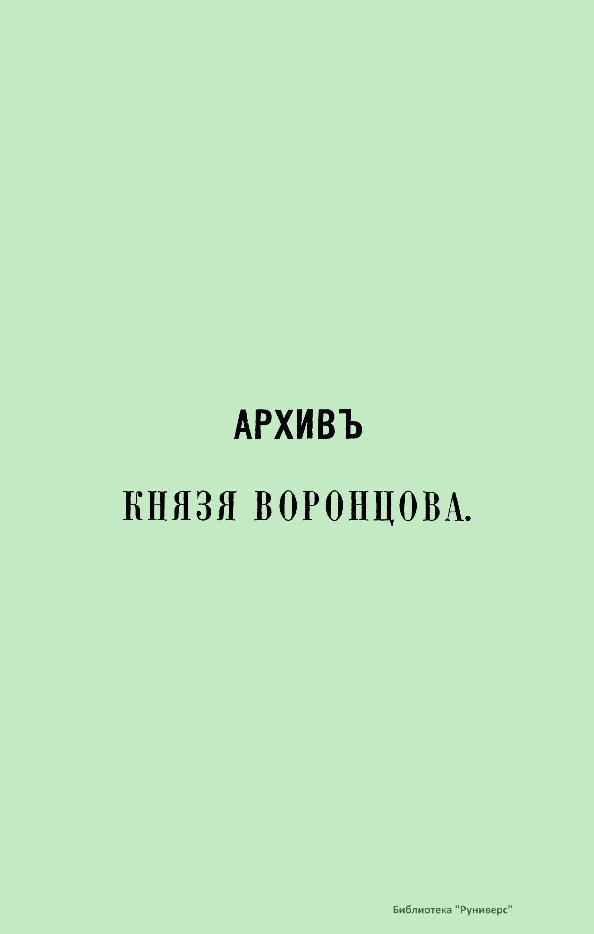 Издание представляет документы из архива графов (с 1845 г. князей) Воронцовых, крупных политических деятелей России XVIII и XIX вв.: Михаила Илларионовича (1714 – 1767) – канцлера при Елизавете Петровне; Романа Илларионовича (1707 – 1783); Александра Романовича (1741 – 1805) – канцлера в 1802 – 1804 гг.; Семена Романовича (1744 – 1832) – посла в Англии в 1785 – 1806 гг.; Михаила Семеновича (1782 – 1856) – фельдмаршала, наместника Кавказа в 1845 – 1853 гг. Архив издан в 40 тт. (1870 – 1895) под редакцией П. И. Бартенева. Содержит огромный материал по внешней политике, по управлению хозяйством Елизаветы Петровны (кн. 1), по делу Миниха и Бирона (кн. 2), о «чумном бунте» 1771 г. в Москве, о движении Е. И. Пугачева (кн. 16), о А. Н. Радищеве (кн. 5, 12, 24). Книга 21-я занята «Записками» Е. Р. Воронцовой (Дашковой). В книге 24-й – свыше 100 писем А. В. Суворова. Среди обширной переписки Воронцовых встречаются письма Вольтера, Д'Аламбера, Жозефа де Местра, Костюшки, Талейрана, Питта и др.