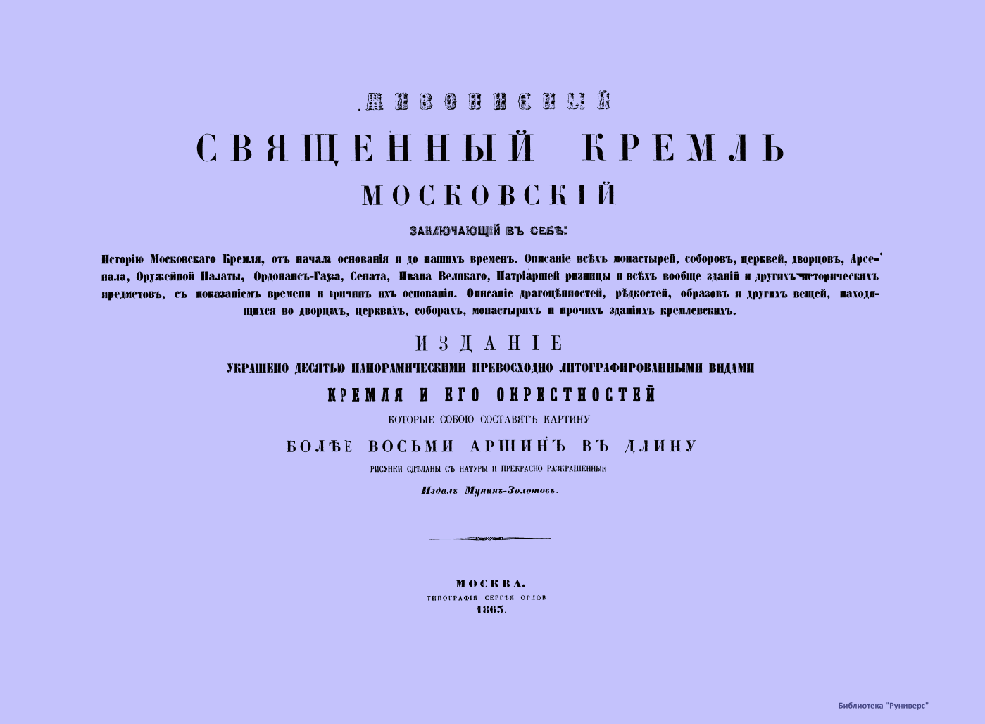 Издание включает историю Московского Кремля от начала основания до 60-х годов XIX века. Описание всех исторических памятников Кремля с указанием времени и причин их основания. Описание драгоценностей, редкостей, образов и других вещей, находящихся в кремлевских зданиях. Книга украшена десятью литографиями с видами Кремля и его окрестностей.