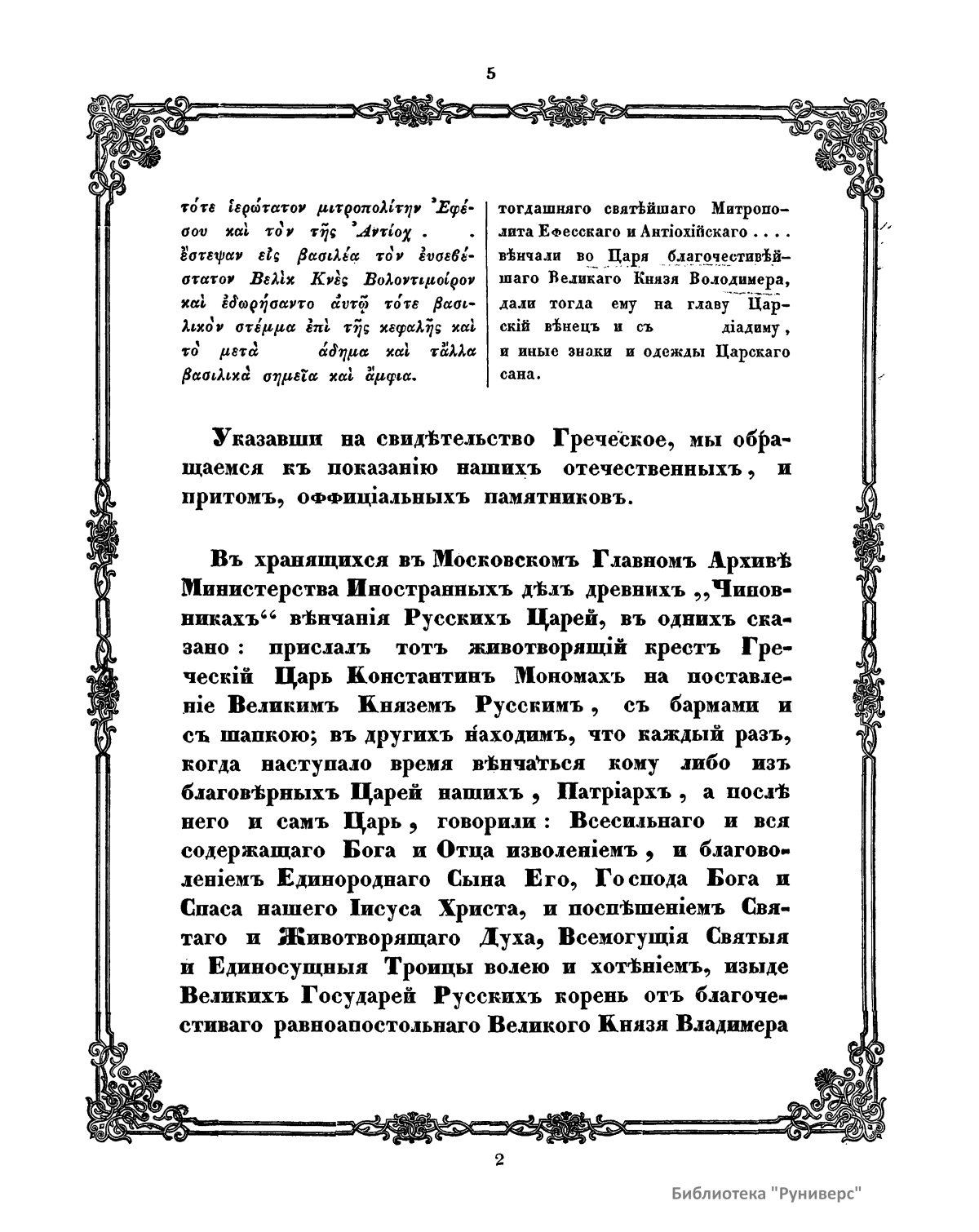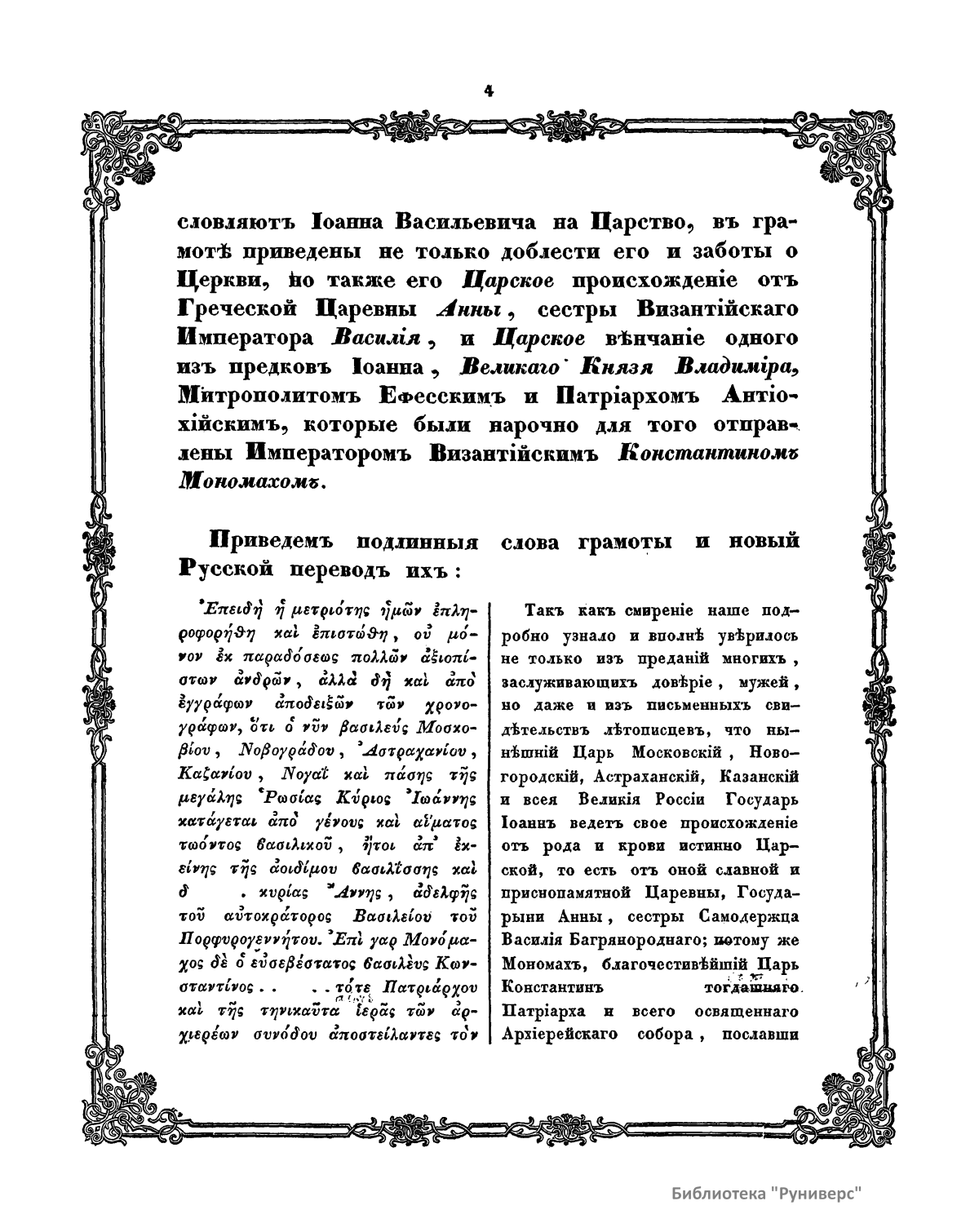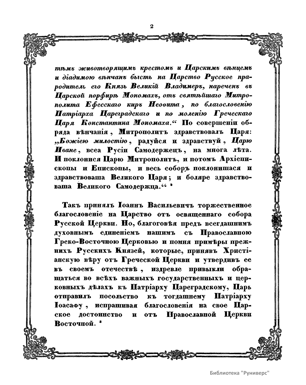Иностранные государи в своих грамотах очень часто давали русским великим князьям титул царя. Иван III во внешних сношениях с европейскими государями и азиатскими владетелями уже именовал себя царем и венчал на царство своего внука Дмитрия. Однако русские государи постоянно начали именоваться царями в актах и внешних, и внутренних только с того времени, как православная церковь в лице всего собора русского духовенства и первосвятителя митрополита Макария благословила на царство великого князя Ивана IV Васильевича. Торжественное венчание происходило в московском Успенском соборе 16 января 1547 г. Помня всегдашнее духовное единение Руси с православной греко-восточной церковью и примеры прежних русских князей, которые, приняв христианскую веру от греческой церкви и утвердив ее в своем отечестве, издревле привыкли обращаться во всех важных церковных и государственных делах к патриарху цареградскому, Иван IV отправил посольство к тогдашнему патриарху Иоасафу, испрашивая благословение на свое царское достоинство и от православной восточной церкви. Патриарх созвал духовный собор. Иерархи православной восточной церкви единогласно решили благословить русского великого князя Ивана Васильевича на царство, утвердив его особенной грамотой царем «законно и церковно». Эта грамота за подписью всех святителей, присутствовавших на соборе, изготовлена в 1561 г. Побудительной причиной, по которой собор и патриарх благословляют Ивана Васильевича на царство, в грамоте приведены не только его доблести и заботы о церкви, но также его царское происхождение от греческой царевны Анны, сестры византийского императора Василия, и царское венчание одного из предков Ивана IV, великого князя Владимира, митрополитом Ефесским и патриархом Антиохийским, которые были специально для этого отправлены императором византийским Константином Мономахом. Подлинник, по которому напечатана соборная грамота духовенства восточной православной церкви, хранилась в Государственном архиве министерства иностранных дел.