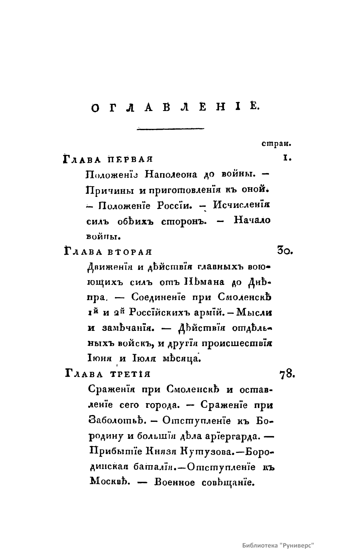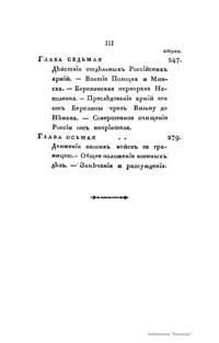 В книге описана освободительная война России против Наполеона Бонапарта. «Год сей пребудет незабвенным в позднейшем потомстве. К побиению орд Мамая, к поражению Карла под Полтавой история приобщит отныне сокрушение сил Наполеона. Россия, сражаясь с целою Европой, познала более, нежели в другое какое время, всю великость сил своих и способов и достигла в глазах целого света величайшей, никем не оспориваемой и неувядаемой славы».