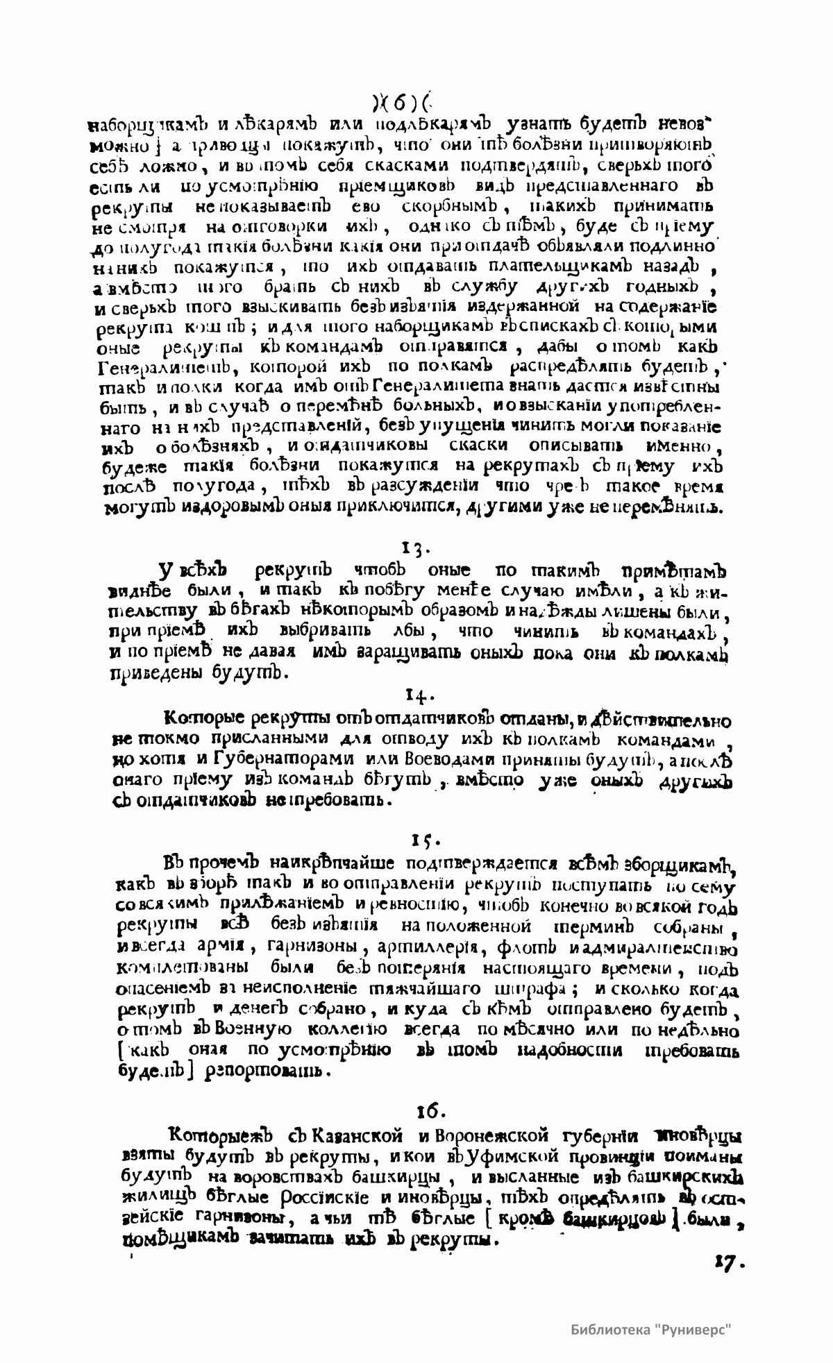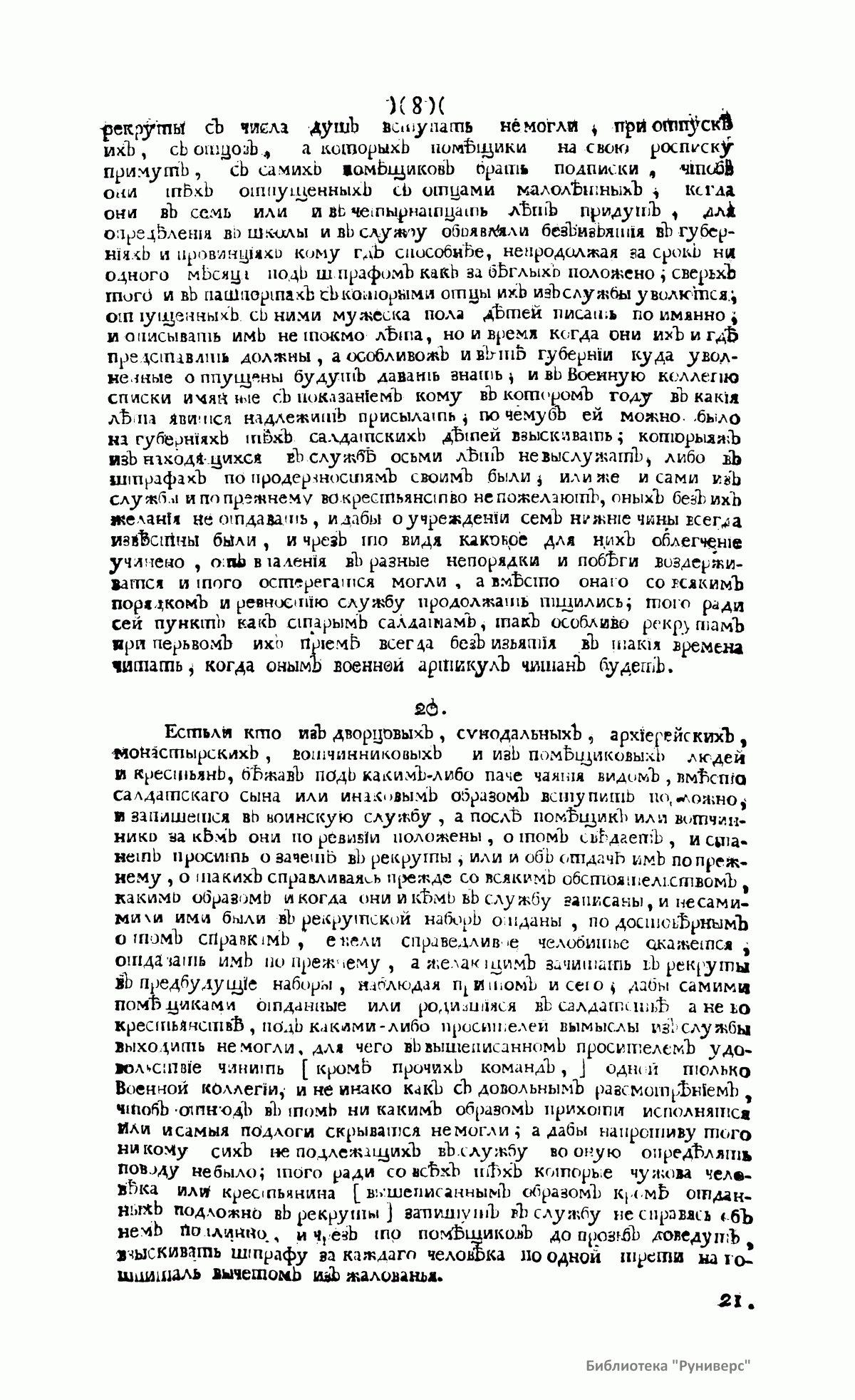 Генеральное учрежденiе. О ежегодномъ зборѣ съ государства рекрутъ, о командированiи для прiема оныхъ конвоевъ, и во отвращенiе всякихъ при томъ неполезностей, о штрафахъ и наказанiяхъ за вины, кто какъ въ приемѣ такъ и въ отдачѣ неистинною поступать будетѣ