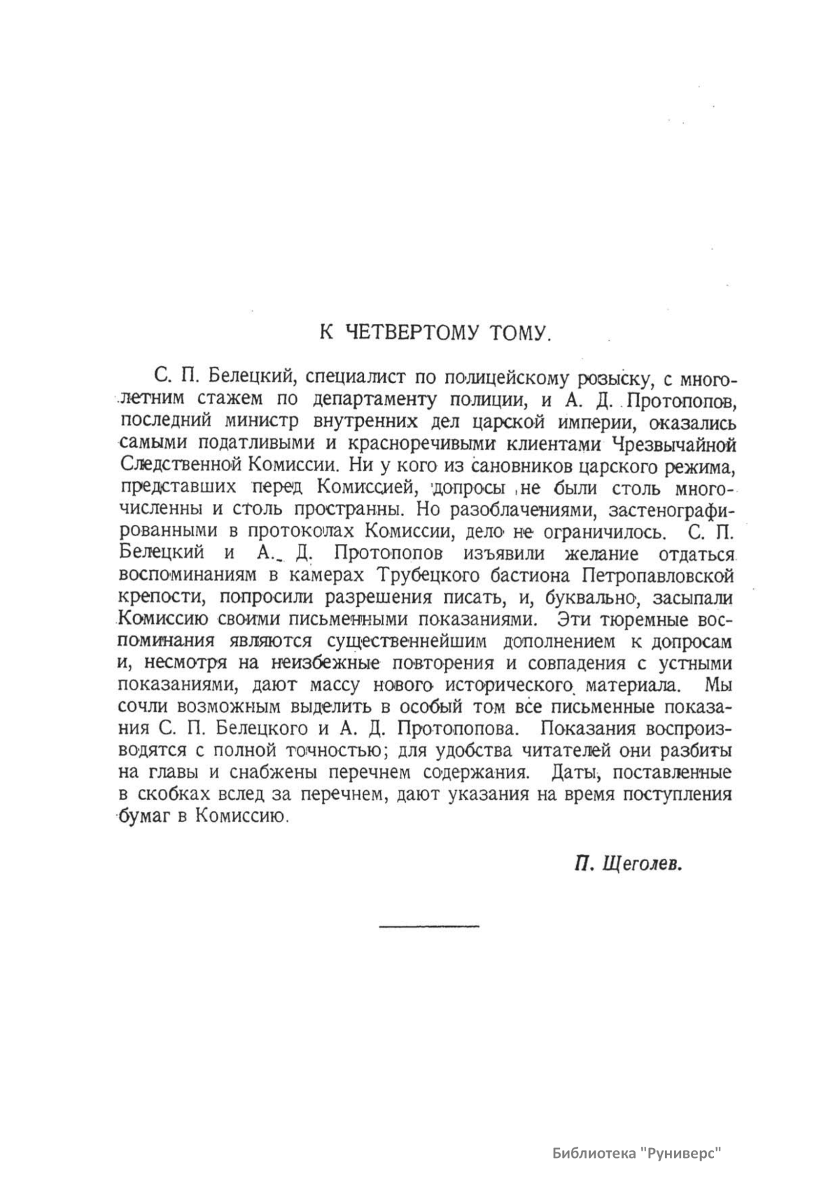 В издании опубликованы стенографические отчеты допросов и показаний, данных в 1917 г. в чрезвычайной следственной комиссии временного правительства. В VII томе (стр. 299) находится именной указатель ко всем томам. Чрезвычайная следственная комиссия Временного правительства для расследования противозаконных по должности действий бывших министров, главноуправляющих и прочих высших должностных лиц как гражданского, так и военного и морского ведомств – чрезвычайный следственный орган, учрежденный временным правительством после февральской революции. 5 марта (ст. ст.) 1917 г. был опубликован указ Временного правительства о создании ЧСК – в октябре 1917 г. расследования ЧСК фактически прекратились, в чем далеко не последнюю роль сыграл приход к власти партии большевиков. В современной исторической литературе разработка темы ЧСК находится лишь в начальной стадии.