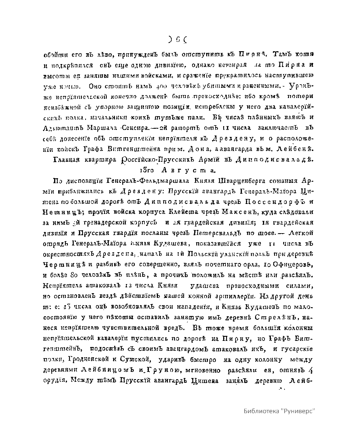 Журналъ Военныхъ движенiй и дѣйствiй Россiйско-императорскихъ и королевско Прусскихъ армiй со времени прекращенiя послѣдняго между ими и Армiями Французскими перемирiя т.е. с 5/17 Августа 1813 года
