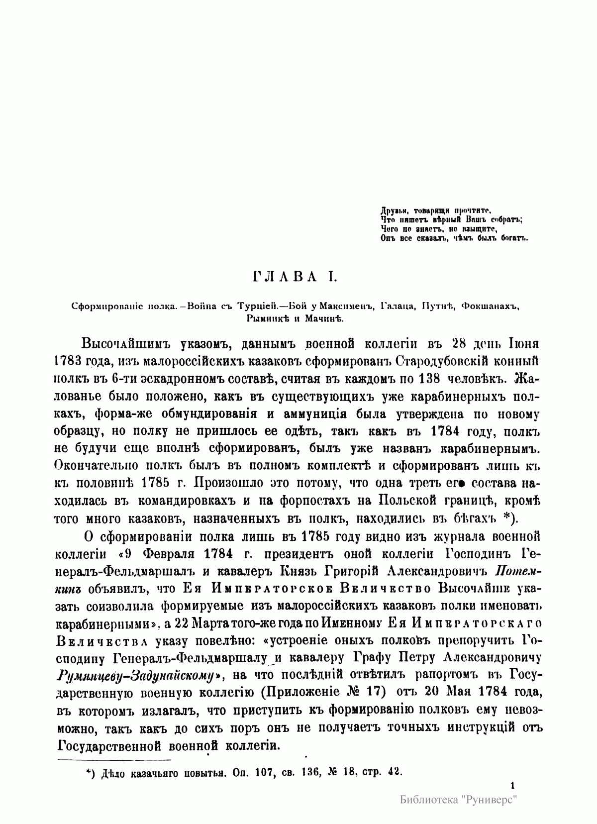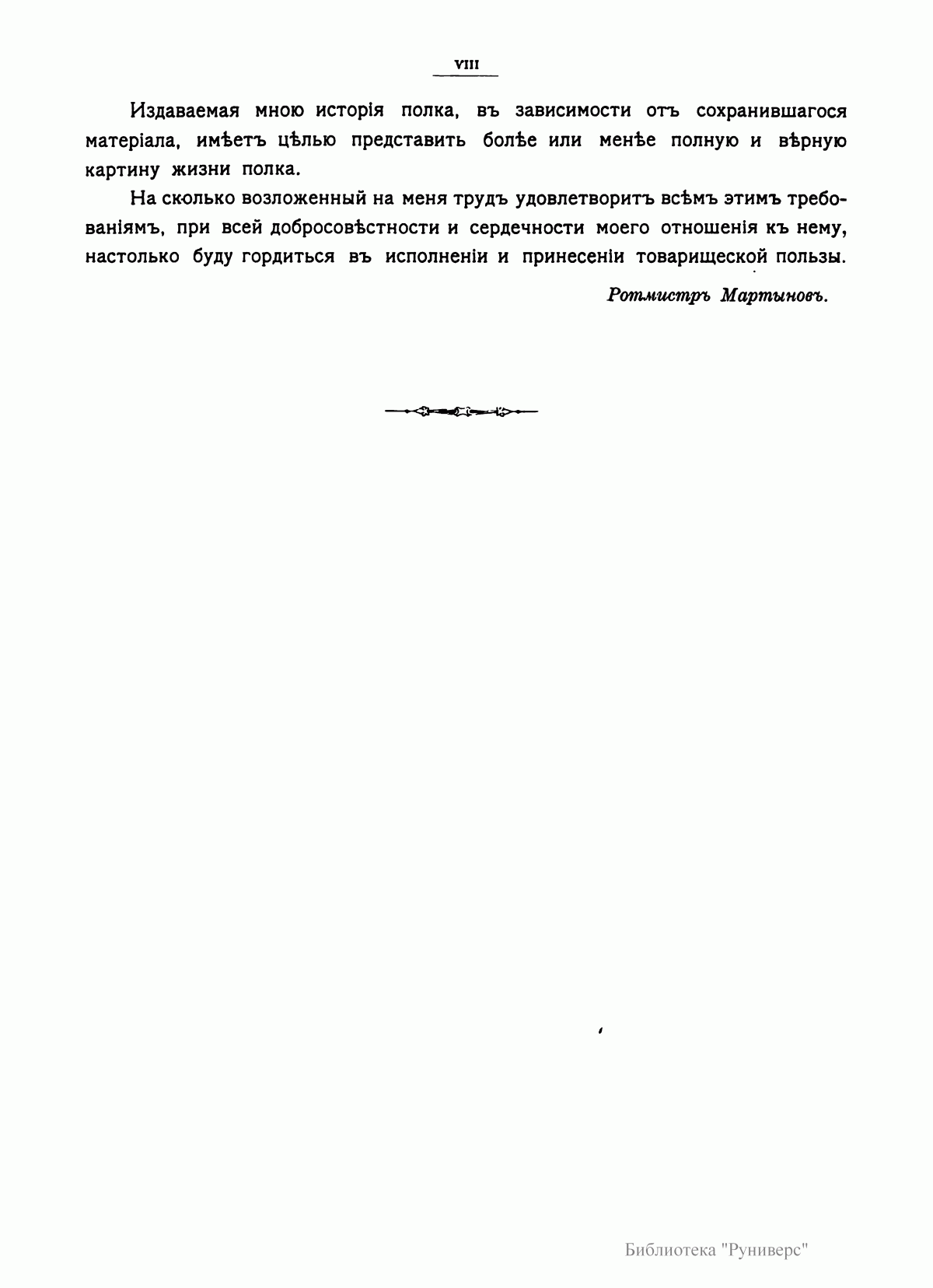 Автор, бывший офицер полка ротмистр Мартынов, в своей книге излагает историю полка с 1783 г., когда Высочайшим указом из малороссийских казаков сформирован Стародубовский конный полк в 6-эскадронном составе, по 1906 г. «В течение своей 126-летней жизни Стародубовский полк перенес много преобразований и, гордо стоя на высоте величия, заявил себя массою доблестных подвигов на поле брани, которые я, по силе возможности и скудным данным, постараюсь здесь изложить, наглядно показывая, что сделал Стародубовский воин на пользу царю, отечеству и радость потомкам».