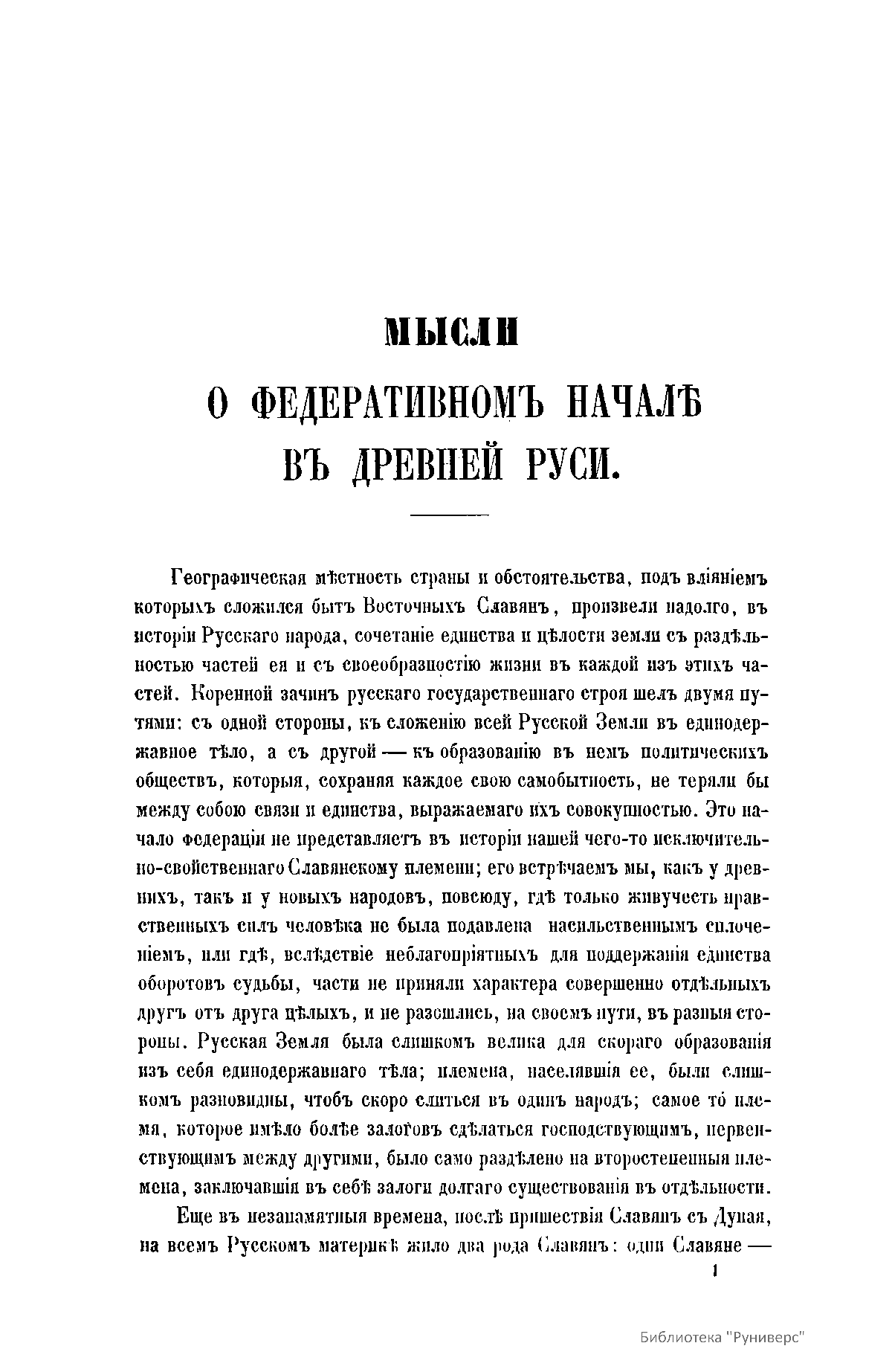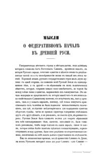 В брошюре автор рассматривает положение о том, что вся история Руси удельного уклада есть постепенное развитие федеративного начала, но вместе с тем и борьбы его с началом единодержавия. «Начала, соединяющие земли между собой, хотя и были достаточны для того, чтобы не допустить эти земли распасться и каждой начать жить совершенно независимо от других, но не настолько были сильны, чтобы заглушить всякое местное проявление и слить все части в одно целое. И природа, и обстоятельства исторические – все вело жизнь русского народа к самобытности земель, с тем чтобы между всеми землями образовалась и поддерживалась неустанно связь».