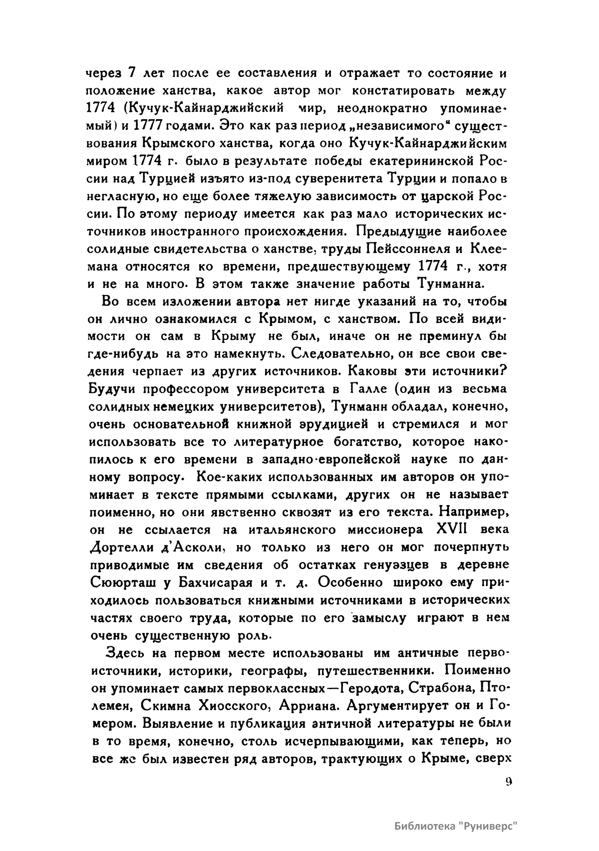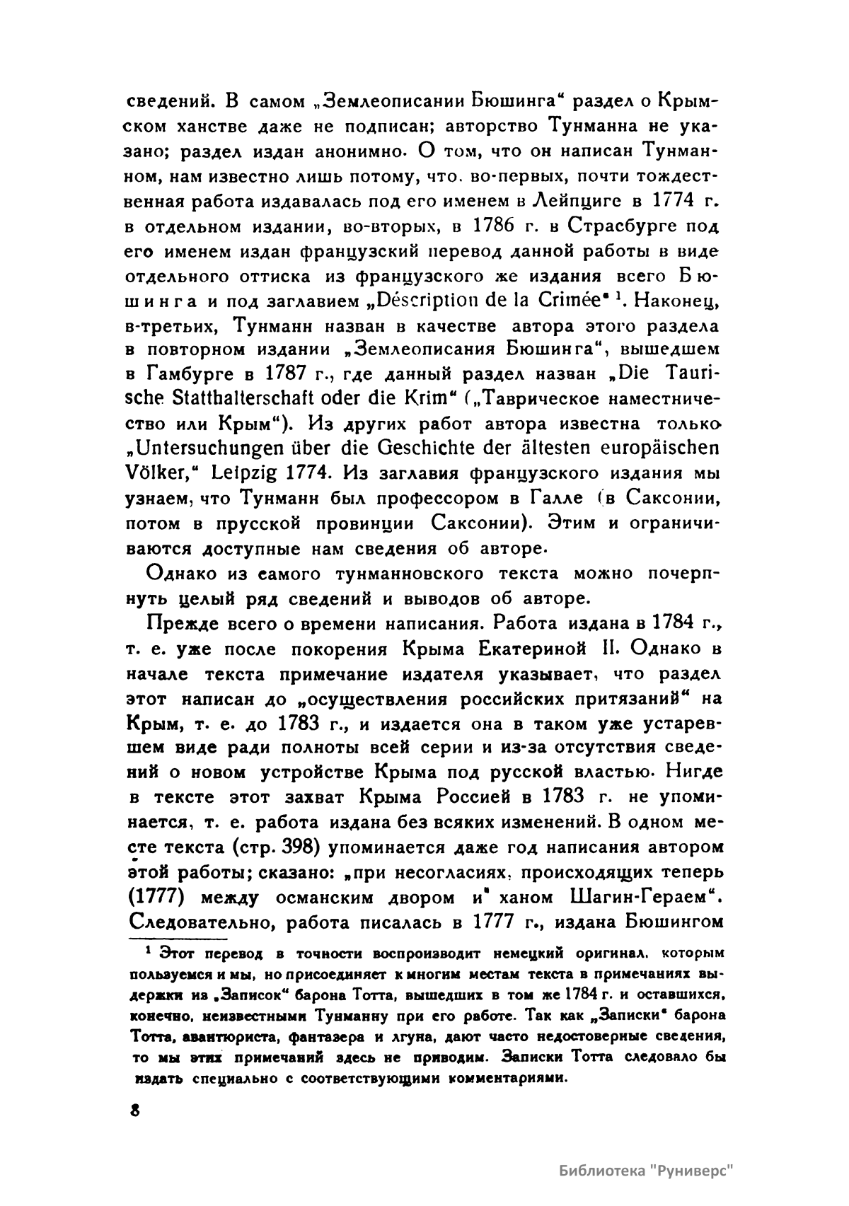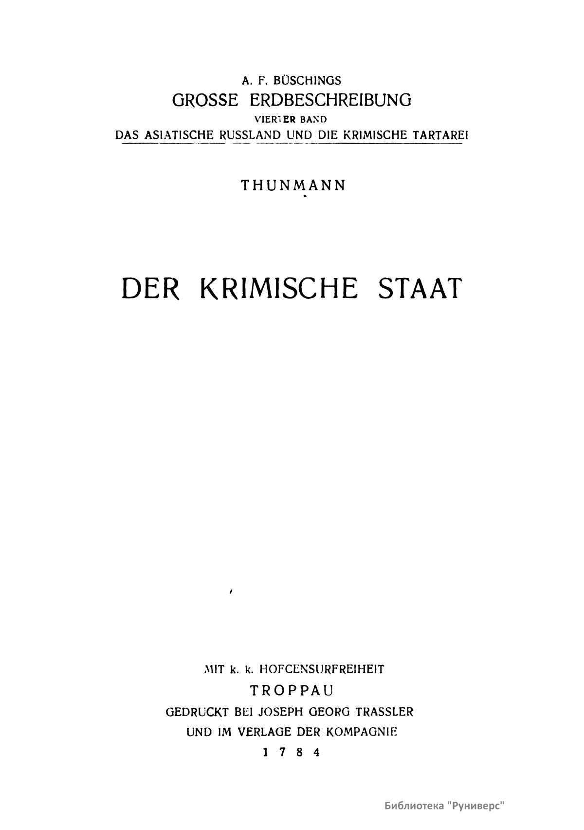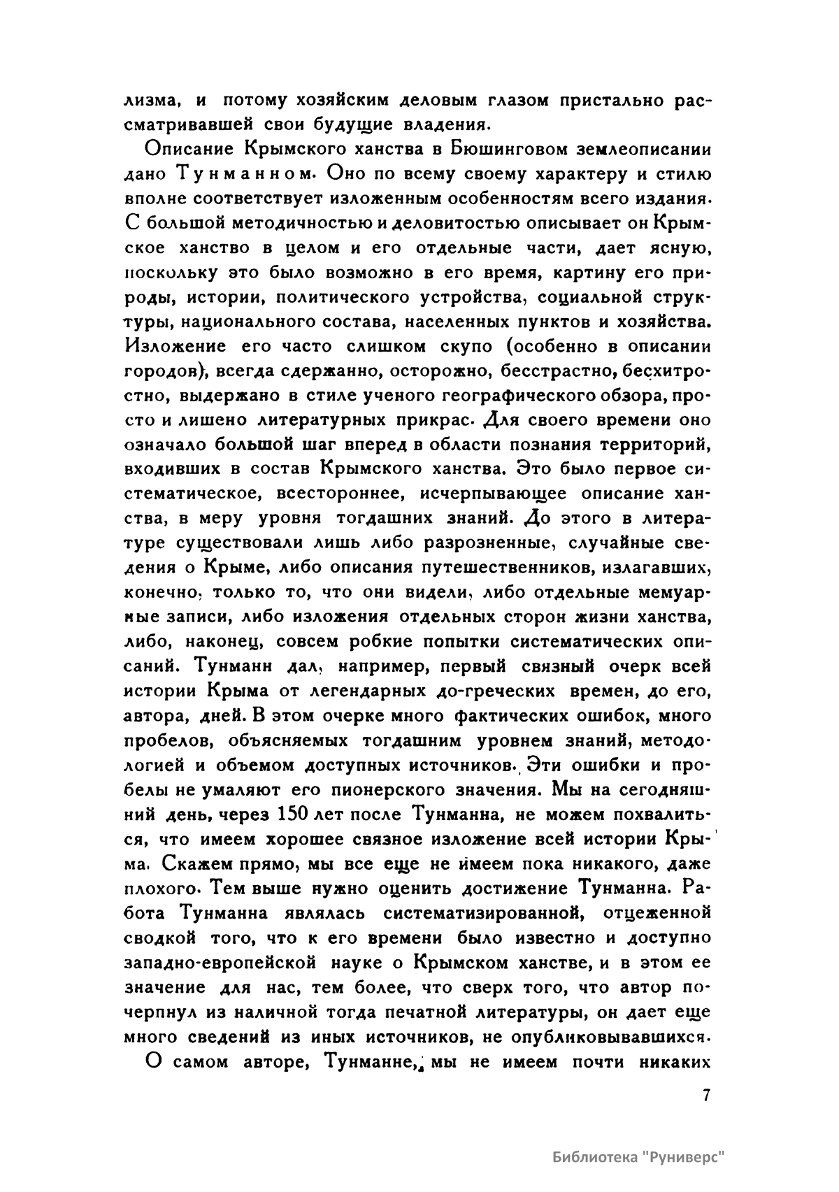 Перевод с немецкого издания 1784 г. из географической серии «Большое землеописание» издателя Бюшинга. Первое всесторонне, систематическое, исчерпывающее описание Крыма в том состоянии, в каком он был до осуществления российских притязаний на него (1783), в меру уровня тогдашних знаний. Работа писалась в 1777 г. Автор (Тунманн – профессор университета в Галле – Саксония) методично описывает ханство в целом и отдельные его части, дает ясную картину его природы, истории, политического устройства, социальной структуры, национального состава, населенных пунктов и хозяйства. Изложение выдержано в строгом «ученом» стиле. В книге нигде нет указаний на то, что автор лично знакомился с Крымом. Все свои сведения он черпает из разнообразных источников, которые накопились к его времени в западноевропейской науке. В разделе современного автору положения ханства, он пользуется непечатными материалами. Это архивные сведения и устные данные, которые он получал от негоциантов, дипломатов, военных и путешественников.