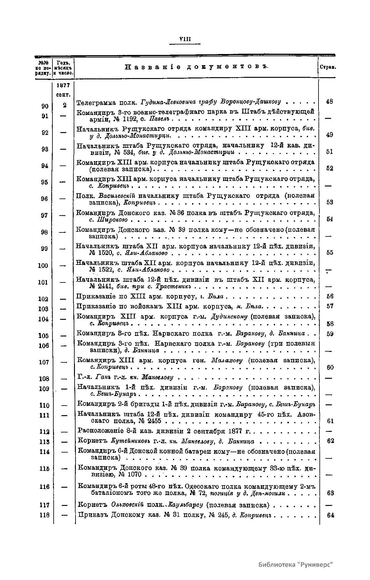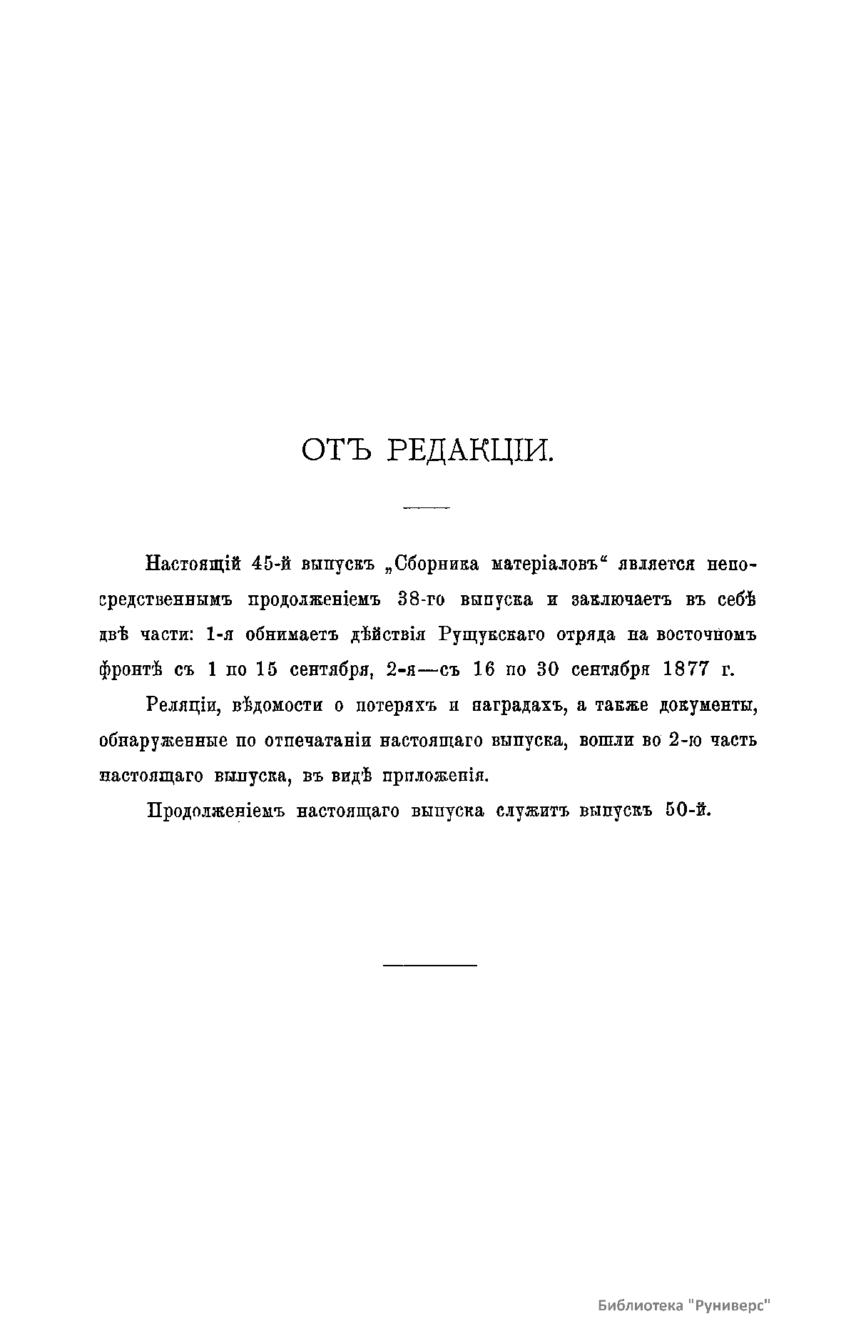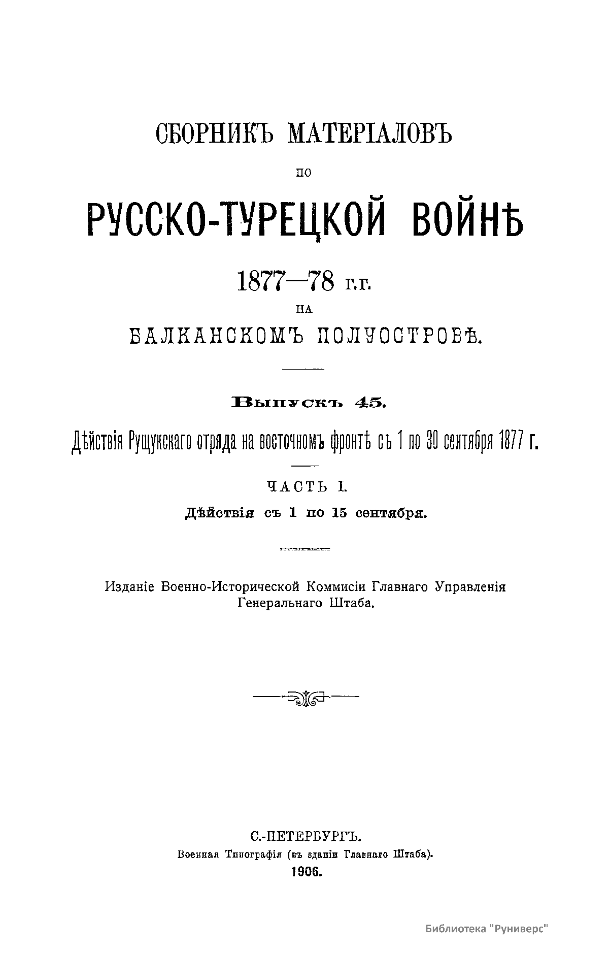 Сборникъ матерiаловъ по русско-турецкой войнѣ 1877-1878 г.г. на Балканскомъ полуостровѣ. Выпускъ 45. Дѣйствiя Рущукскаго отряда на восточномъ фронтѣ съ 1 по 30 сентября 1877 г. Часть I. Дѣйствия съ 1 по 15 сентября