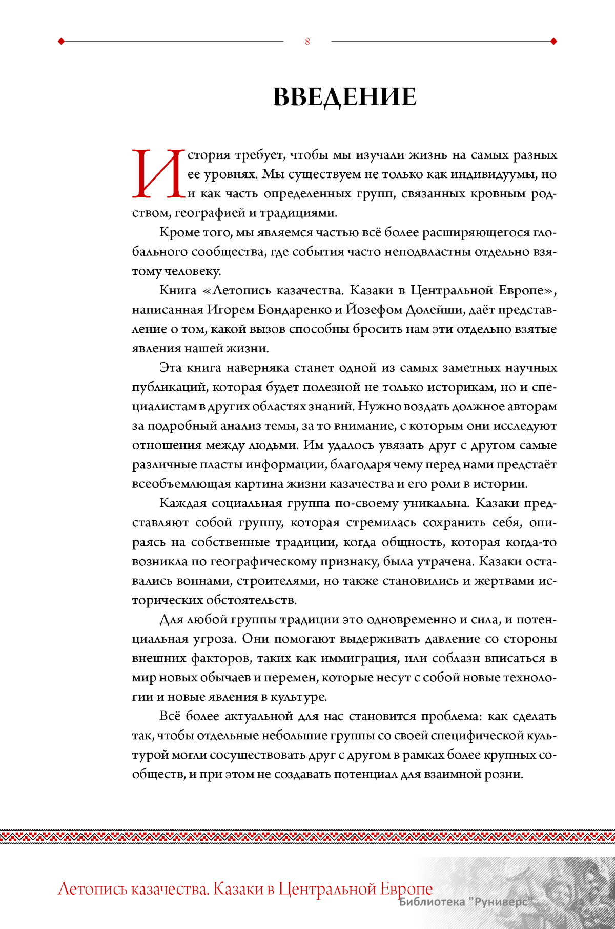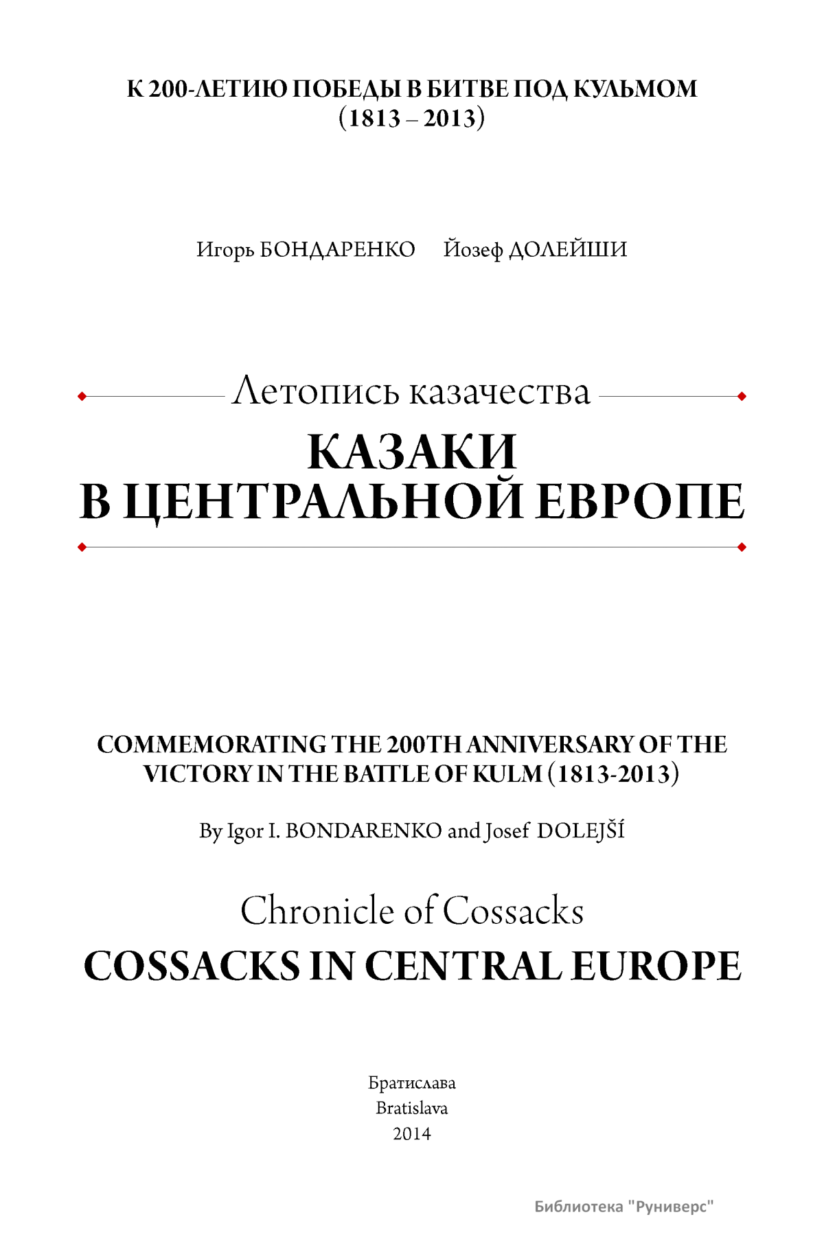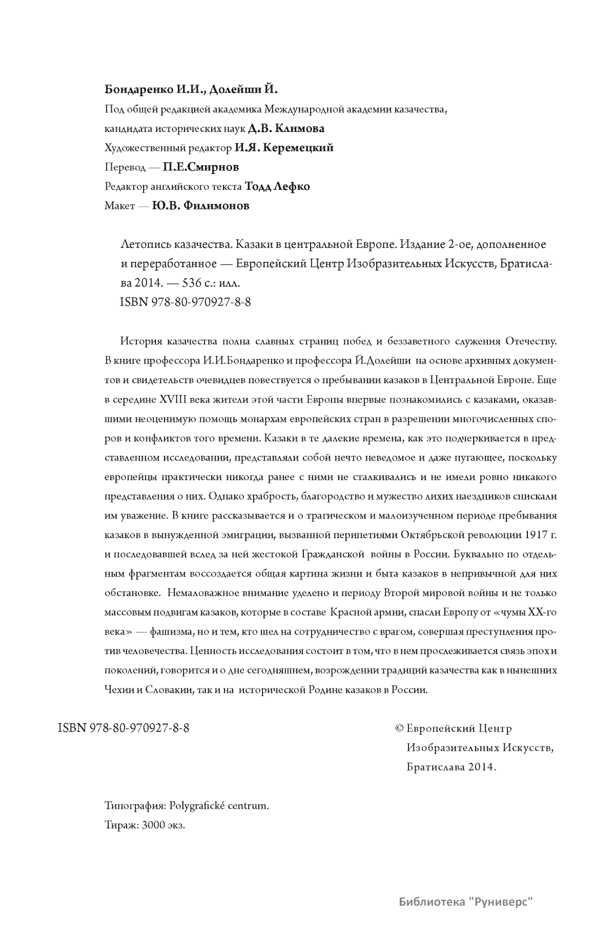 История казачества полна славных страниц побед и беззаветного служения Отечеству. В книге профессора И.И.Бондаренко и профессора И.Долейши на основе архивных документов и свидетельств очевидцев повествуется о пребывании казаков в Центральной Европе. Еще в середине XVIII века жители этой части Европы впервые познакомились с казаками, оказавшими неоценимую помощь монархам европейских стран в разрешении многочисленных споров и конфликтов того времени. Казаки в те далекие времена, как это подчеркивается в представленном исследовании, представляли собой нечто неведомое и даже пугающее, поскольку европейцы практически никогда ранее с ними не сталкивались и не имели ровно никакого представления о них. Однако храбрость, благородство и мужество лихих наездников снискали им уважение. В книге рассказывается и о трагическом и малоизученном периоде пребывания казаков в вынужденной эмиграции, вызванной перипетиями Октябрьской революции 1917 г. и последовавшей вслед за ней жестокой Гражданской войны в России. Буквально по отдельным фрагментам воссоздается общая картина жизни и быта казаков в непривычной для них обстановке. Немаловажное внимание уделено и периоду Второй мировой войны и не только массовым подвигам казаков, которые в составе Красной армии, спасли Европу от «чумы ХХ-го века» — фашизма, но и тем, кто шел на сотрудничество с врагом, совершая преступления против человечества. Ценность исследования состоит в том, что в нем прослеживается связь эпохи поколений, говорится и о дне сегодняшнем, возрождении традиций казачества как в нынешних Чехии и Словакии, так и на исторической Родине казаков в России.