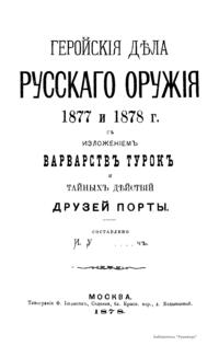 Геройскiя дѣла русскаго оружiя 1877 и 1878 г. съ изложенiемъ варварствъ турокъ и тайныхъ дѣйствiй друзей Порты