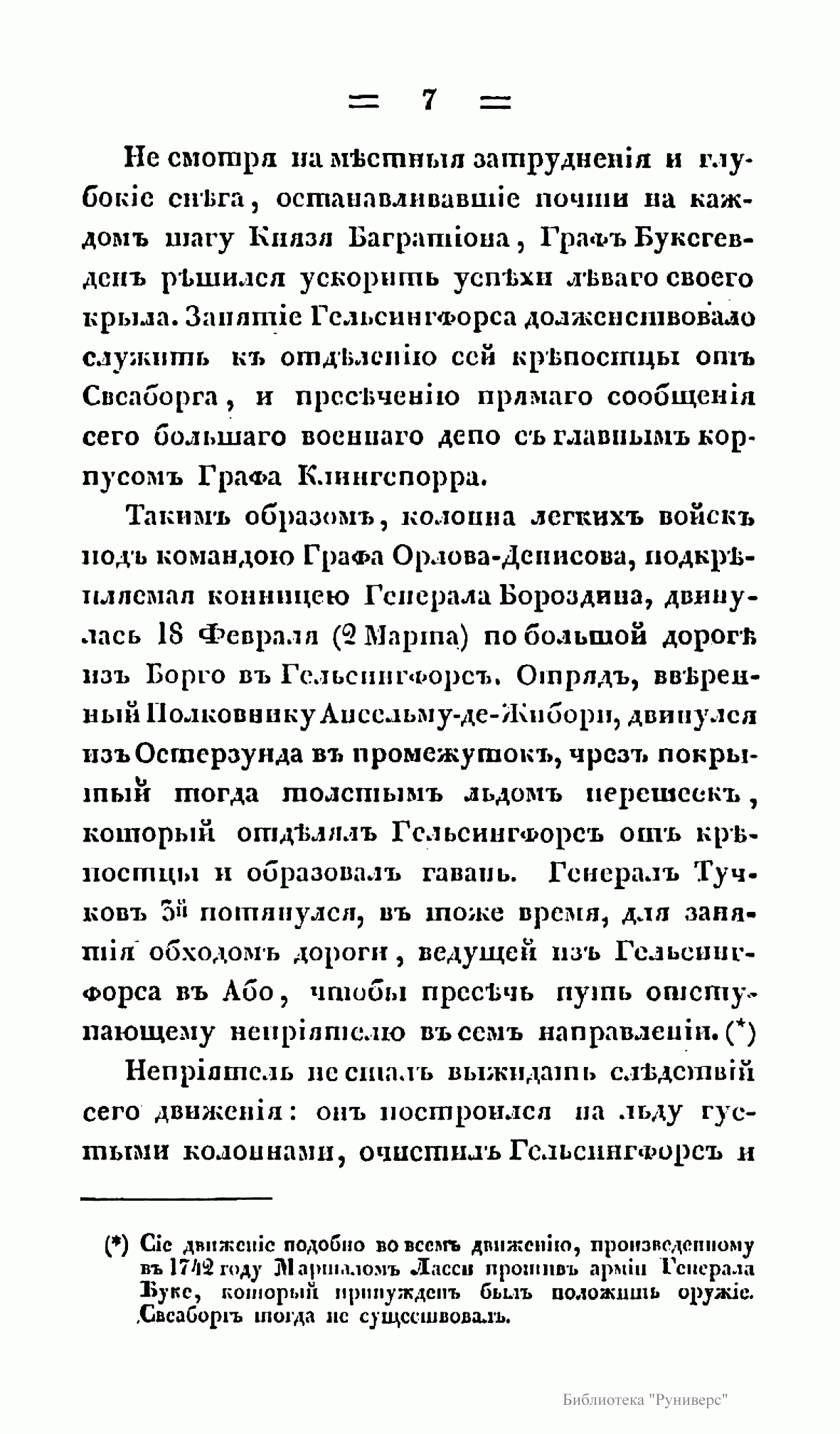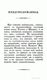 Русско-шведская война 1808-1809 гг. вызвана стремлением России в условиях начавшейся в 1807 г. войны с Великобританией установить полный контроль над финским и Ботническим заливом в целях обеспечения безопасности Петербурга. Тильзитский мир 1807 г. поставил Швецию перед дилеммой: присоединиться, как и Россия, к континетальной блокаде и тем самым поставить под удар британского флота свою морскую торговлю и отказаться от английского рынка, либо сохранить традиционный союз с Великобританией и пойти на конфлиут с Россией. Король Густав IV Адольф взял курс на разрыв с Россией, хотя Швеция не была готова к войне. В результате этой войны по Фридрихгамскому мирному договору к России отошла Финляндия. Автор книги «принимает на себя труд заплатить достойную дань воинским доблестям двух наций» и надеется, что «изложение военных событий будет занимательным».