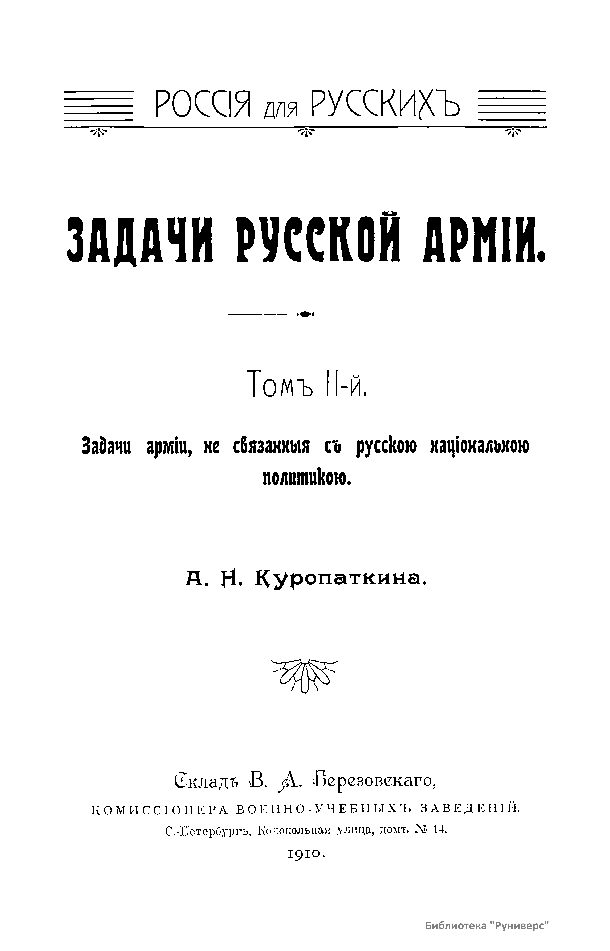 Задачи русской армiи. Томъ II-й. Задачи армiи, не связанныя съ русскою нацiональною политикою