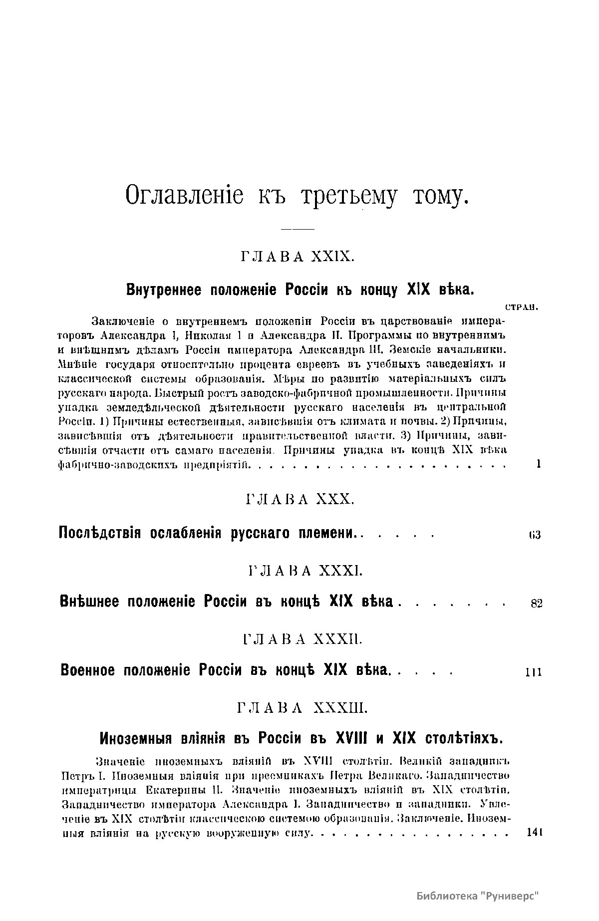 В настоящем издании автор рассуждает об исторических путях России и будущих задачах русской армии. В первом томе изложены задачи русской армии в XV – XVIII вв., выполненные ею в целях объединения русского племени и расширения пределов России до естественных рубежей: морей Балтийского, Черного и Каспийского, океанов Ледовитого и Восточного. Здесь говорится о том, какие русскому народу потребовались усилия, чтобы выйти победителем из борьбы с татарами, литовцами, поляками, ливонцами, шведами, турками и создать могущественное русское государство. По мнению автора, основными двигателями к подвигу во все века были: глубокая вера, преданность царю и любовь к родине. Во второй том вошли главным образом войны в начале XIX столетия с Наполеоном I и войны освободительного характера на Балканском полуострове. Главное внимание правительственной власти в это время ушло на устройство европейских дел, в том числе и на устройство на Балканском полуострове независимых государств. Автор считает, что такая политика, а также западные влияния пошли в ущерб русскому племени и способствовали отсталости России в материальном и духовном отношении от европейских государств. В третьем томе говорится о положении России к концу XIX в. и намечены главные задачи России и русской армии в XX в. Для того чтобы эти задачи были выполнены, необходимо, по мнению автора, вернуться к русской национальной политике.