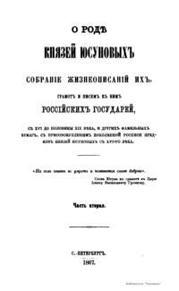 О роде князей Юсуповых, собрание жизнеописаний их, грамот и писем к ним российских государей, с XVI до половины XIX века и других фамильных бумаг, с присовокуплением поколенной росписи предков князей Юсуповых с XIV-го века. Часть вторая
