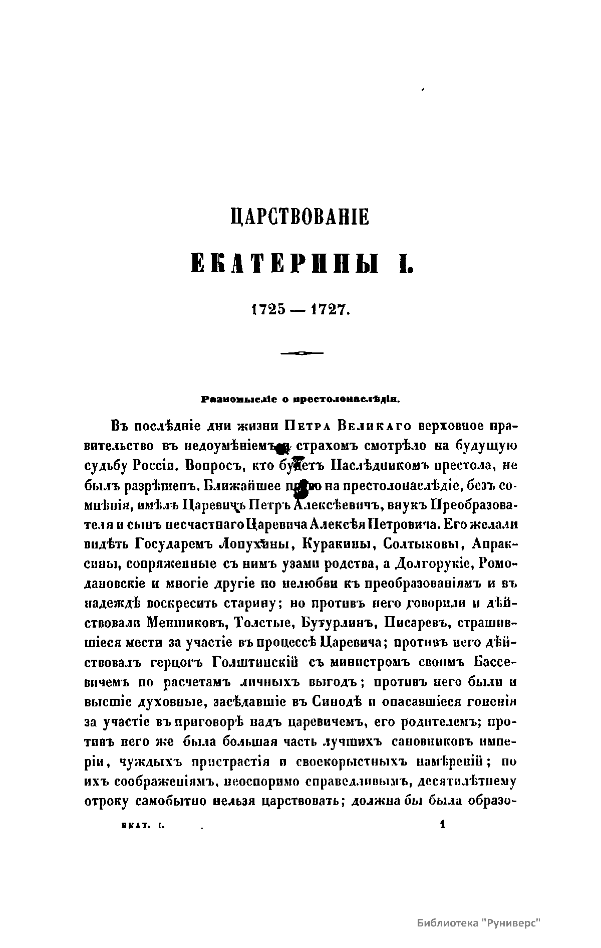 Небольшое исследование царствования Екатерины I (1725 – 1727). Автор показывает, что во все время своего царствования Екатерина следовала по пути, указанному России великим ее преобразователем Петром I.