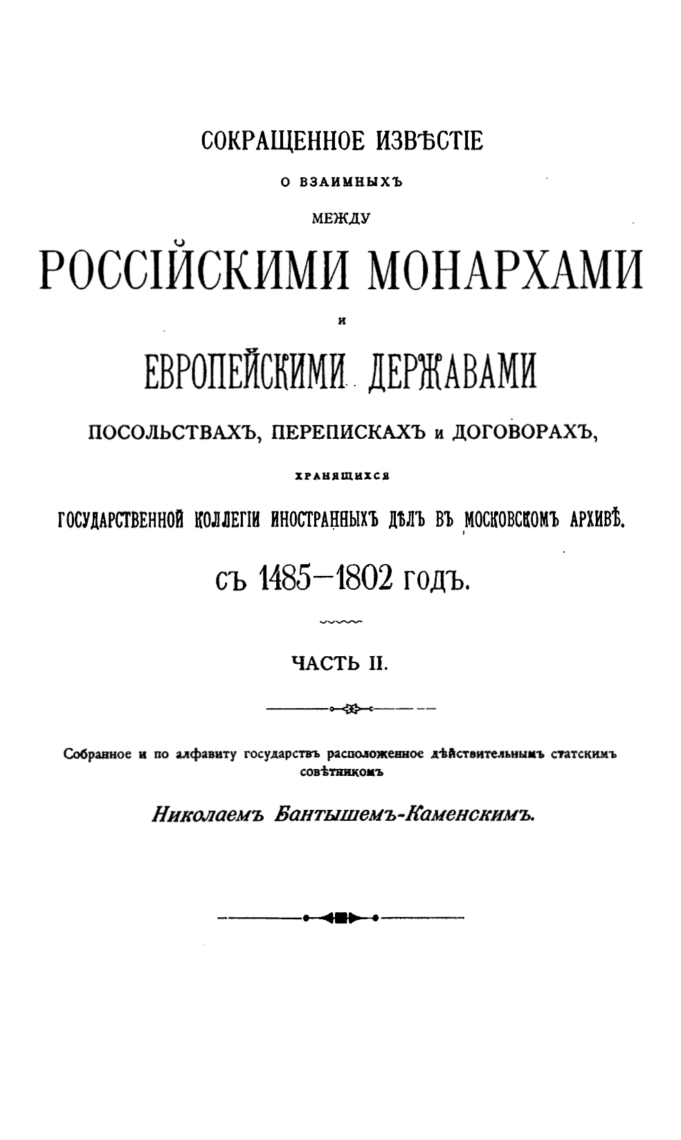 Посмертное издание ключевого труда бессменного (в течение почти 50 лет) археографа и управляющего Московским Главным архивом коллегии иностранных дел - систематизированное изложение документов о посольствах между российскими монархами и европейскими державами, дипломатической переписки и договоров.