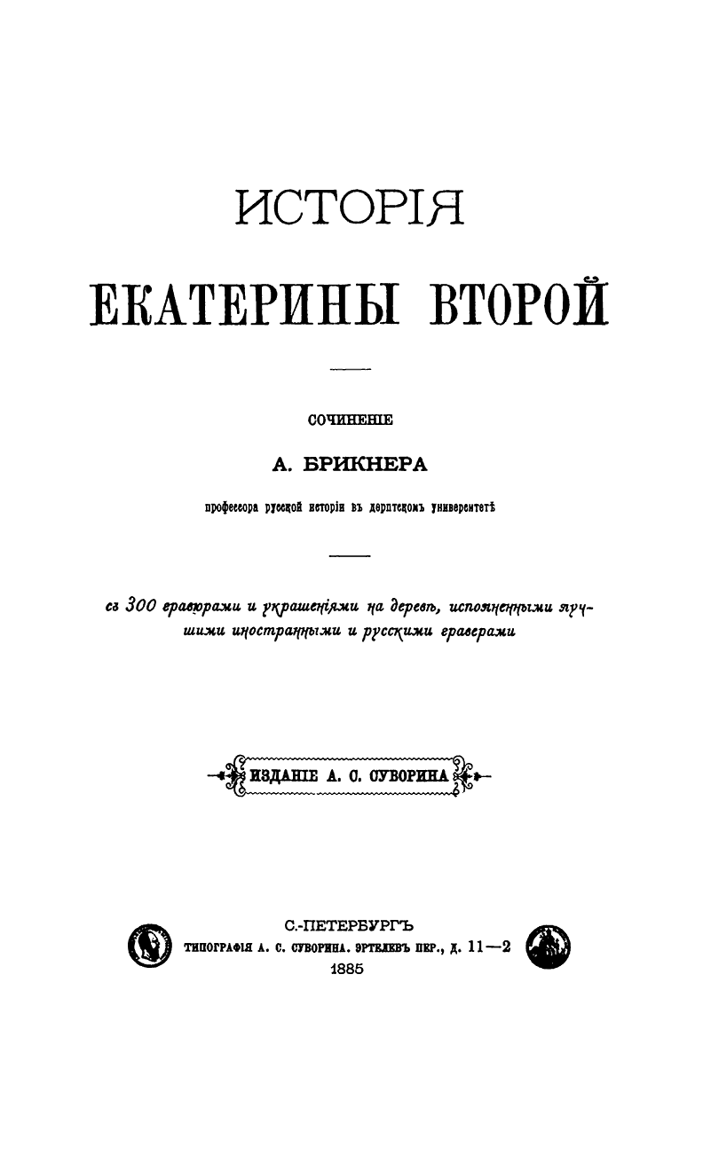«История Екатерины II» - наиболее крупная из многочисленных работ Брикнера, относящихся к екатерининской эпохе, была также издана сначала в 1883 г. по-немецки в журнале-альманахе В. Онкена «Allgemeine Geschichte» (Всеобщая история), а в 1885 г. – вышла уже в русской переделке, включающей более 300 превосходных гравированных иллюстраций.