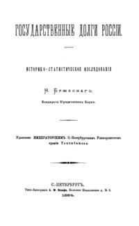 В своей первой большой научной работе, Н.К. Бржеский впервые собирает воедино и анализирует отрывочные сведения о возникновении, развитии, составе и формах государственных долгов России, начиная с долгов Московских государей и заканчивая имперскими займами второй половины XIX века.