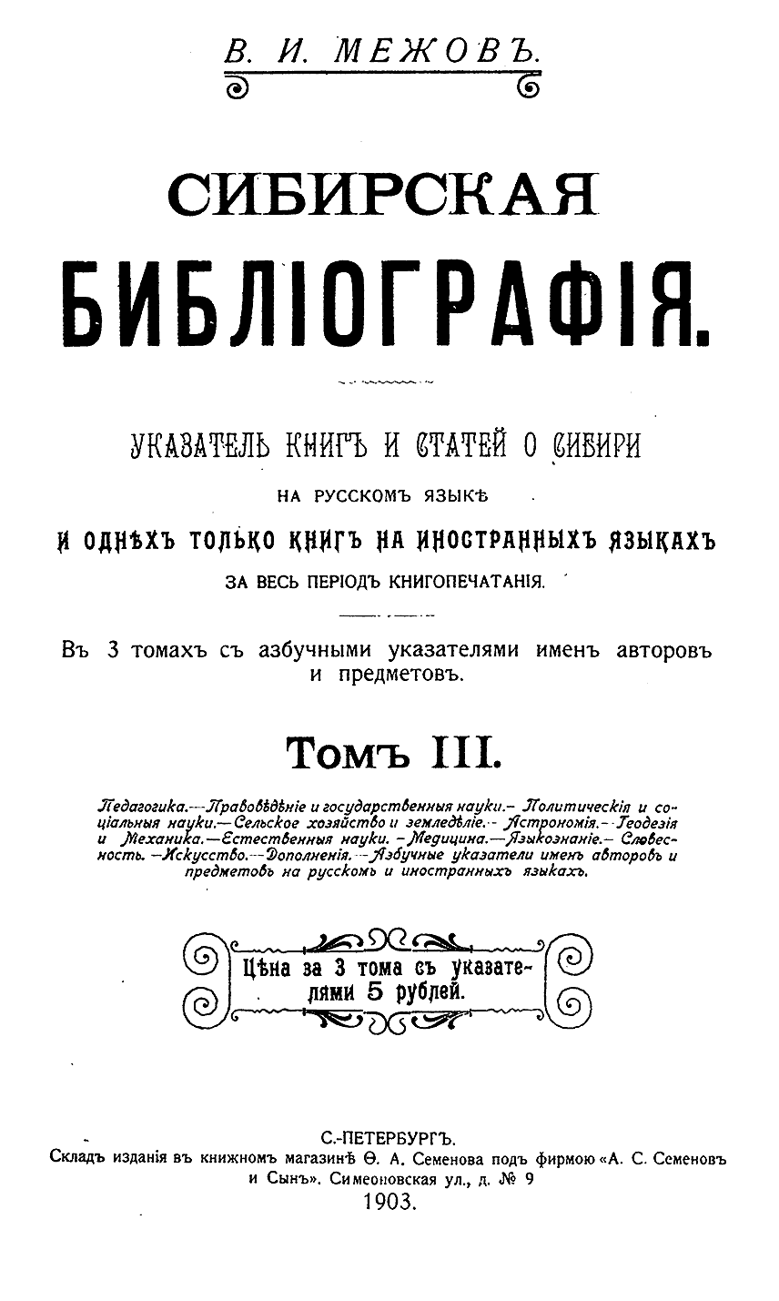 Сибирская библiографiя. Указатель книгъ и статей о Сибири на русскомъ языкѣ и однѣх только книгъ на иностранныхъ языкахъ за весь перiодъ книгопечатанiя