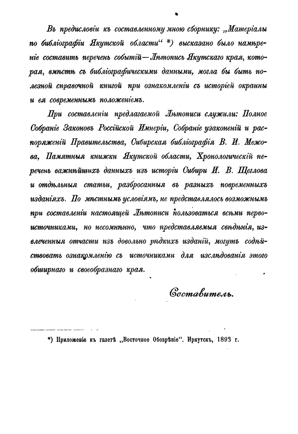 При составлении летописи автор по его собственному признанию не имел возможности «по местным условиям» пользоваться первоисточниками и поэтому использовал: Полное собрание законов Российской империи, Собрание узаконений и распоряжений Правительства, «Сибирскую библиографию» В.И. Межова, Памятные книжки Якутской области, Хронологический перечень важнейших данных из «Истории Сибири» И.В. Щеглова и отдельные статьи, найденные в современных ему изданиях