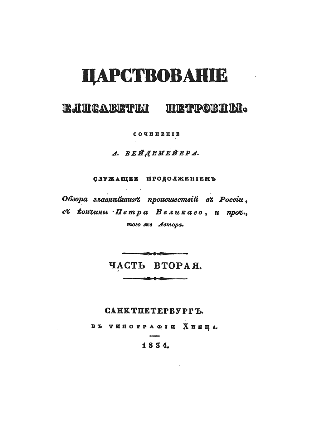 В книге Александра Ивановича Вейдемейера, получившего известность, благодаря циклу исторических заметок, охватывающих период от Смутного времени до вступления на престол Павла I, описываются события русской истории периода правления императрицы Елизаветы Петровны – с 1741 г. по конец 1761 г., а также краткий обзор деяний Петра III.