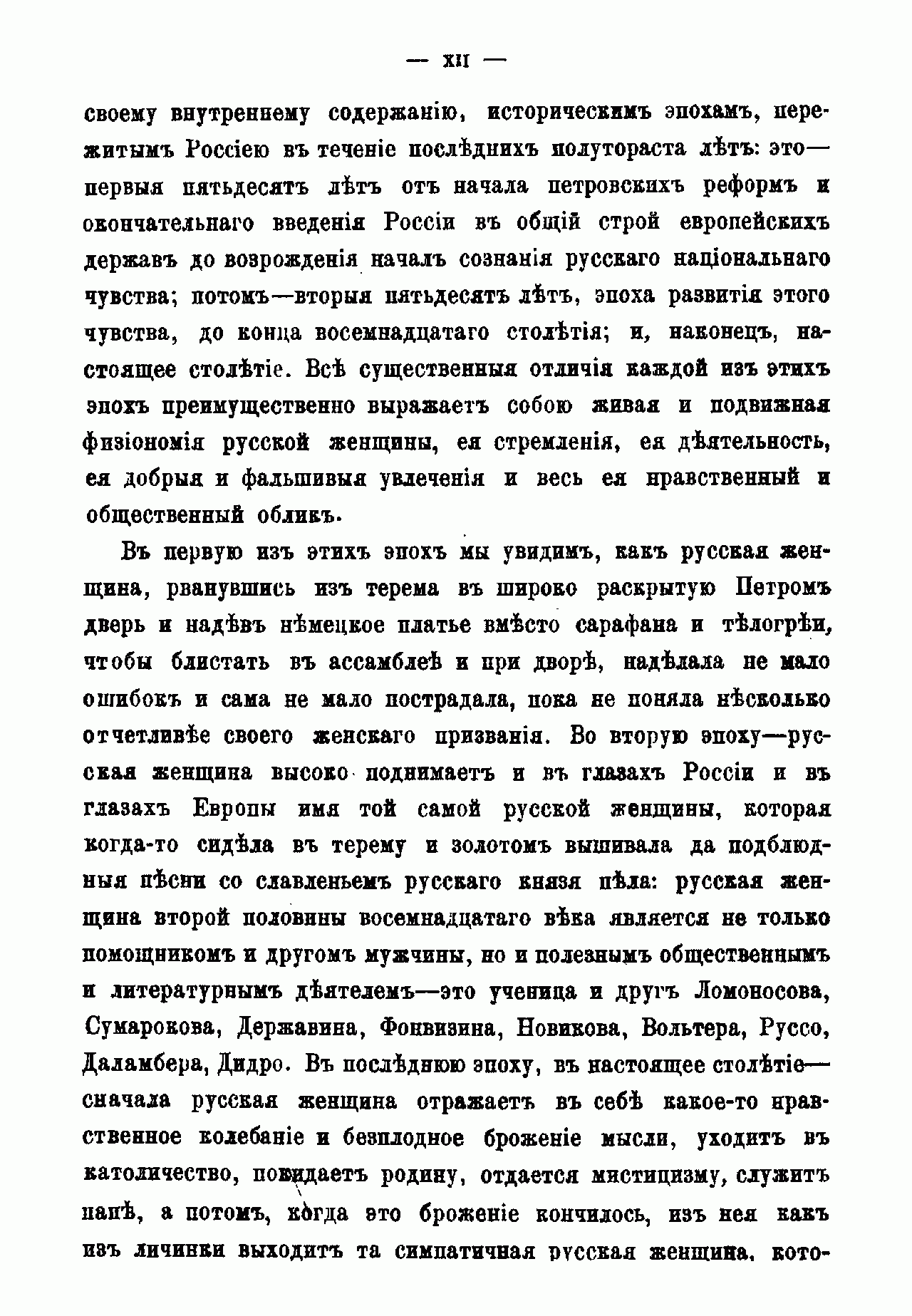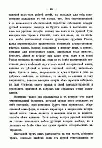 По мнению автора книги, история русской женщины не только пополняет русскую историю вообще, но и уясняет её больше, чем вся сумма прочих исторических материалов. Каков характер и направление исторической эпохи, такой является и женщина едва ли не исключительнее, чем мужчина. Труд Д. Мордовцева состоит из трёх частей – сообразно трём заметно друг от друга отличающимся историческим эпохам. Это первые пятьдесят лет от начала петровских реформ и окончательного введения России в общий строй европейских держав до возрождения начал сознания русского национального чувства; вторые пятьдесят лет – эпоха развития этого чувства – до конца восемнадцатого столетия; девятнадцатое столетие. Настоящая книга посвящена женщине первой половины восемнадцатого века. Читатель увидит, как русская женщина, «рванувшись из терема в широко раскрытую Петром дверь и надев немецкое платье вместо сарафана и телогреи, чтобы блистать в ассамблее и при дворе, наделала немало ошибок и сама немало пострадала, пока не поняла несколько отчётливее своего женского призвания». – Книга включает девятнадцать биографий.