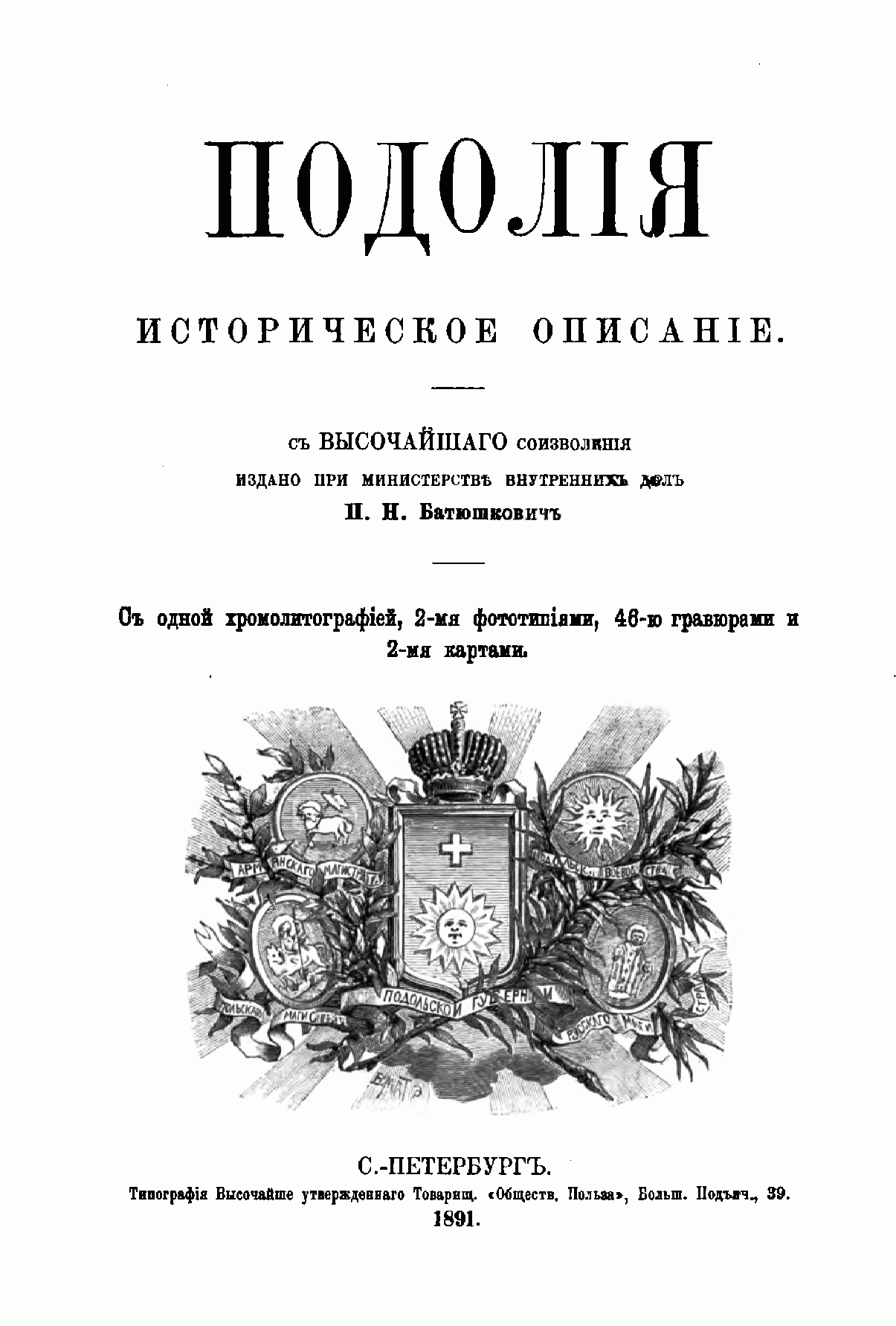Книга о Подолии (историческая область в бассейне Южного Буга и левобережья Днестра на территории современной Украины) входит в серию «Памятники русской старины в западных губерниях». Издателем книги является П. Н. Батюшков. Автор исторического очерка о Подолии – профессор Киевской духовной академии Н. И. Петров. Автор статей, поясняющих помещённые в книге рисунки, – действительный статский советник М. И. Городецкий. Также в составлении книги приняли участие многие другие лица, указанные в главе «От издателя». Н. И. Петров рассматривает следующие периоды в истории Подолии: период самостоятельного существования и стремления местных русских славян к объединению и борьбы их с кочевниками; литовско-русский период процветания русской народности под властью Литвы и борьбы с наступающим на неё полонизмом со второй половины XIV века и до люблинской унии Литвы с Польшей в 1569 году; польско-русский период, или время стремления польских начал подавить русскую народность в крае; период восстановления русской народности в крае со времени воссоединения его с Россией в 1793 году.