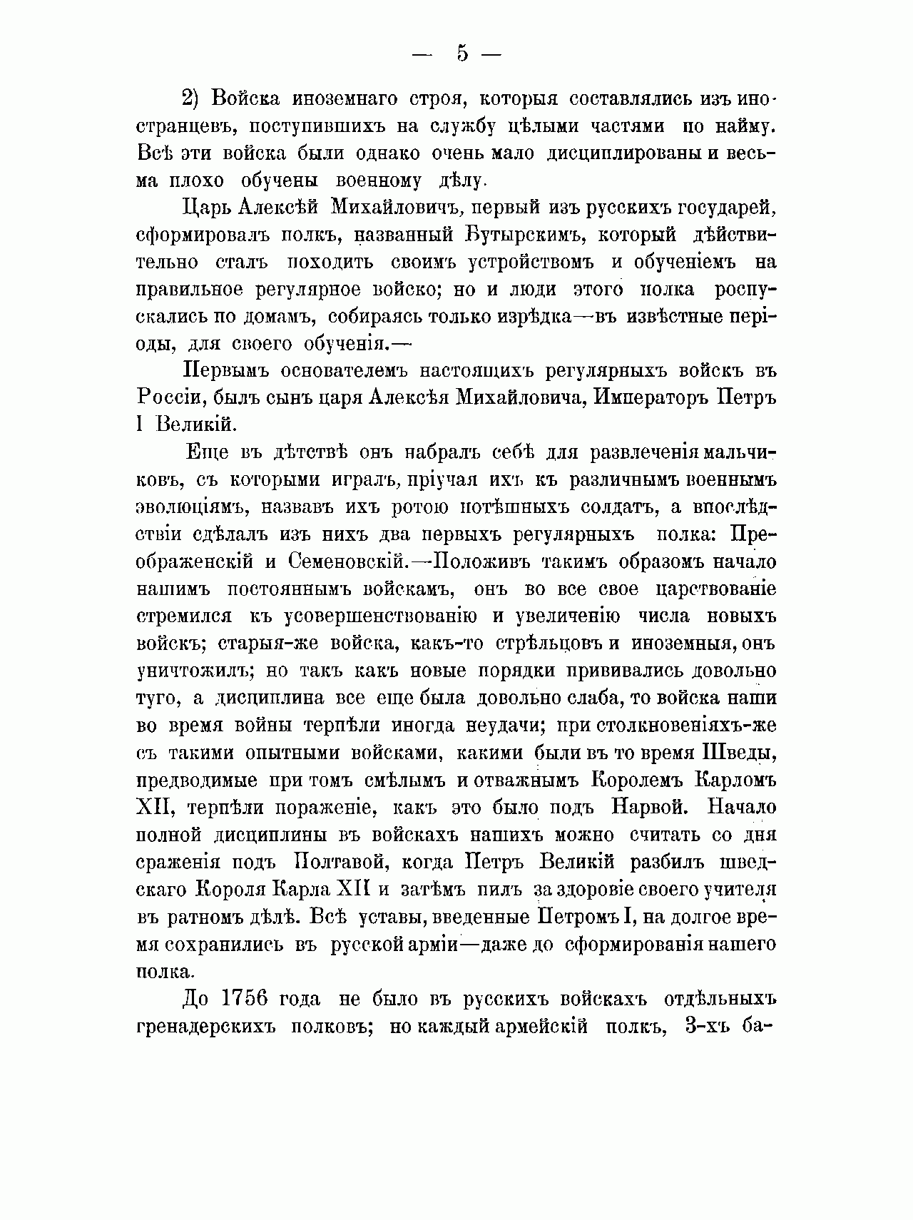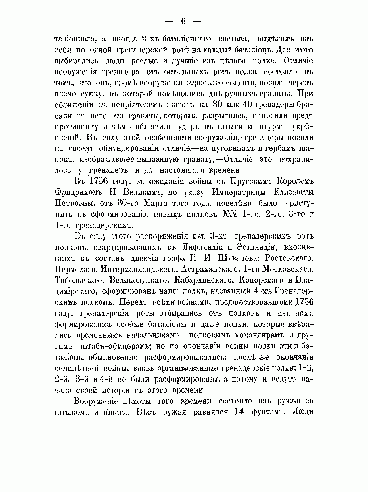 Малороссийский 10-й Гренадерский генерал-фельдмаршала графа Румянцева-Задунайского полк (это наименование он носил с 1790 г.) был сформирован по указу императрицы Елизаветы Петровны, наряду с другими четырьмя первыми в российской армии гренадерскими полками, в конце 1756 г. в связи со вступлением России в Семилетнюю войну 1756-1763 гг. Затем полк был расформирован и уже в царствование Екатерины II принимал участие в русско-турецких войнах конца XVIII – начала XIX вв., войнах с Наполеоном, Отечественной войне 1812 г. и заграничных походах, в том числе сражениях при Аустерлице, Бородине, Лейпциге и взятии Парижа, польском походе 1830-1831 гг., Крымской и русско-турецкой 1877-1878 гг. войнах.