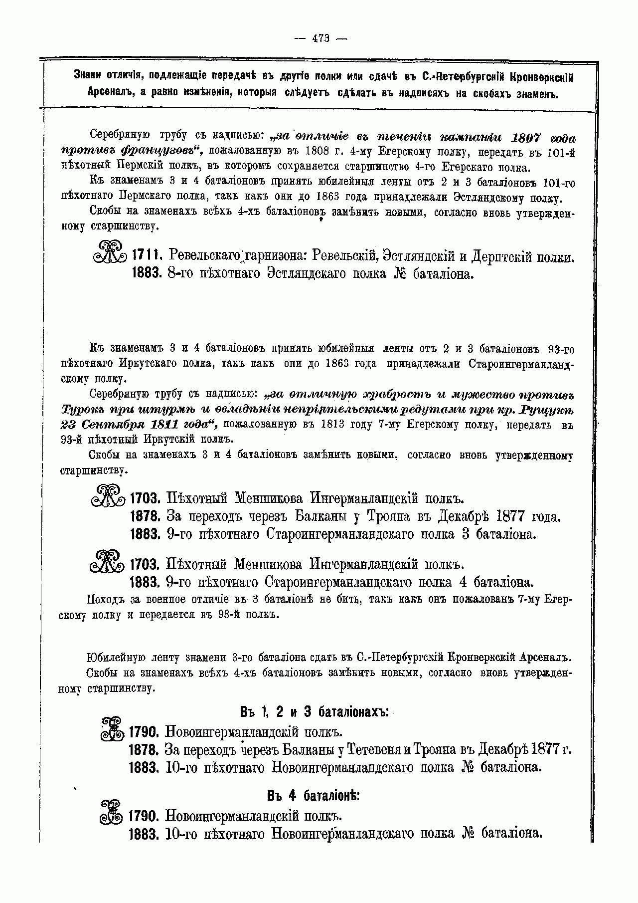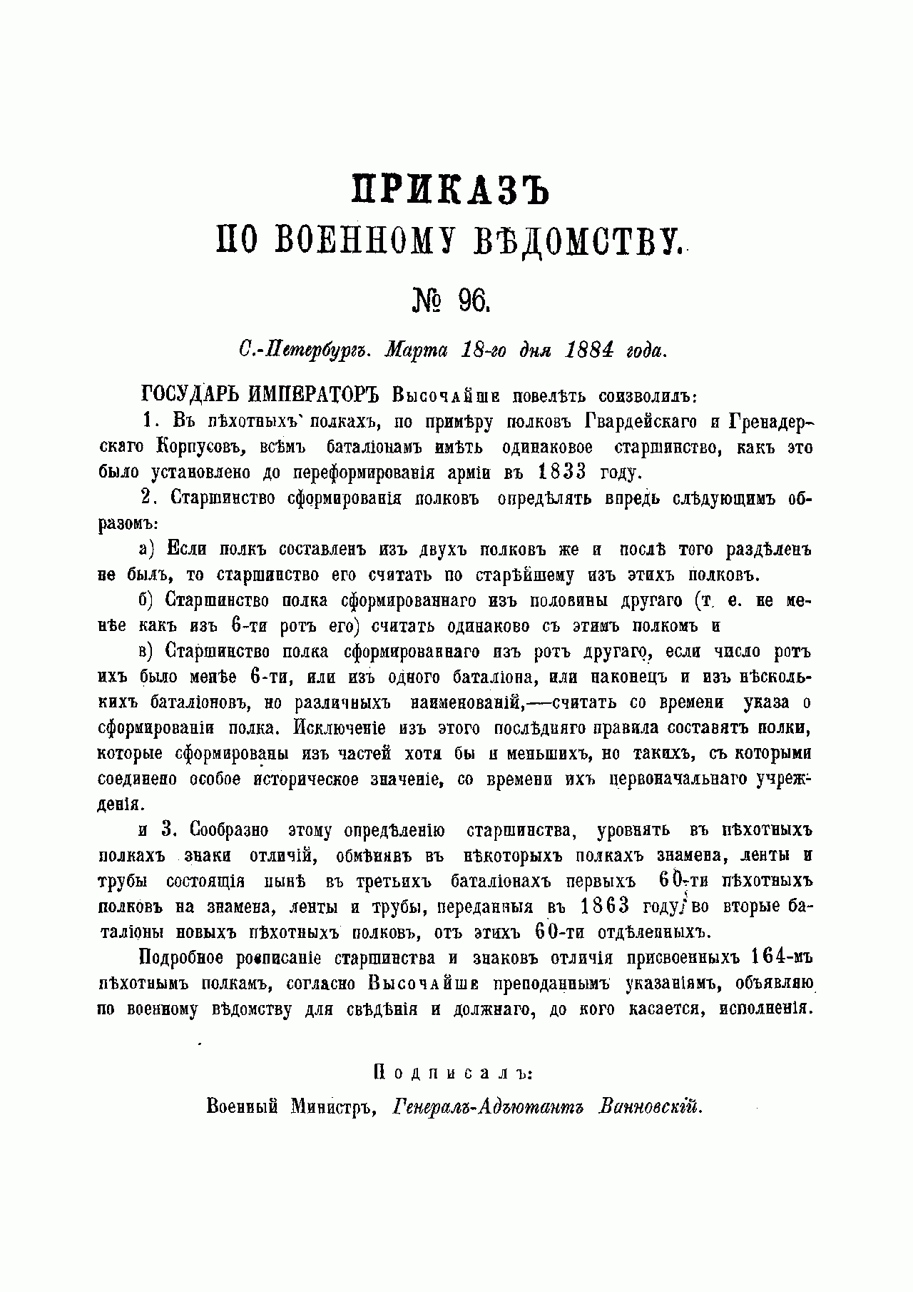 Данное издание представляет собой отдельно опубликованный Приказ по военному ведомству № 96 от 18 марта 1884 г., в соответствии с которым определялось старшинство и знаки различия всех 164-х пехотных полков Российской императорской армии, сформированных к этому времени. Этот акт был обусловлен необходимостью упорядочения исторической преемственности полковых формирований, что было уже проведено по отношению к полкам Гвардейского и Гренадерского корпусов, где всем батальонам было определено одинаковое старшинство. Приказ детально регламентирует все полковые награды и регалии, которыми награждался каждый отдельный пехотный полк за военные заслуги.