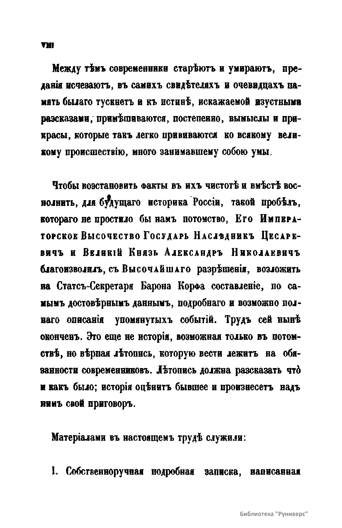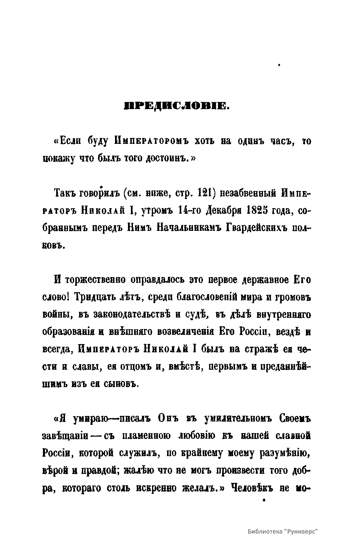 Николай I (1796 – 1855), российский император с 1825 г., третий сын Павла I. При составлении настоящего издания автор пользовался следующими источниками: I. Собственноручная подробная записка, написанная Николаем I для II. Воспоминания великого князя Михаила Павловича. III. Рассказы князя А.Н. Голицына и графа М.М. Сперанского. IV. Рассказы и частью письменные заметки живых свидетелей и деятелей 14 Царственного семейства. декабря: генерал-адъютантов графа Орлова, графа Левашова, графа Адлерберга, Перовского, Кавелина и Философова, генерала Ростовцева. воспоминания редактора. V. Рассказы некоторых других достоверных очевидцев и собственные VI. Бумаги князя В.П. Кочубея. VII. Подлинные акты Государственного совета. VIII. Акты Следственной комиссии и Верховного уголовного суда. IX. Официальные реляции 15 и 29 декабря 1825 г. X. Полное собрание законов.